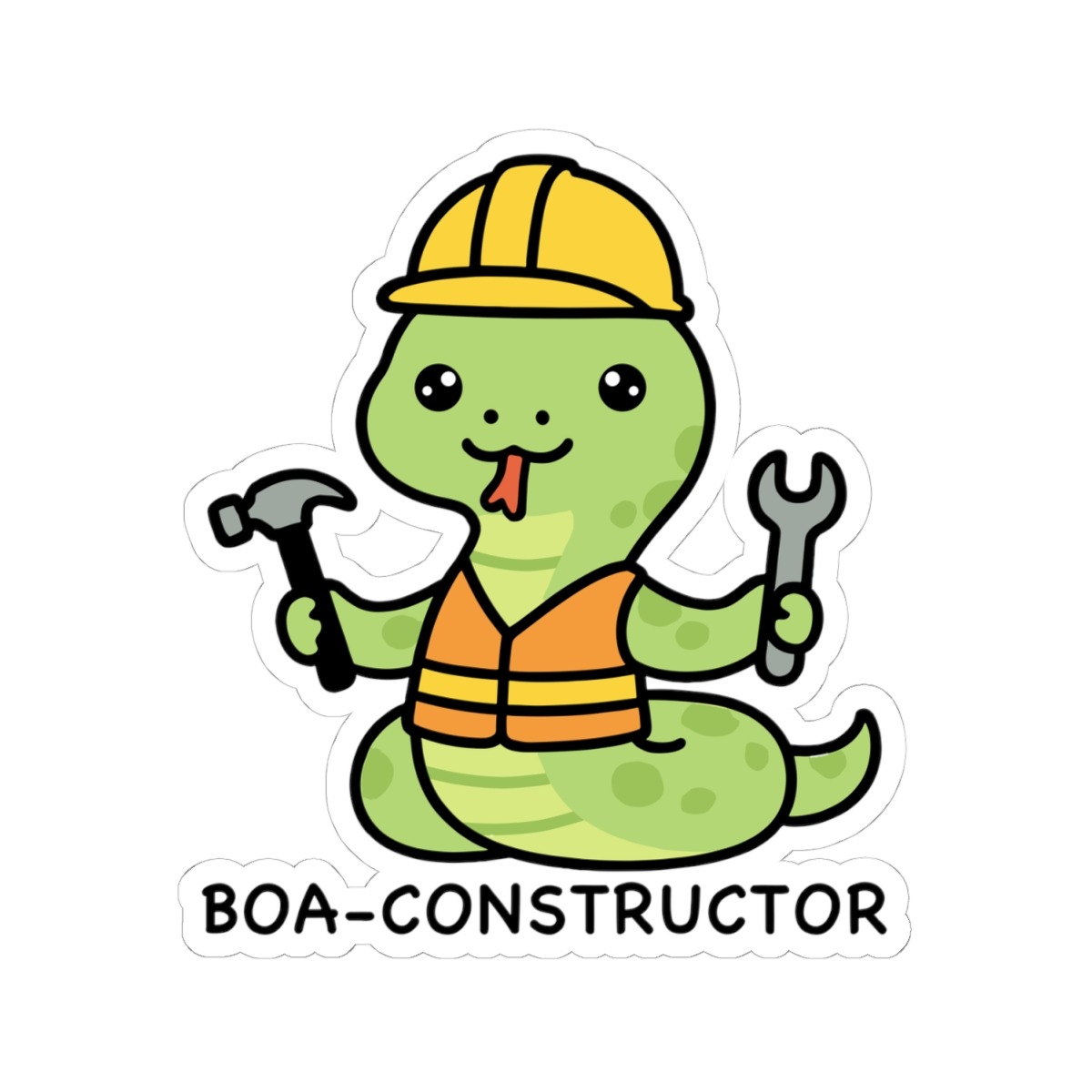 Design appeal: Features a kawaii-style boa snake wearing a bright yellow hard hat, coiled confidently with big sparkling eyes and a cheeky grin, paired with the punny phrase “Boa Constructor” in playful lettering — it’s hilariously adorable and perfectly pun-tastic!