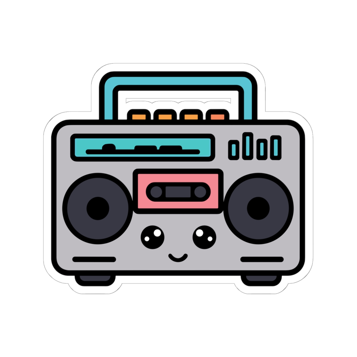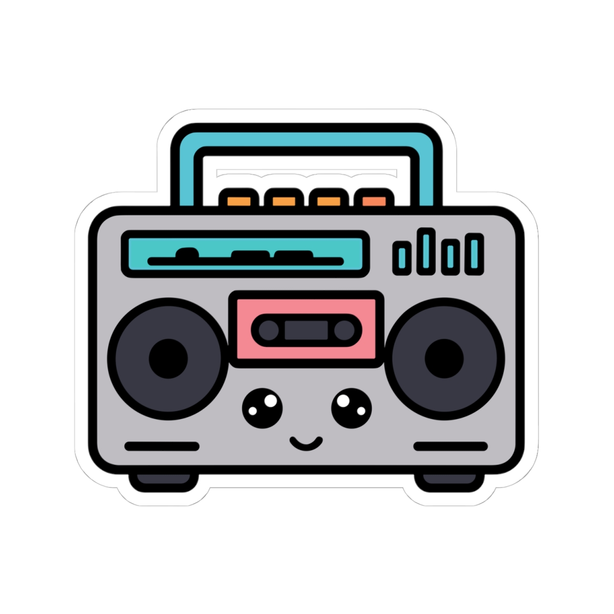 Design appeal: Features a kawaii-style boombox with bright buttons, twin speakers, a cassette deck, big sparkling eyes, and a cheeky grin, radiating pure 80s fun and music-loving energy.