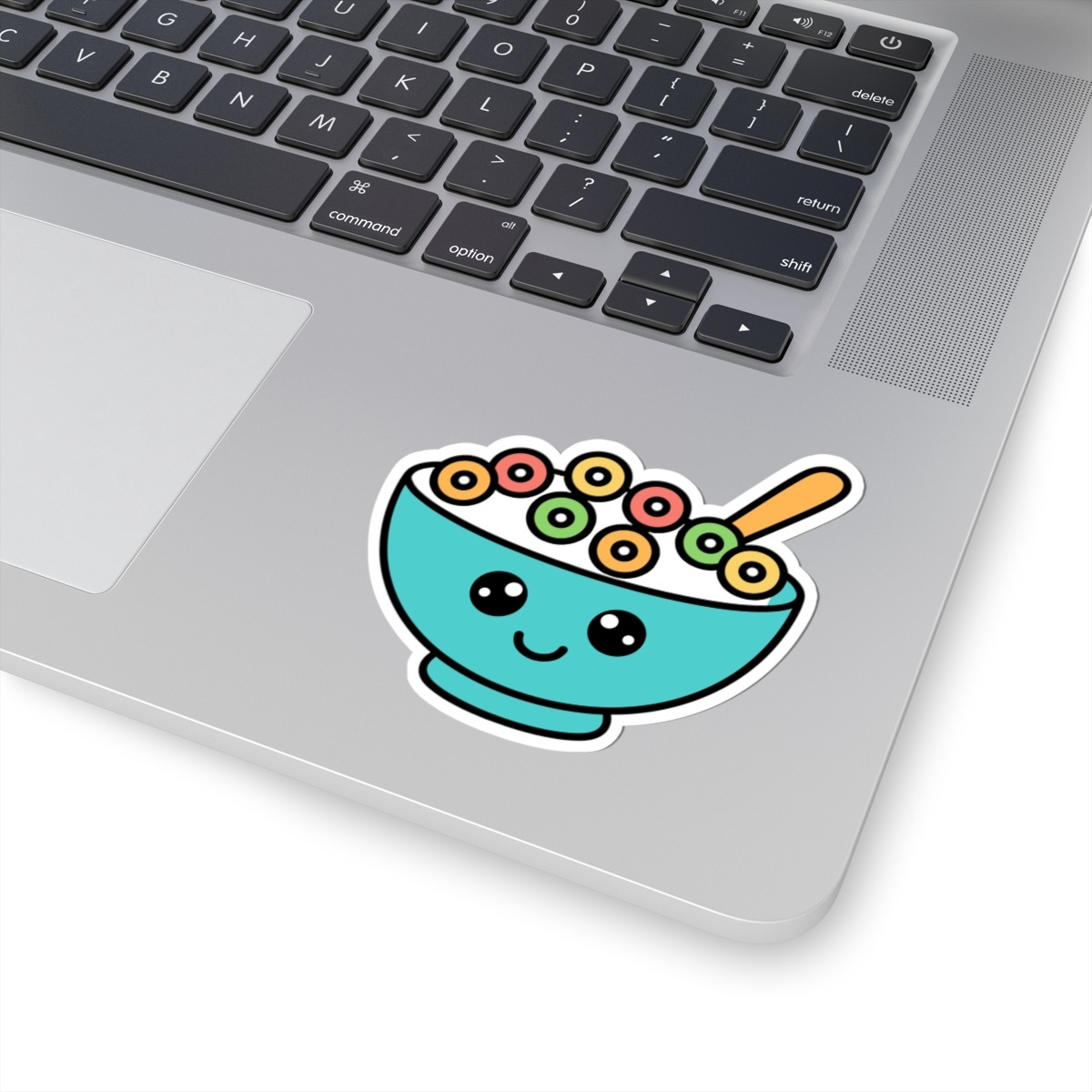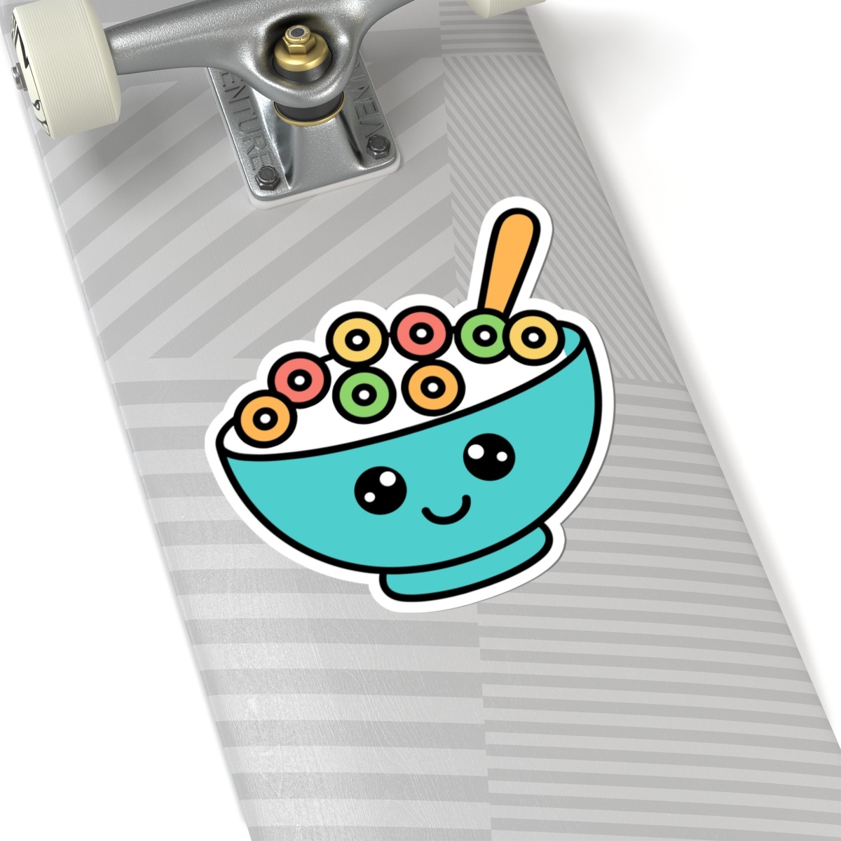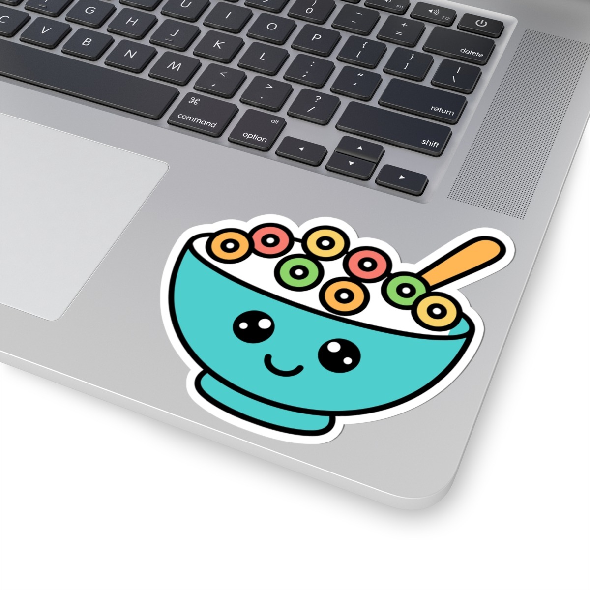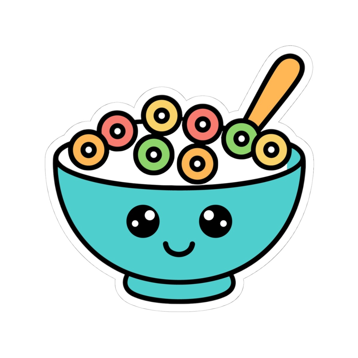 Design appeal: Features a kawaii-style bowl brimming with rainbow-colored cereal loops, a spoon peeking out, big sparkling eyes, and a joyful grin, radiating pure breakfast cuteness and playful personality.