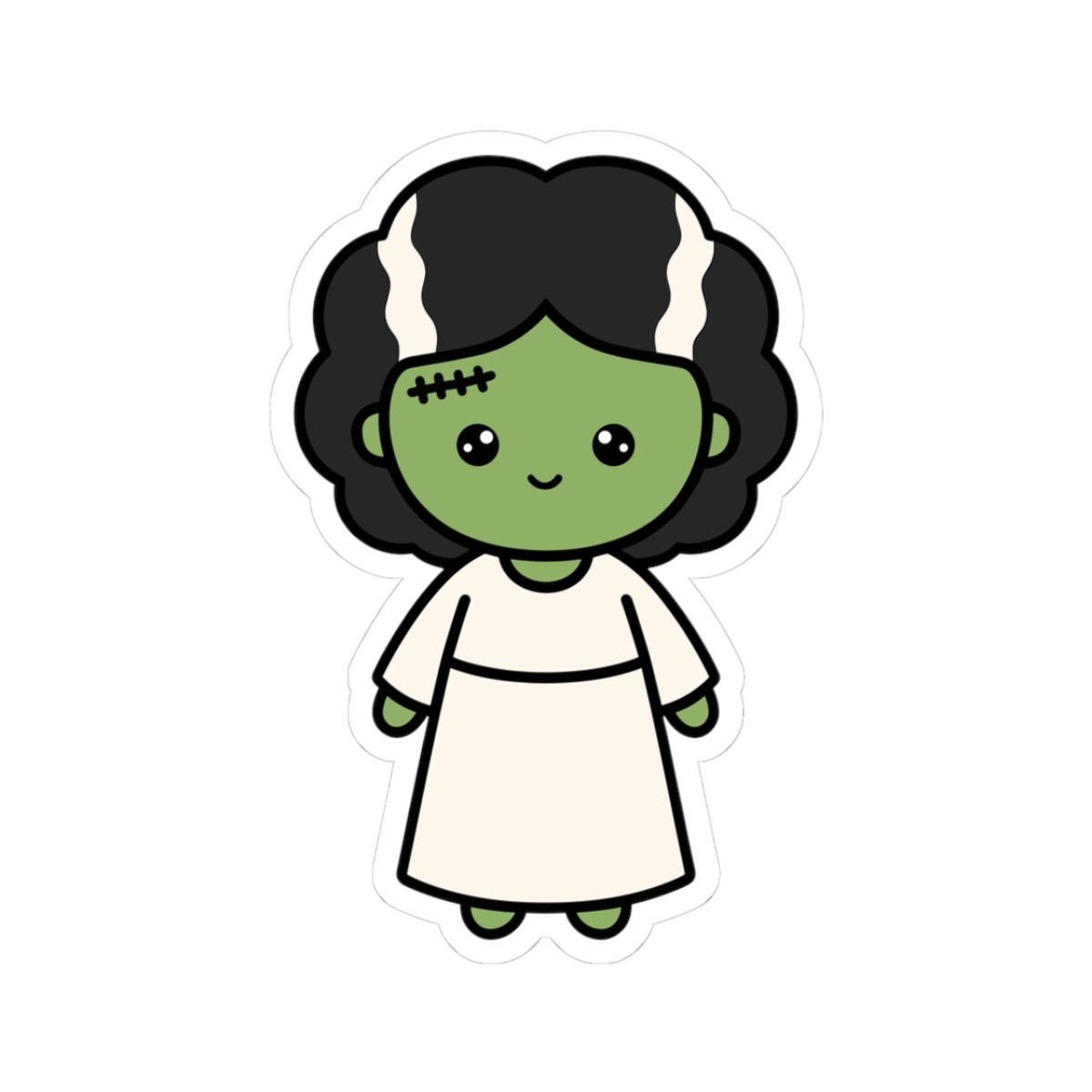 Design appeal: Features a kawaii-style Frankenstein Girl with green skin, big sparkling eyes, cute stitches, a shock of black hair with white streaks, and a sweet smile, radiating pure spooky charm and fun monster energy.