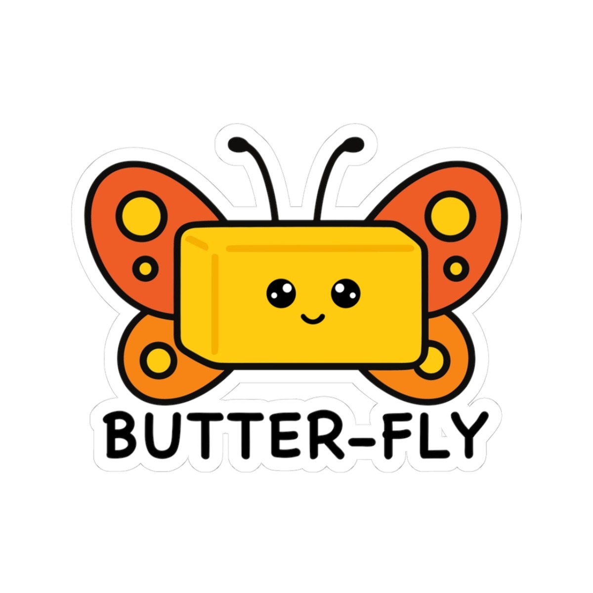 Design appeal: Features a kawaii-style stick of butter sprouting colorful butterfly wings in shades of yellow and red, with big sparkling eyes and a joyful grin, paired with the punny phrase “Butter Fly” in playful lettering — it’s deliciously adorable and hilariously clever!
