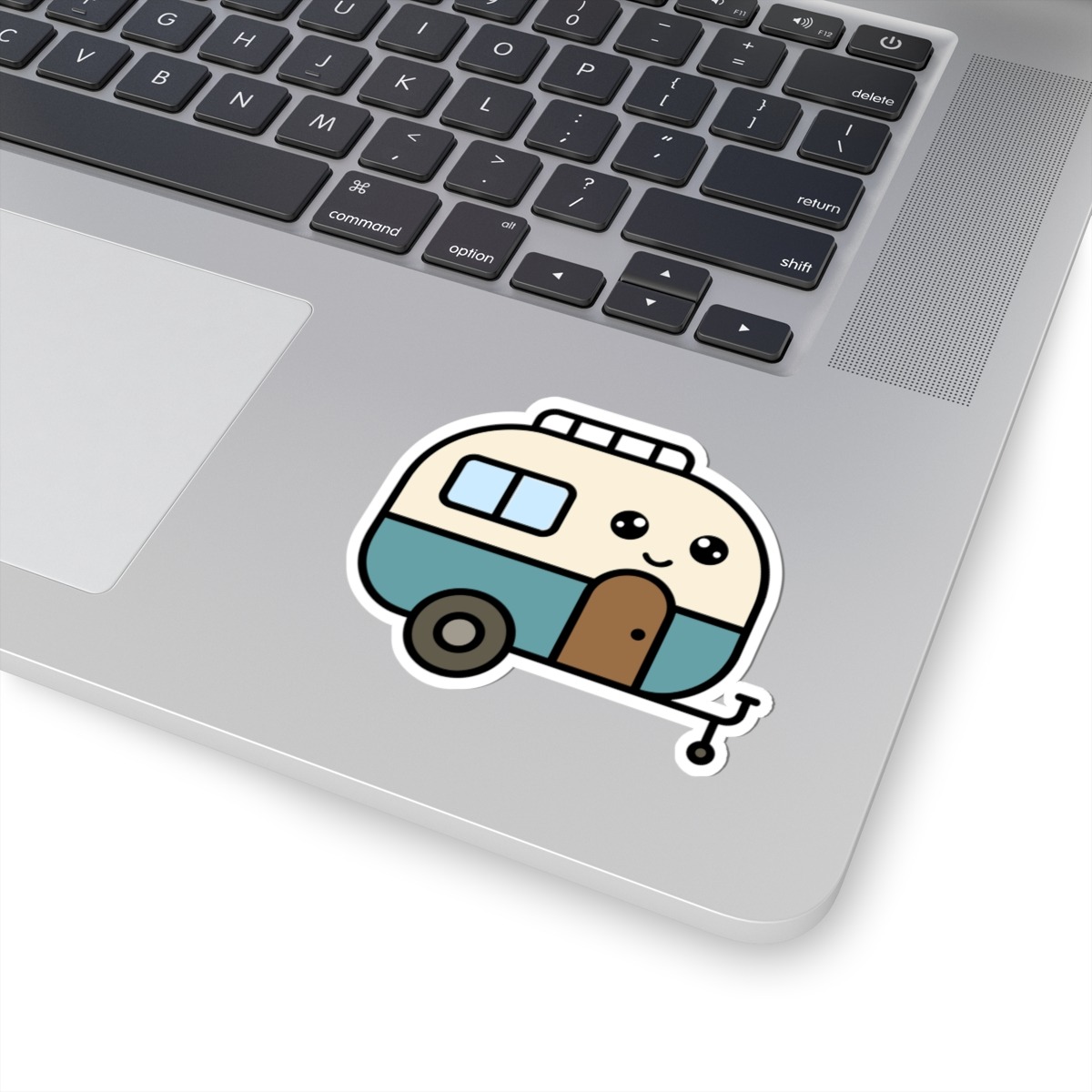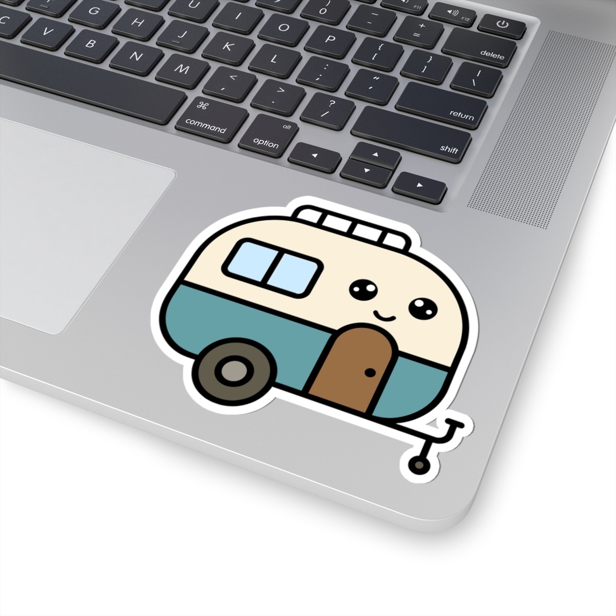 Design appeal: Features a kawaii-style camper with a cozy, retro shape in cheerful colors, tiny wheels, cute windows, big sparkling eyes, and a happy grin, radiating pure road trip cuteness and outdoor adventure vibes.