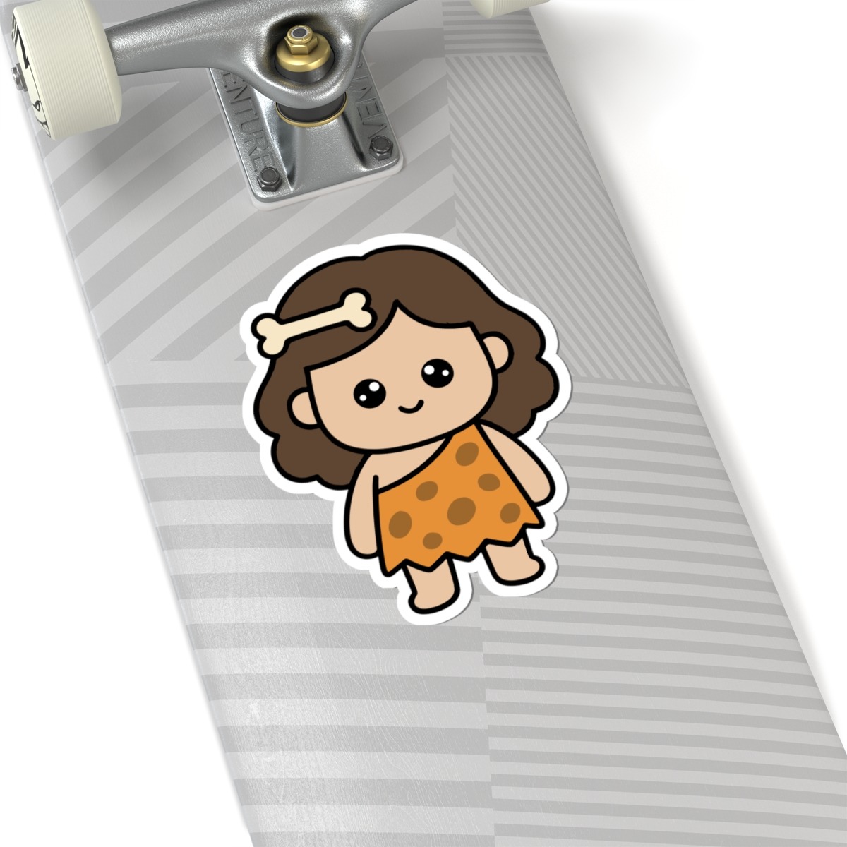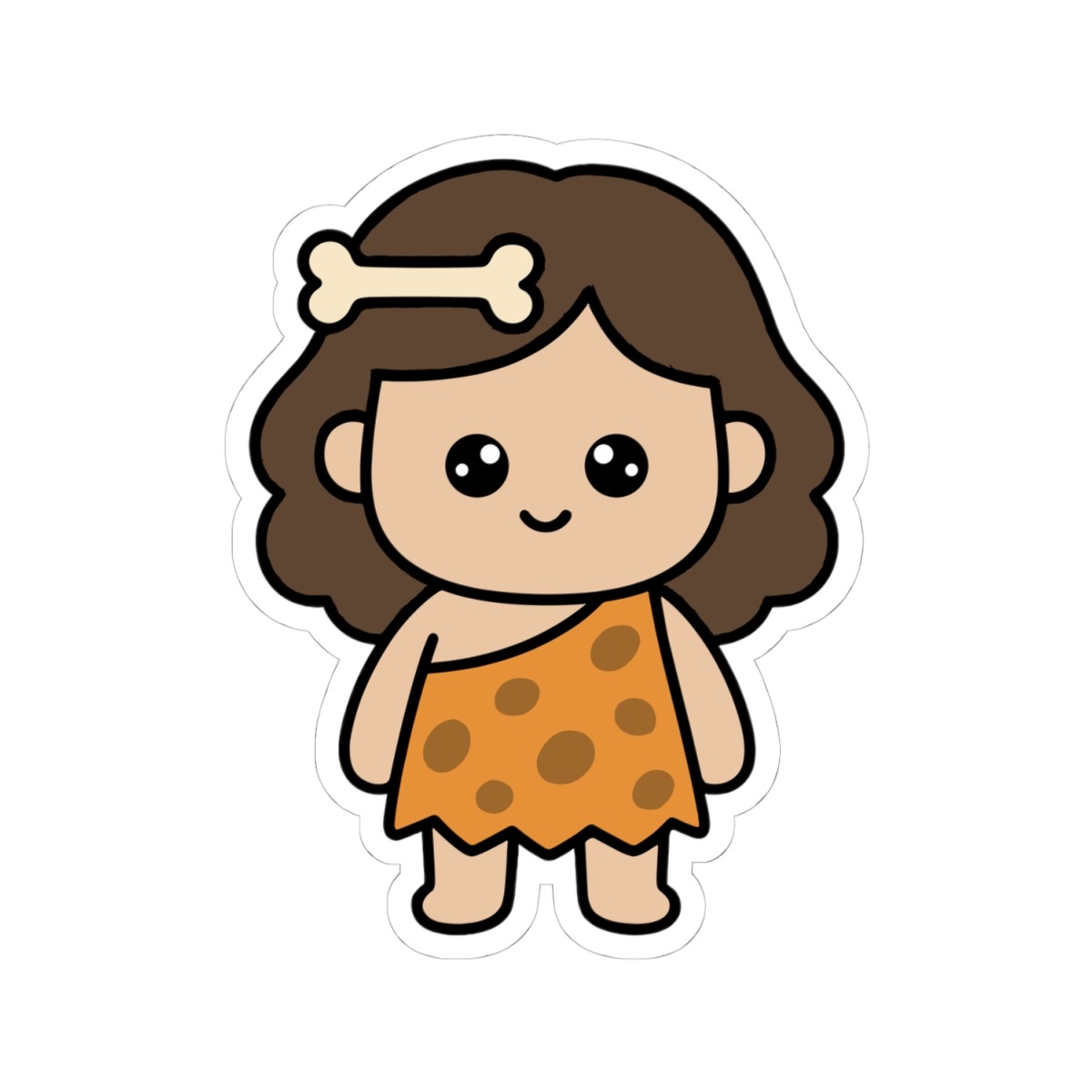 Design appeal: Features a kawaii-style cave woman with wild, flowing hair with a bone accessory, wearing a classic animal-print dress, with big sparkling eyes and a bold, confident grin — radiating pure prehistoric cuteness and unstoppable spirit.