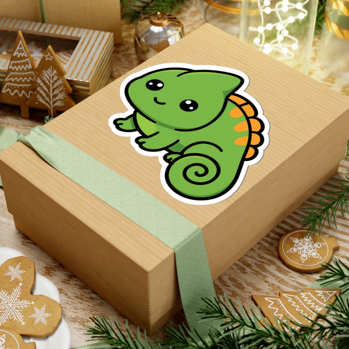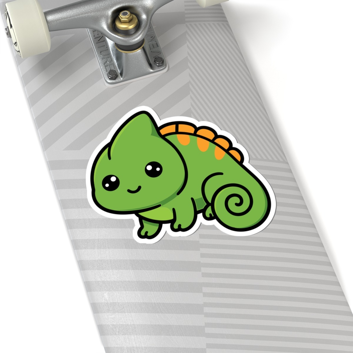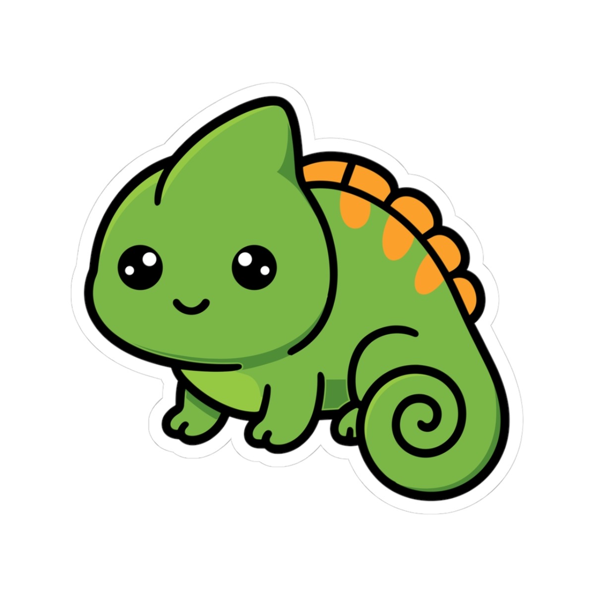 Design appeal: Features a kawaii-style chameleon with a curly tail, big sparkling eyes, bright green scales, and a cheeky grin, radiating pure cuteness and quirky personality.