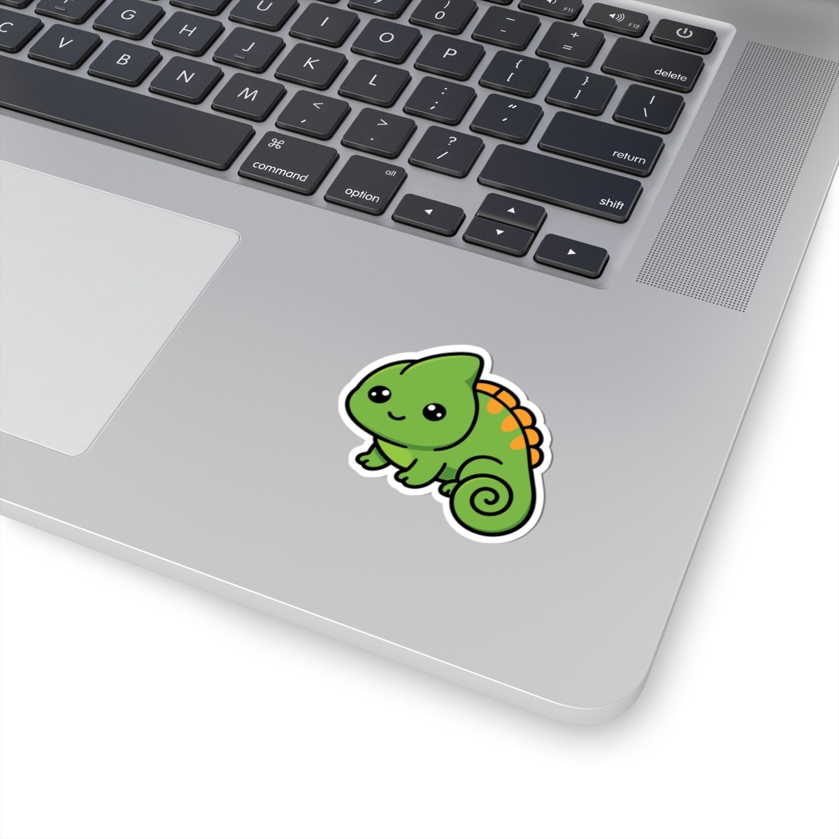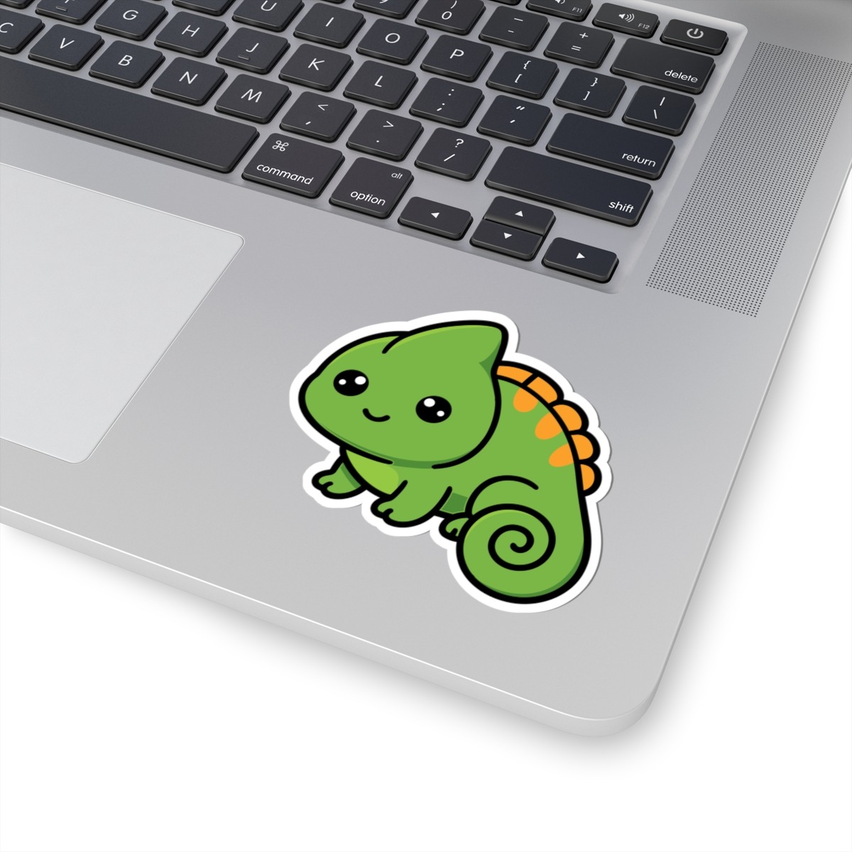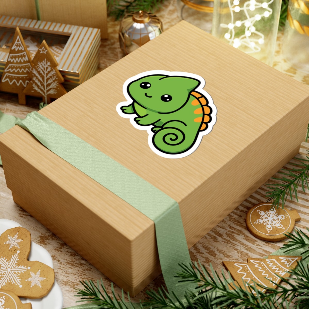 Design appeal: Features a kawaii-style chameleon with a curly tail, big sparkling eyes, bright green scales, and a cheeky grin, radiating pure cuteness and quirky personality.
