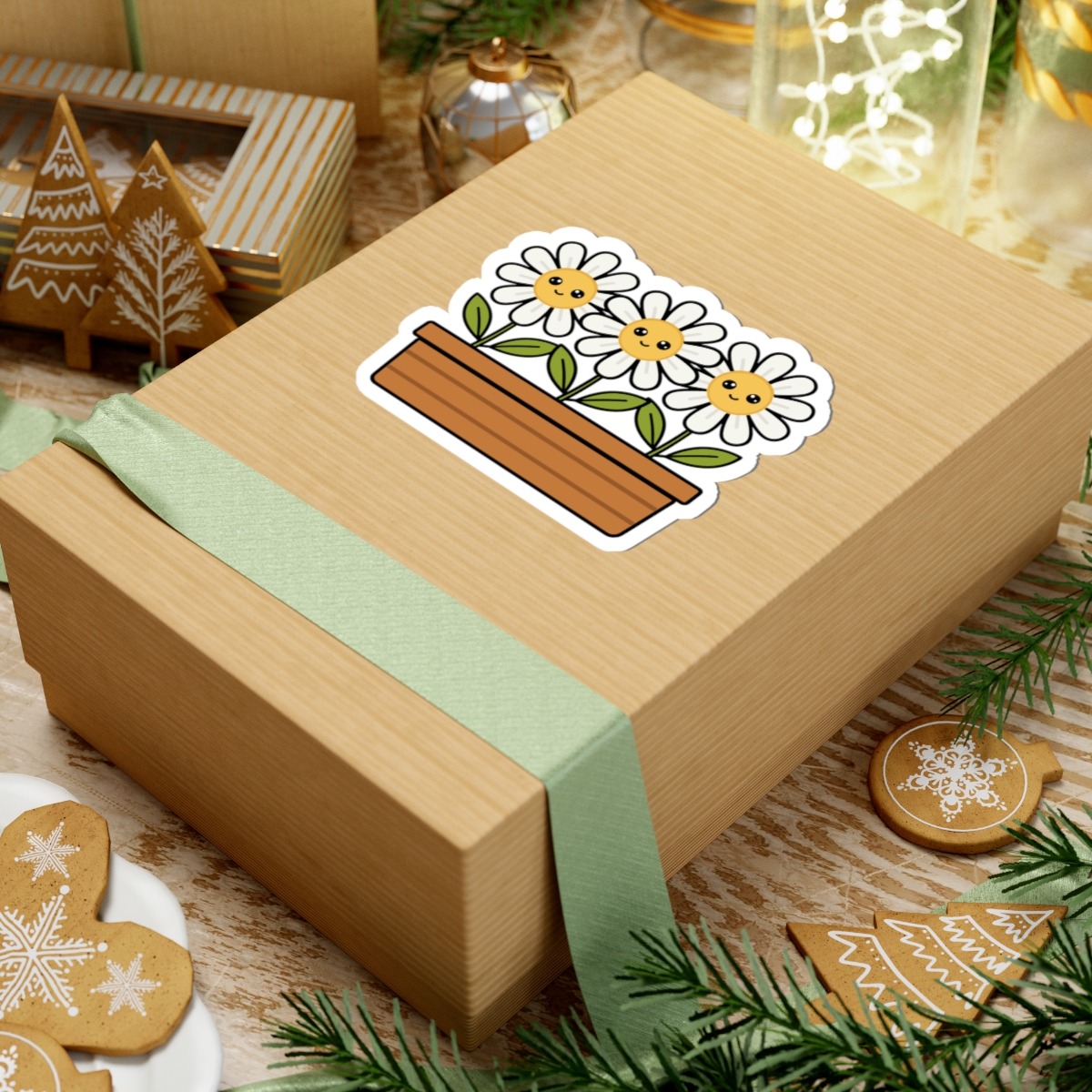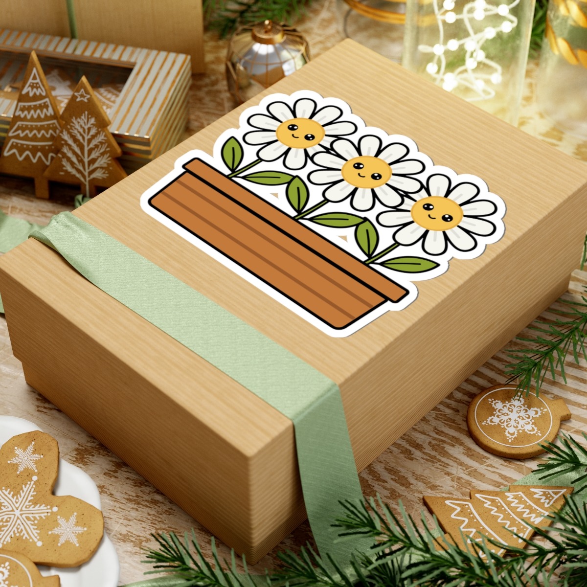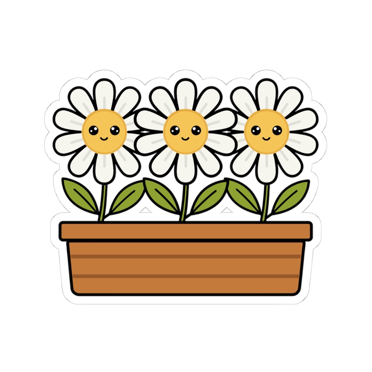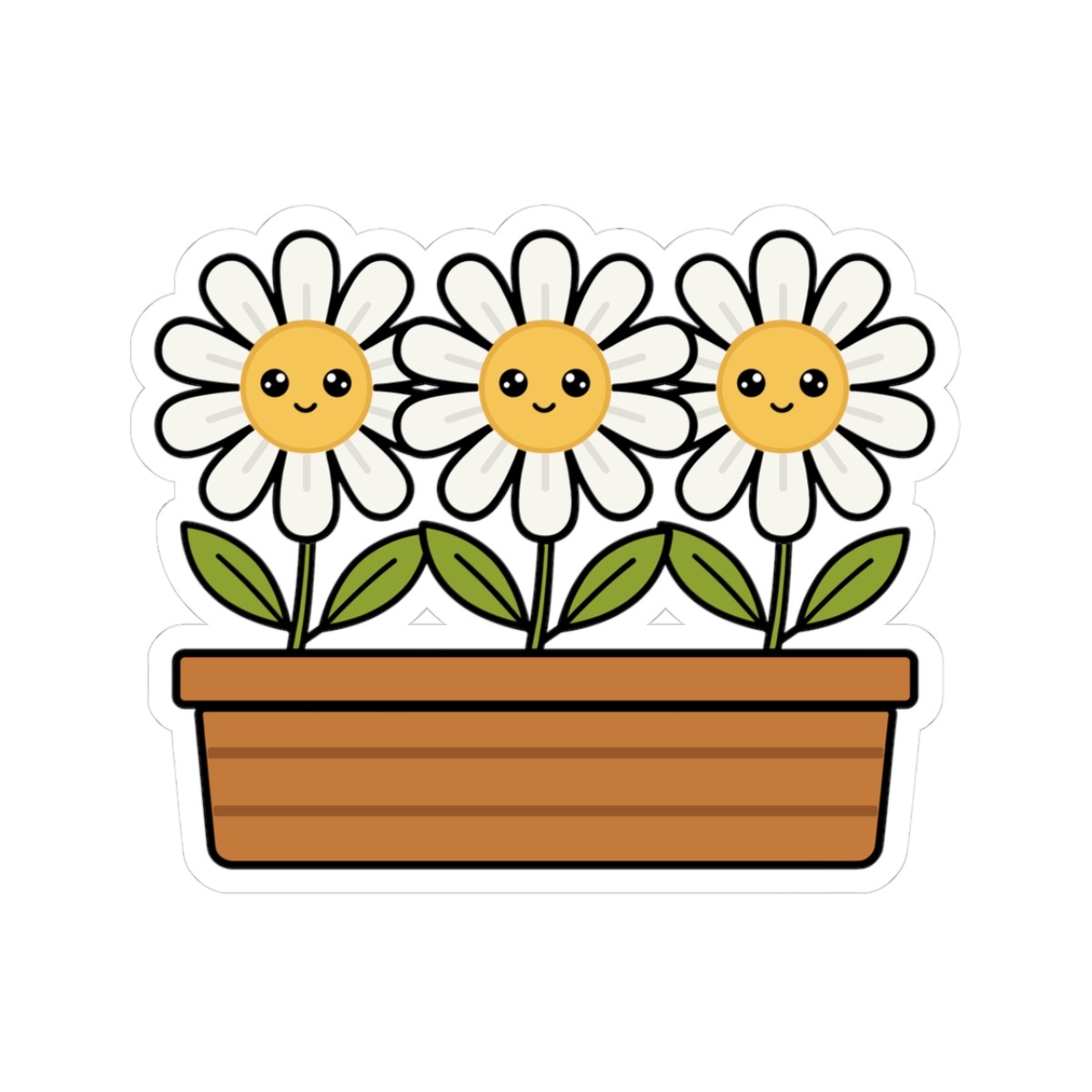 Design appeal: Features a kawaii-style flower box filled with three white daisies, each with soft white petals, bright yellow centers, big sparkling eyes, and gentle smiles, radiating pure happiness and natural beauty.
