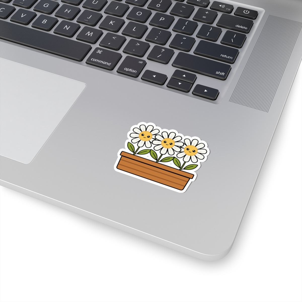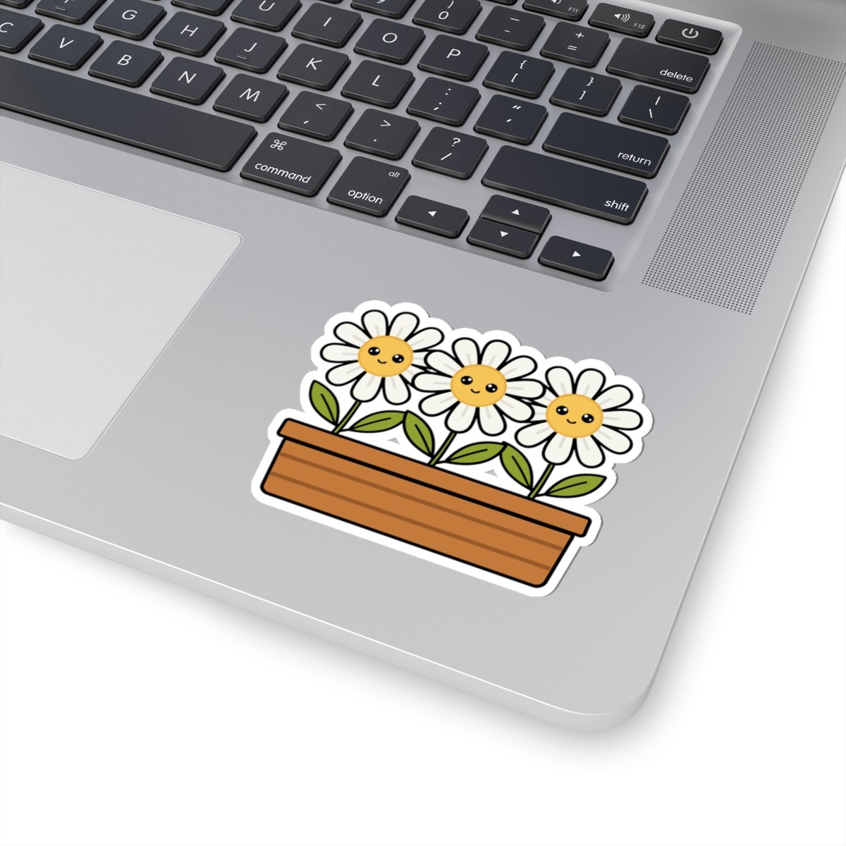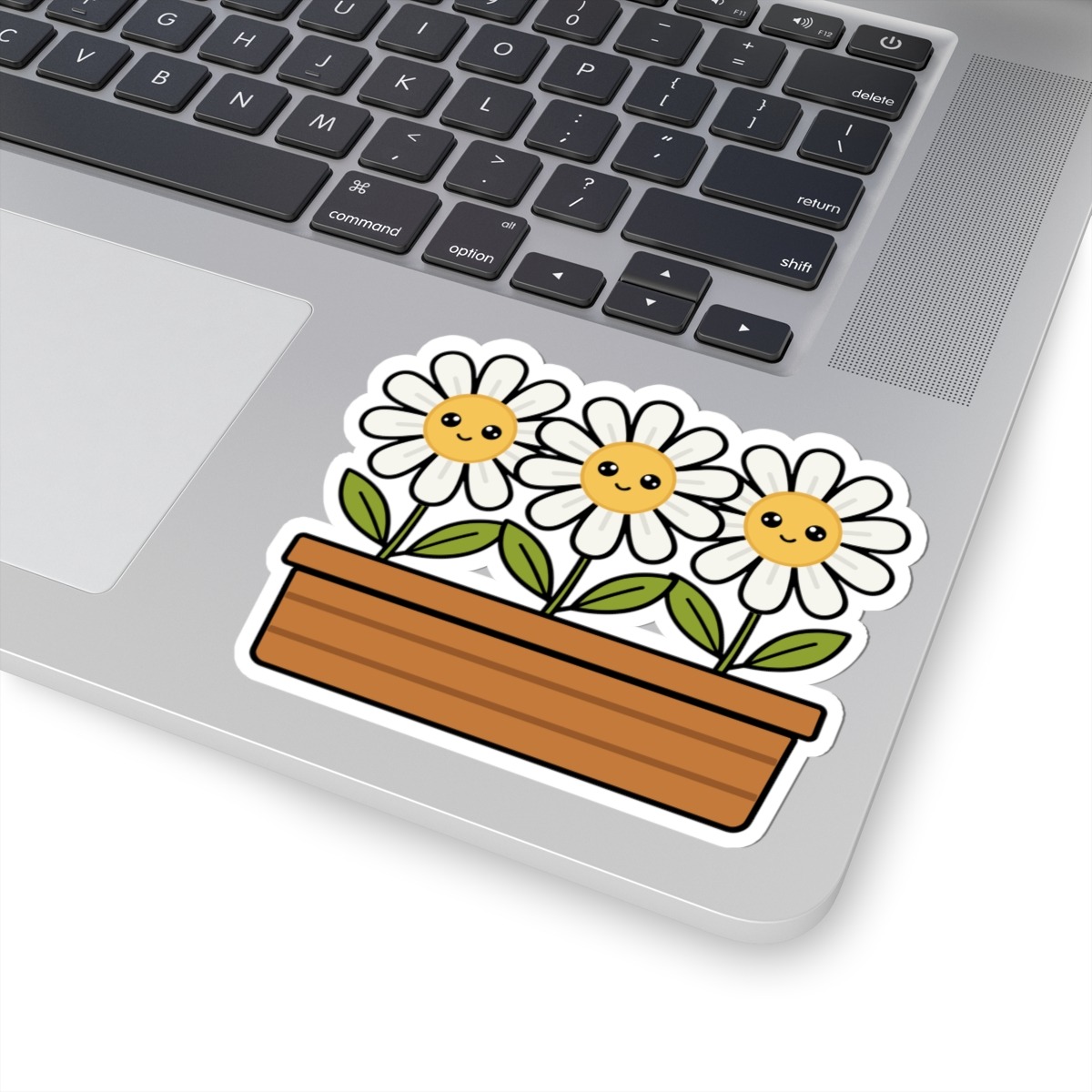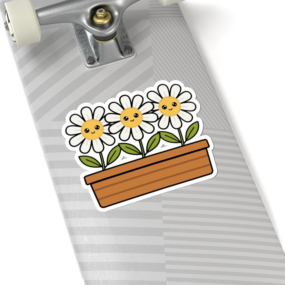Design appeal: Features a kawaii-style flower box filled with three white daisies, each with soft white petals, bright yellow centers, big sparkling eyes, and gentle smiles, radiating pure happiness and natural beauty.