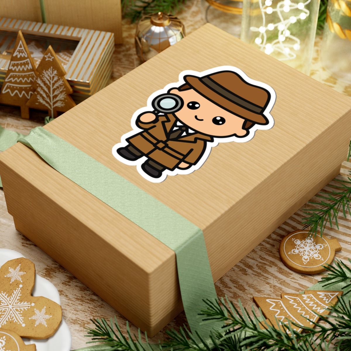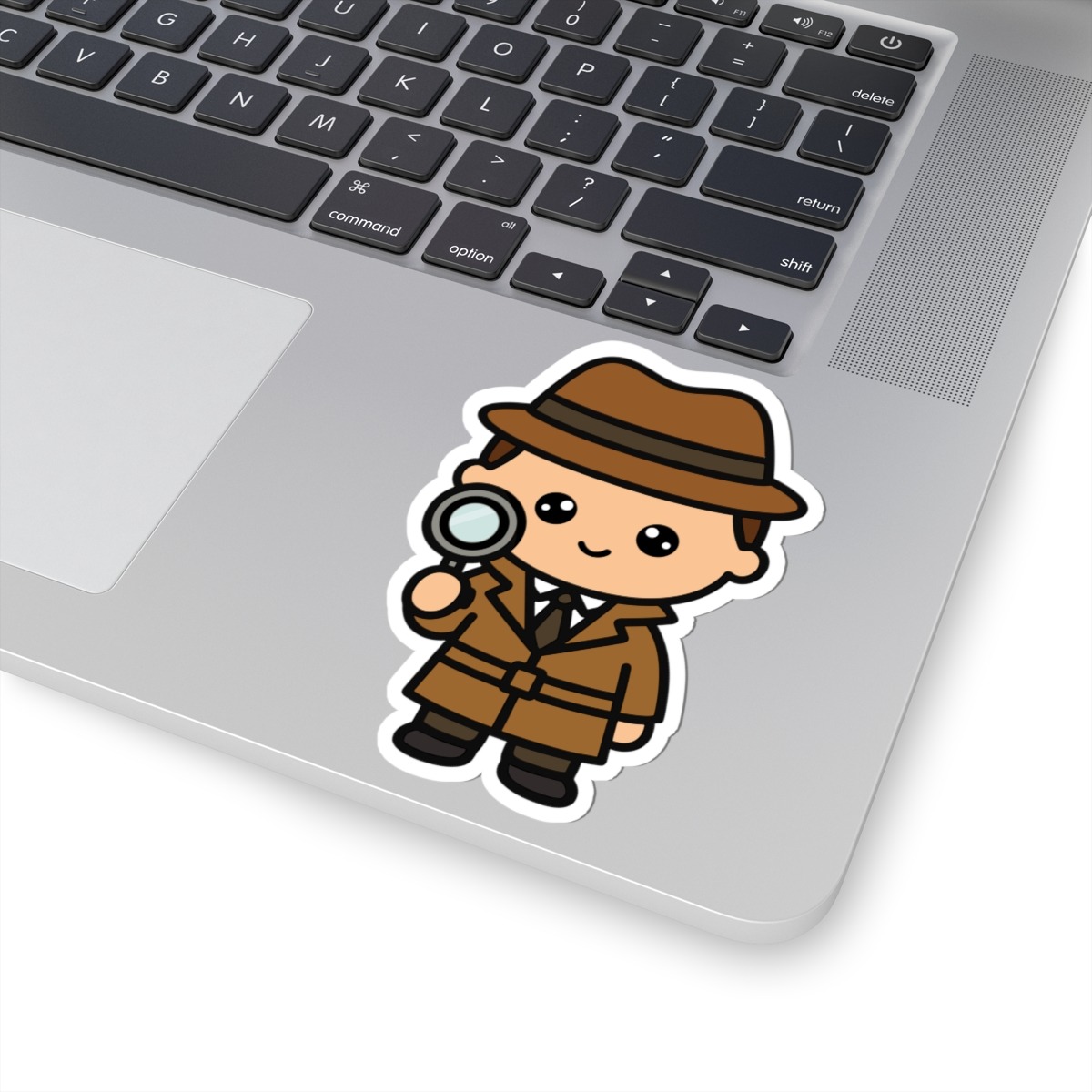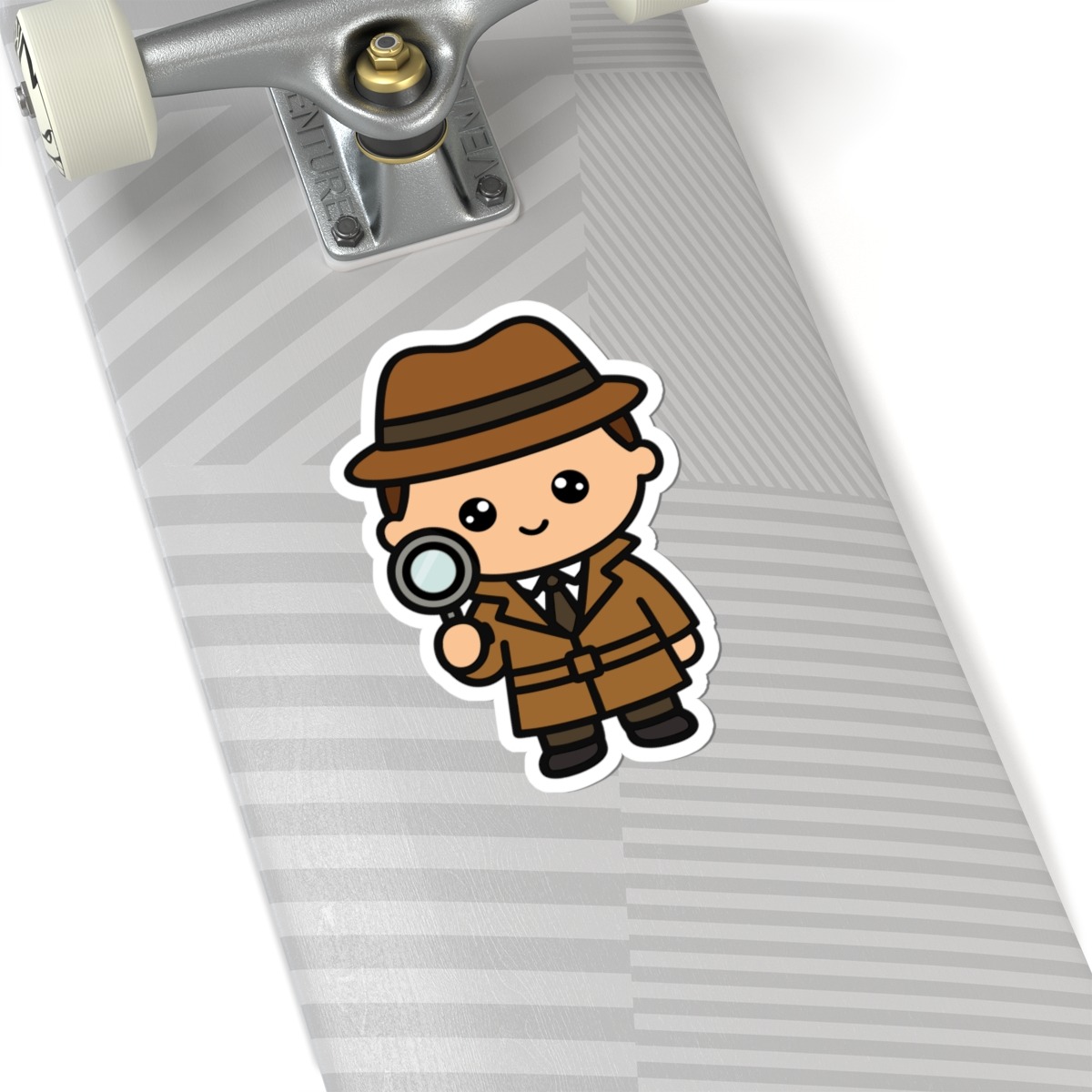 Smart and stylish – Features a kawaii-style detective in a trench coat and wide-brimmed hat, holding a magnifying glass with a curious expression and sleuthy swagger.