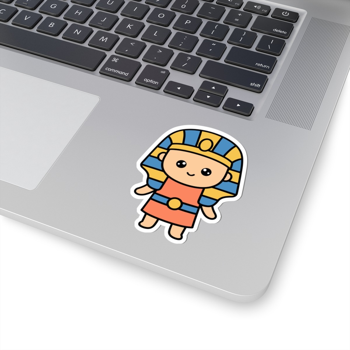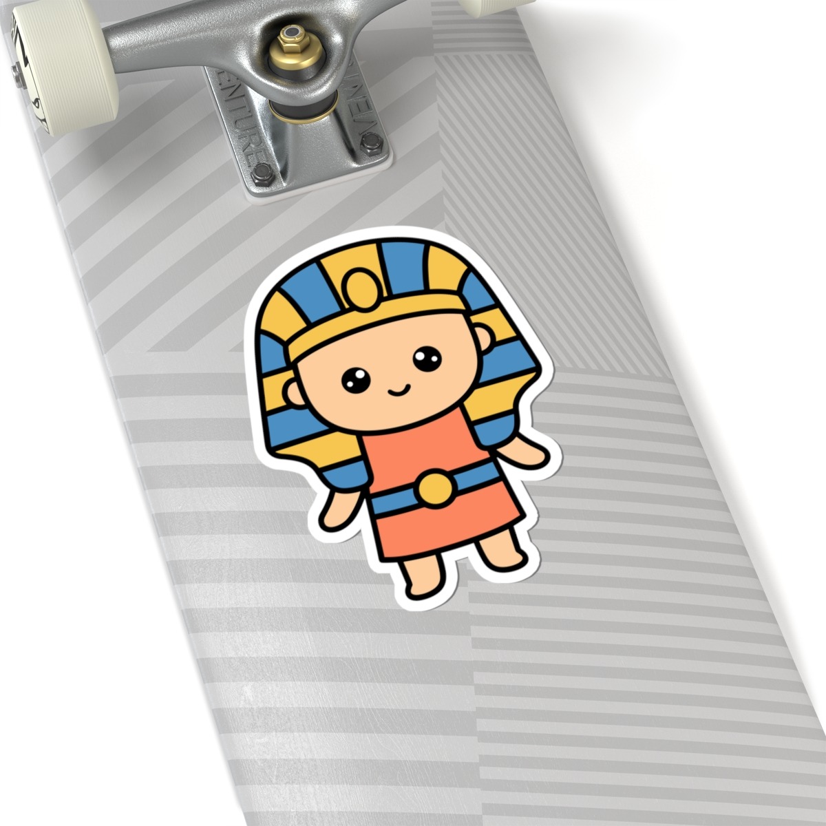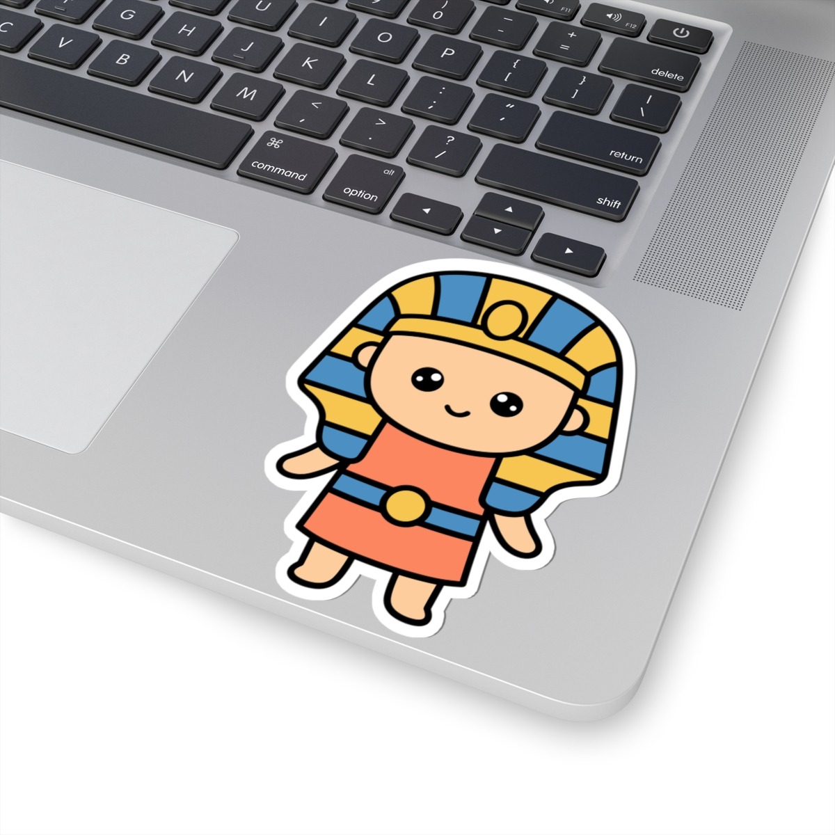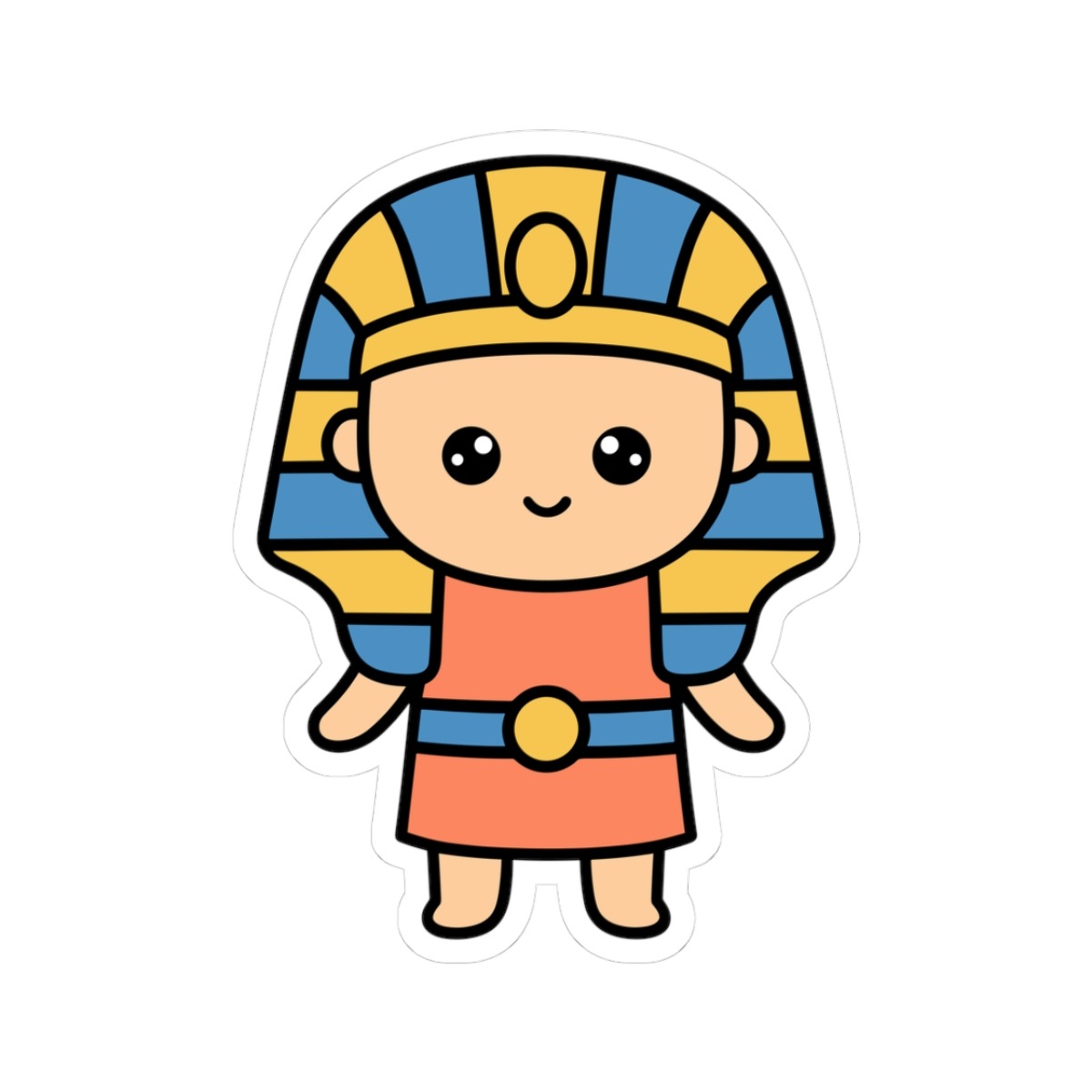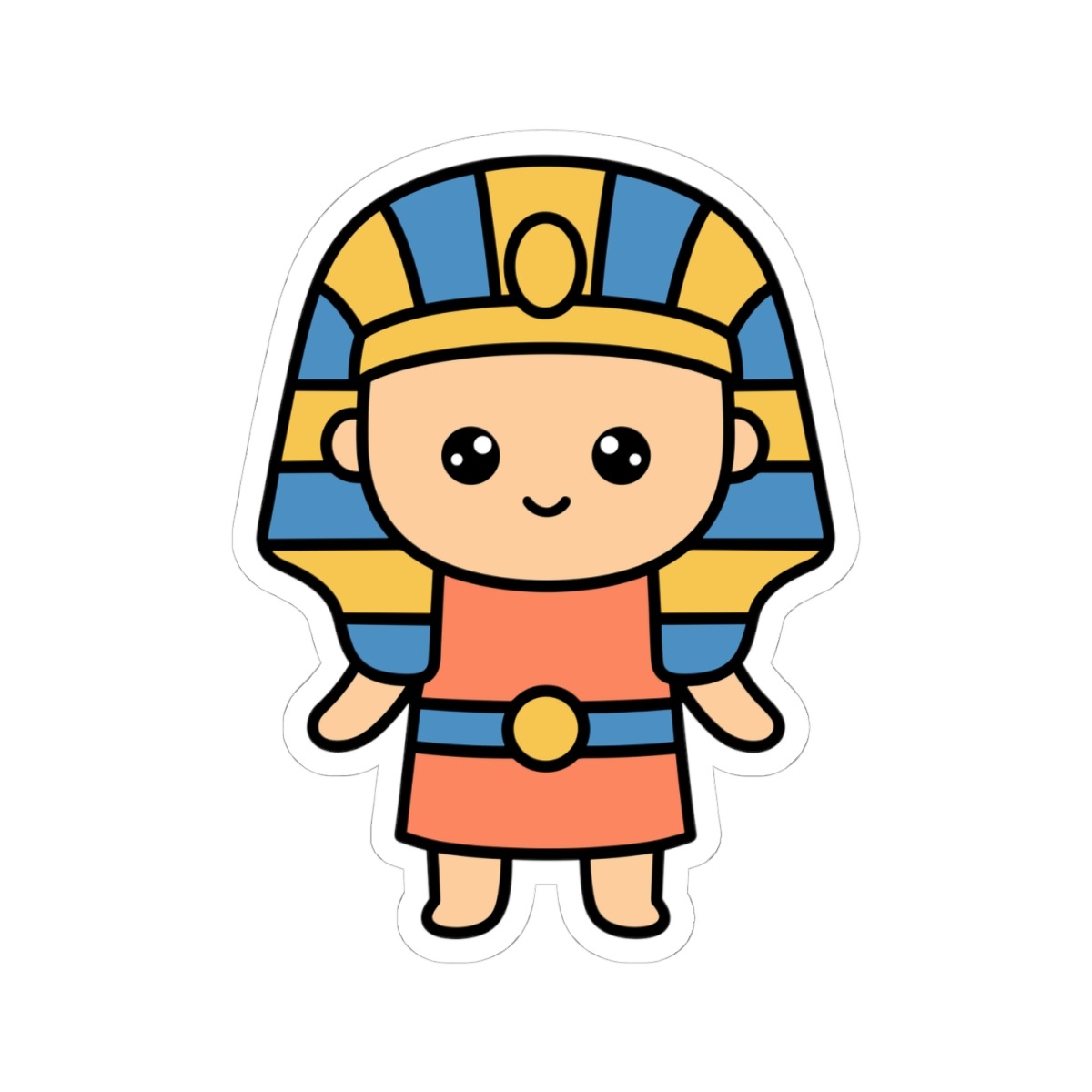Regal and radiant – Features a kawaii-style pharaoh in traditional Egyptian garb with a striped headdress, golden accessories, and a royal smirk that says “I rule.”
