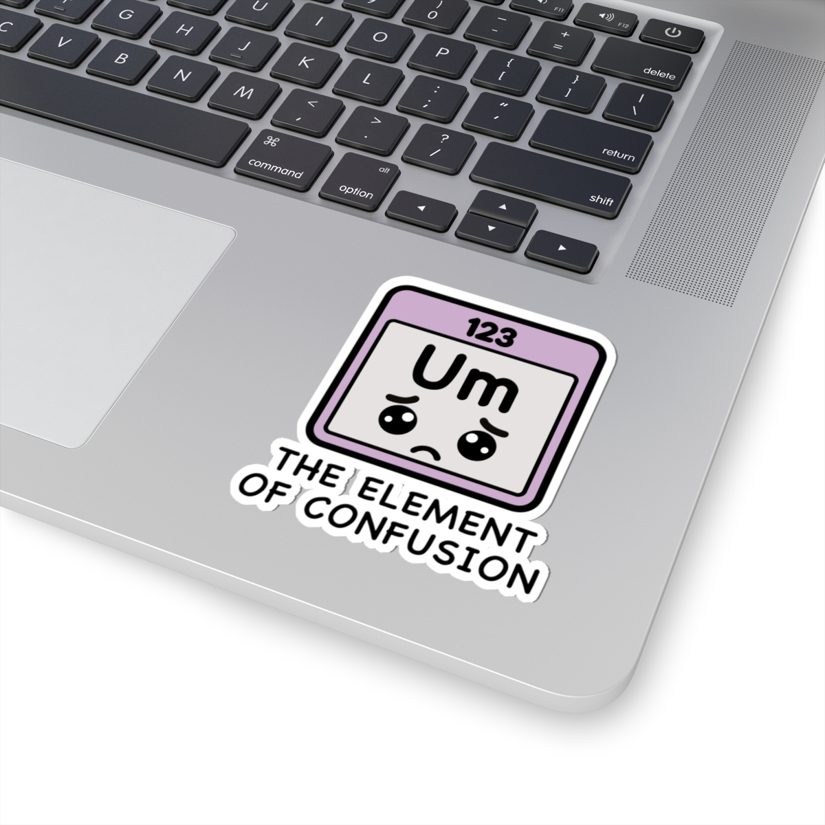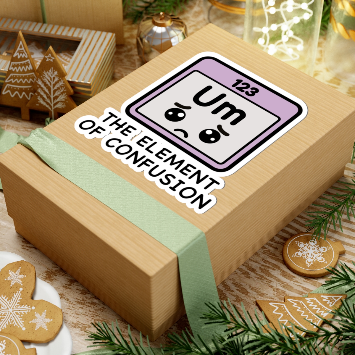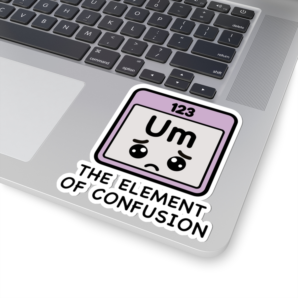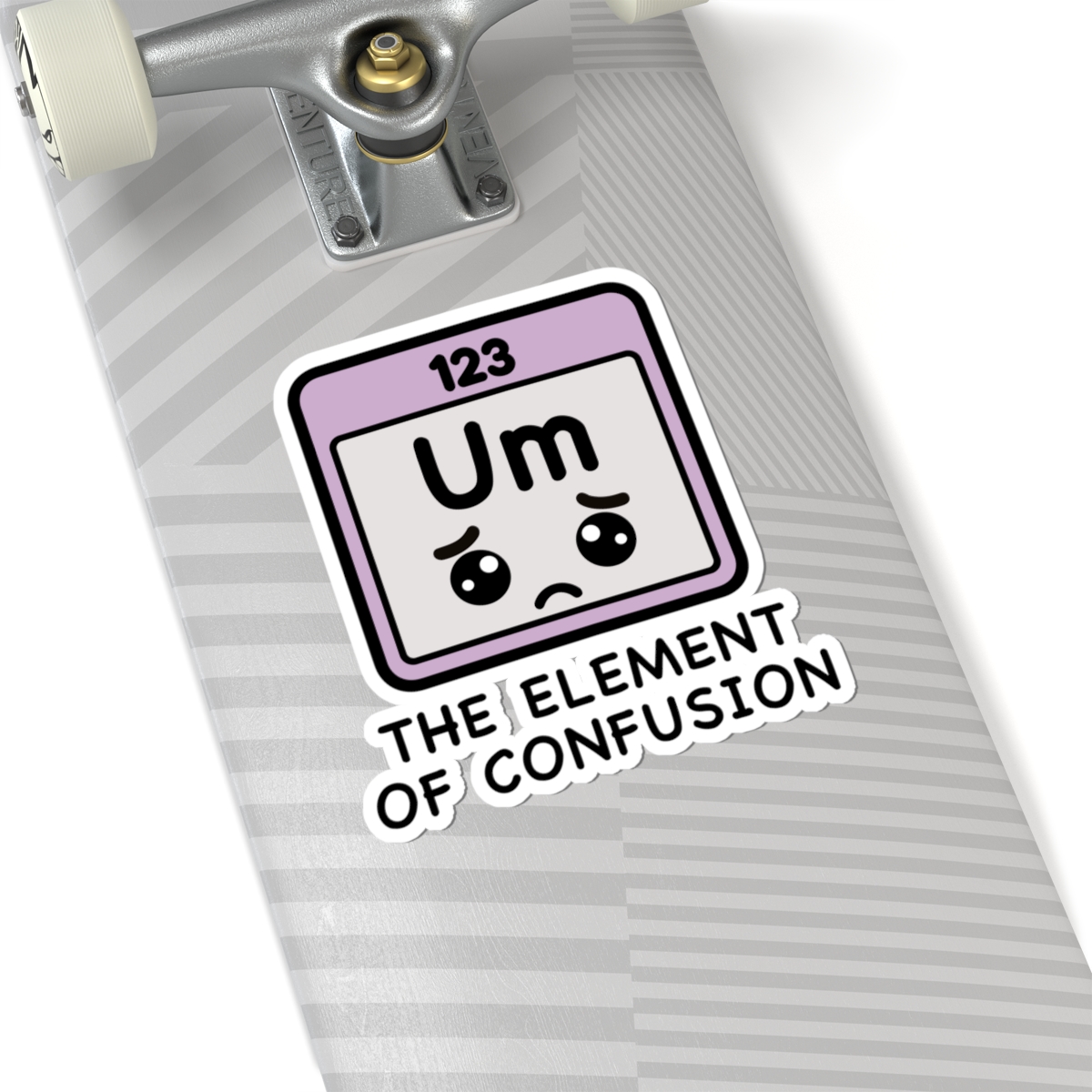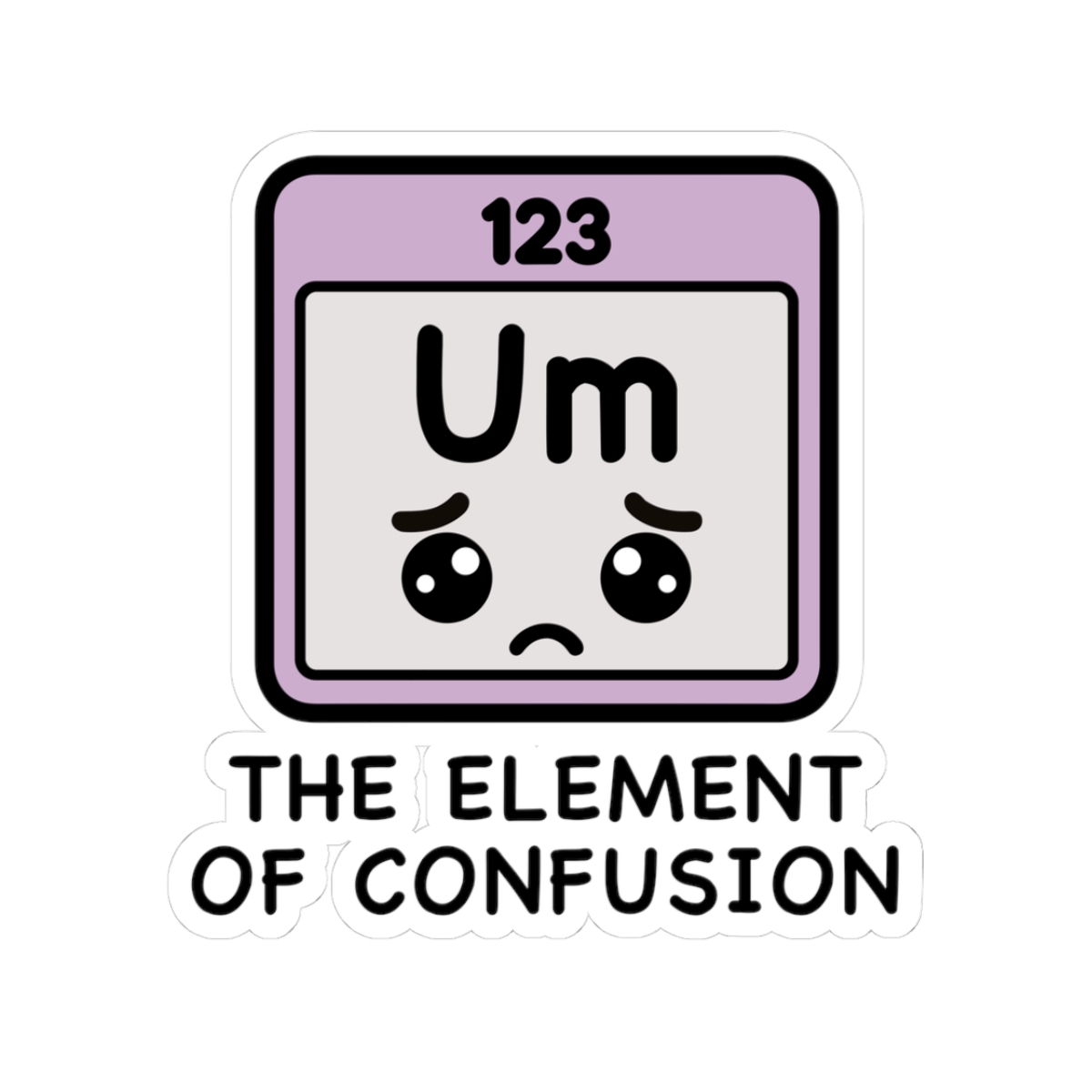 Scientific and scrambled – Features a kawaii-style periodic table square with the letters “Um,” a dazed expression, and enough uncertainty to fuel a whole semester.