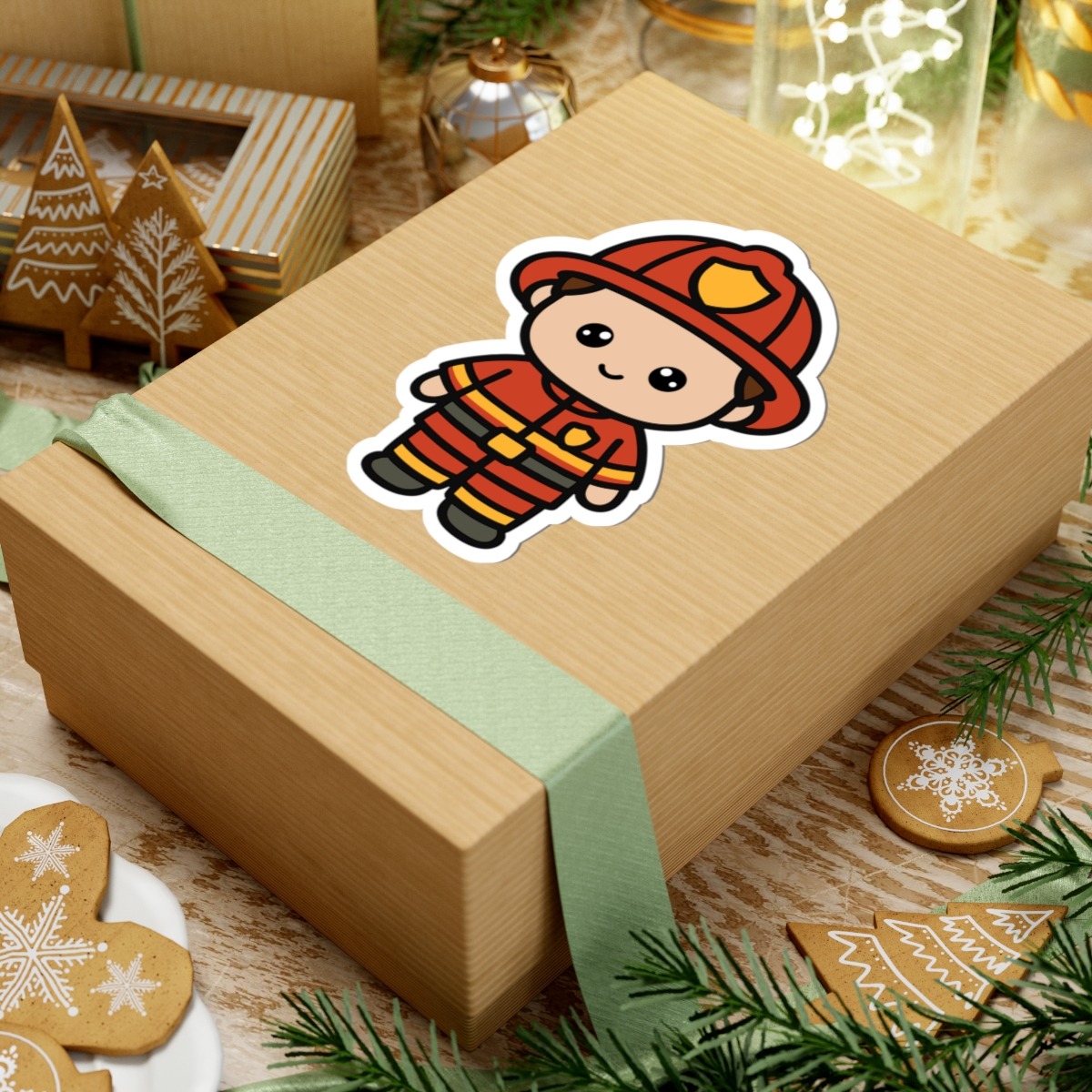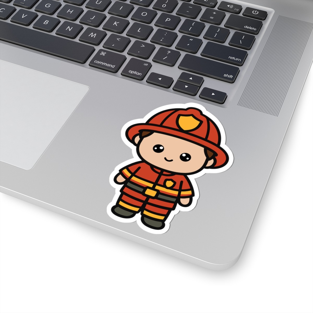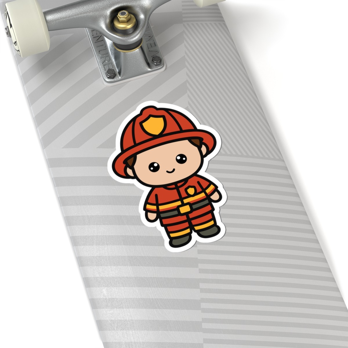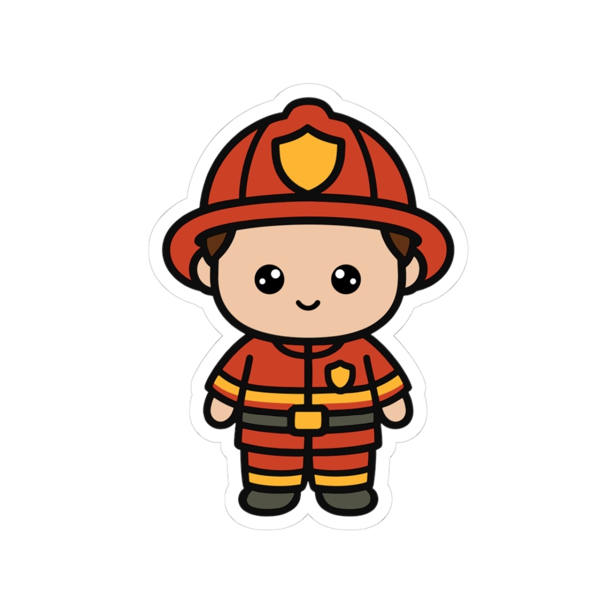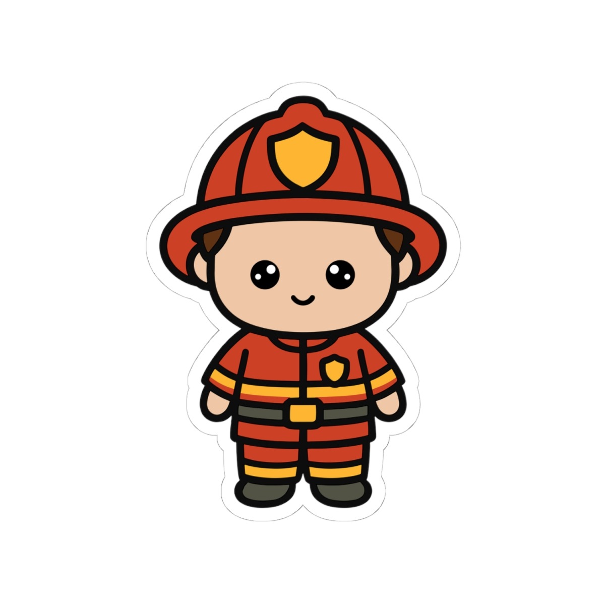 Courageous and cute – Features a kawaii-style firefighter in a bright red helmet and uniform, flashing a confident smile.