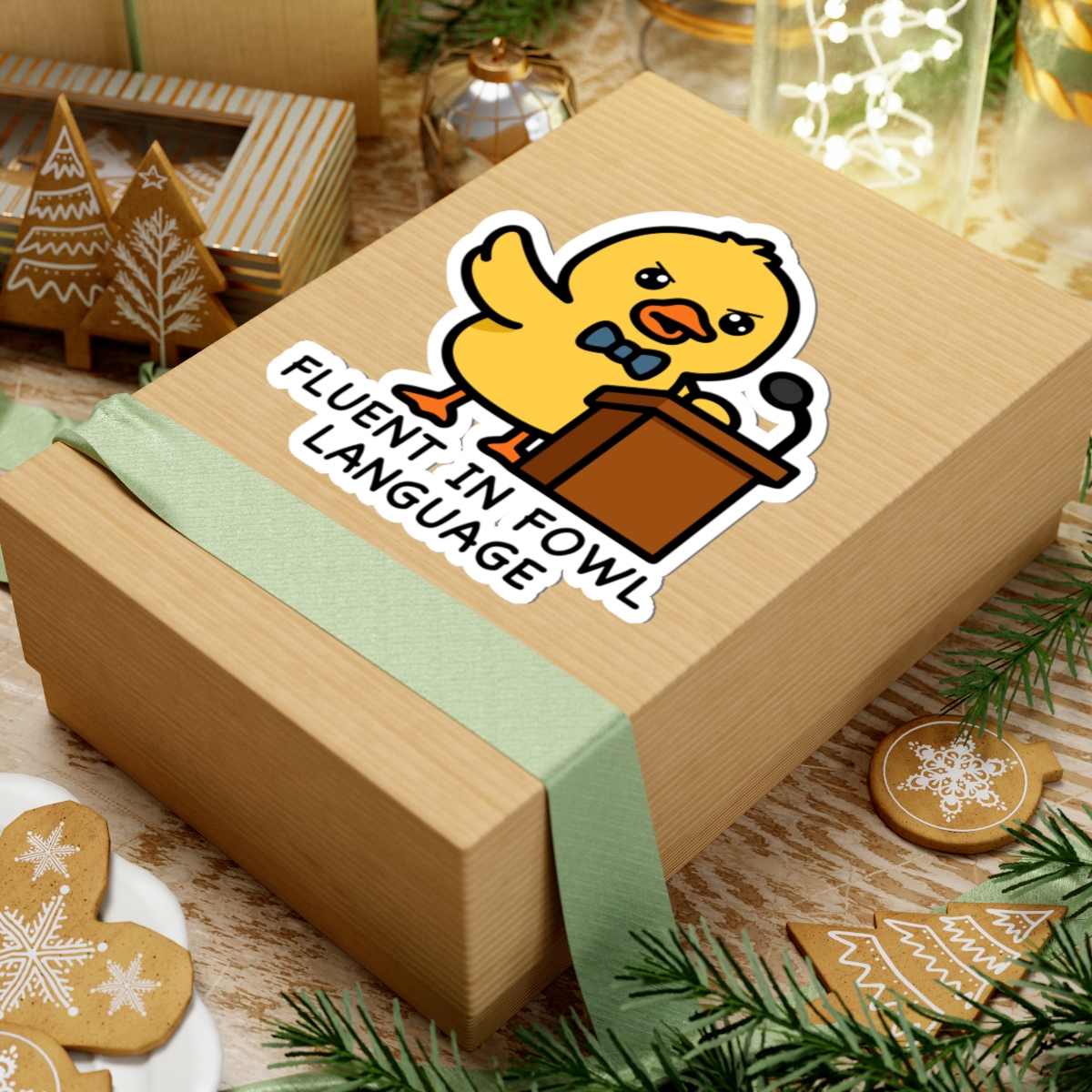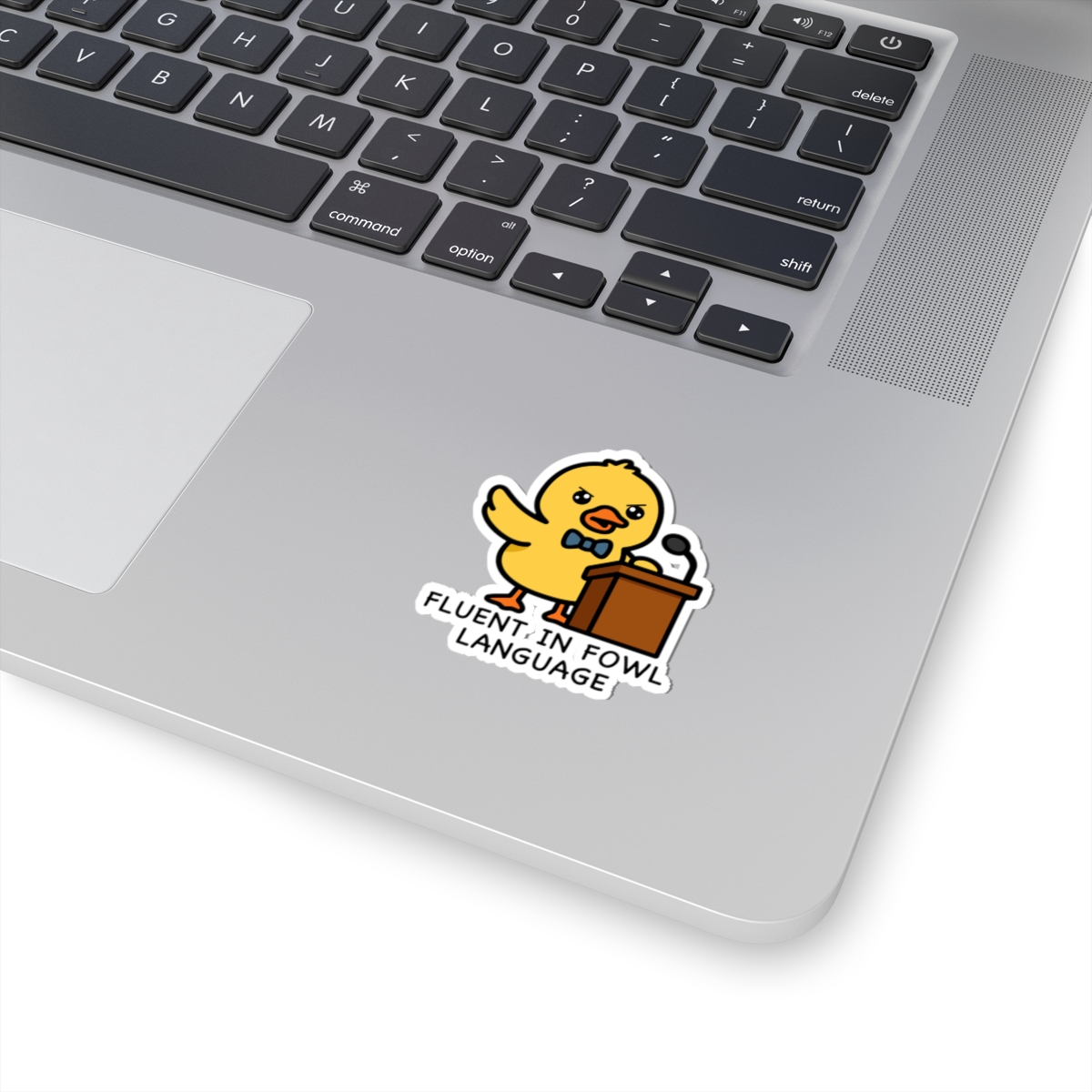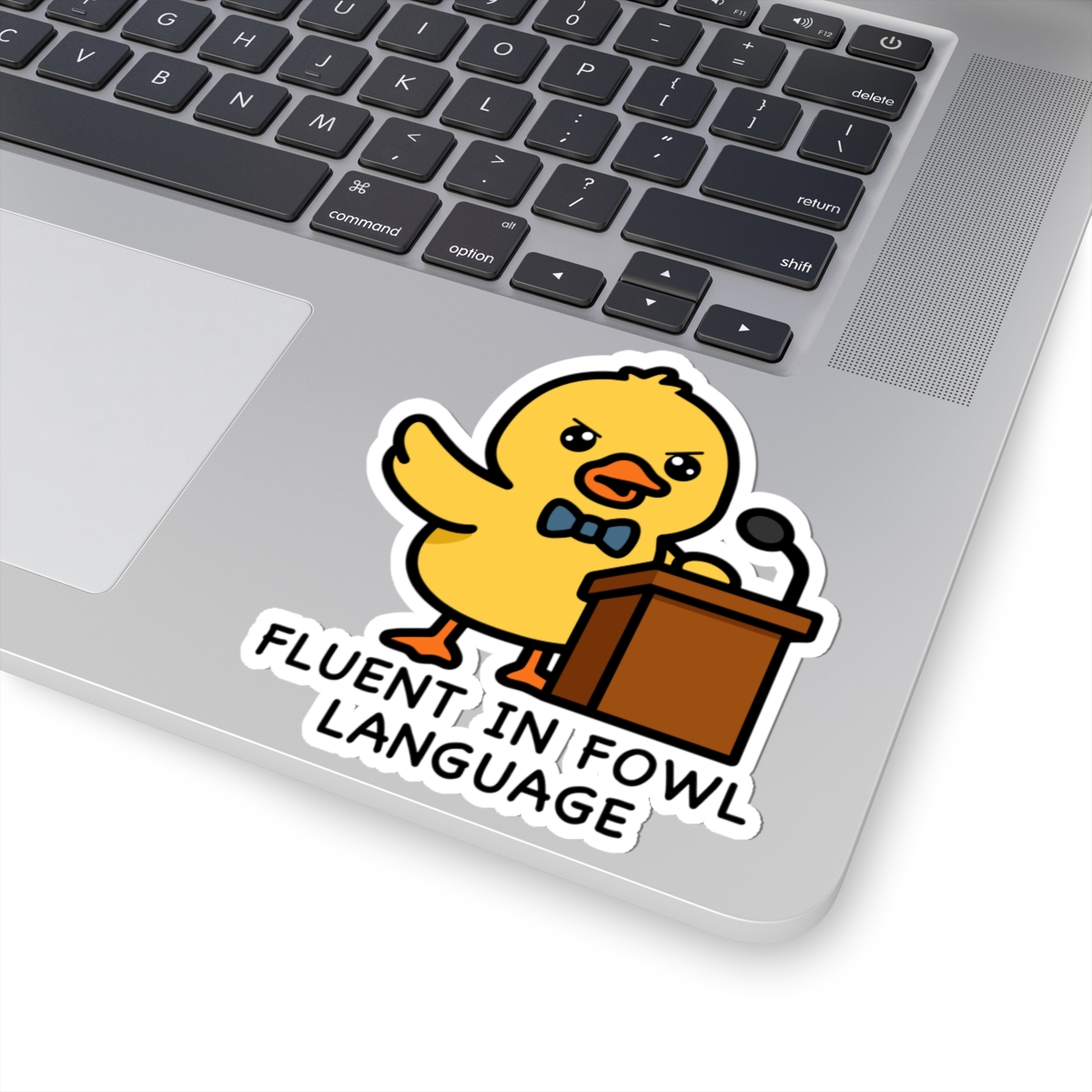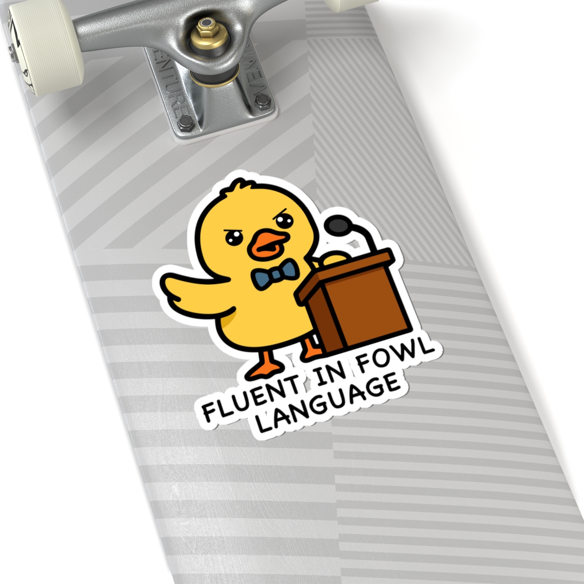 Witty and well-spoken – Features a kawaii-style duck standing at a podium, wings raised mid-speech, with confident eyes and a whole lot to say—mostly in quacks.