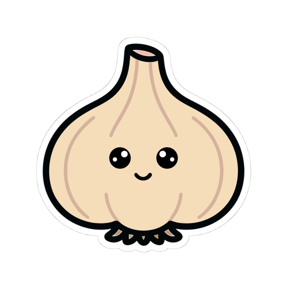 Design appeal: Features a kawaii-style garlic clove with soft layers, a pointed tip, big sparkling eyes, rosy cheeks, and a cheerful grin, radiating pure kitchen cuteness and tasty charm.