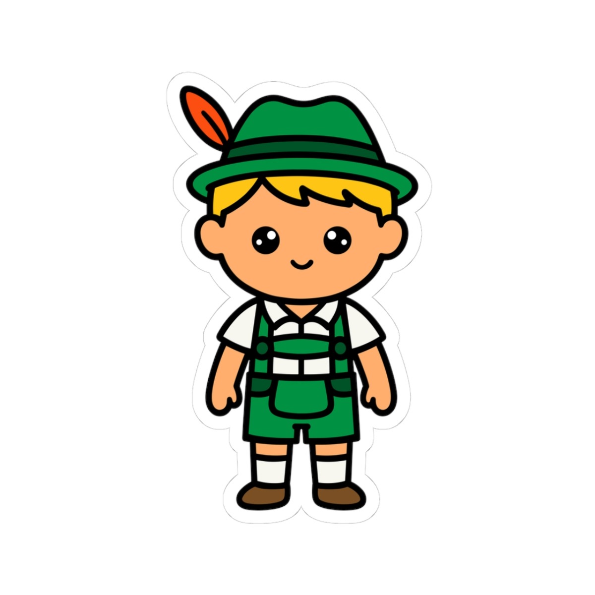 Festive and classic – Features a kawaii-style German boy wearing traditional lederhosen with suspenders, a white shirt, knee-high socks, and a feathered alpine hat—radiating joy and old-world charm.