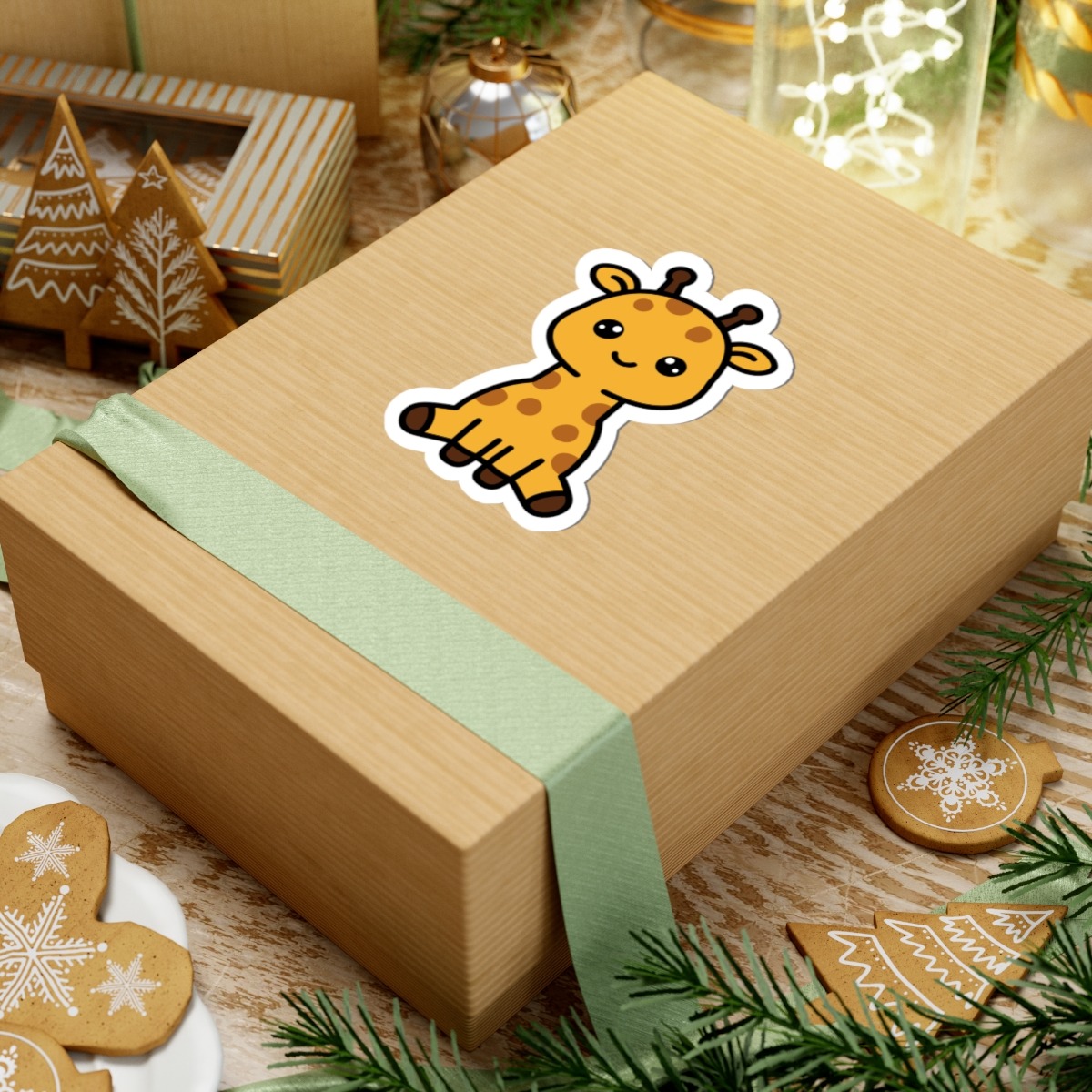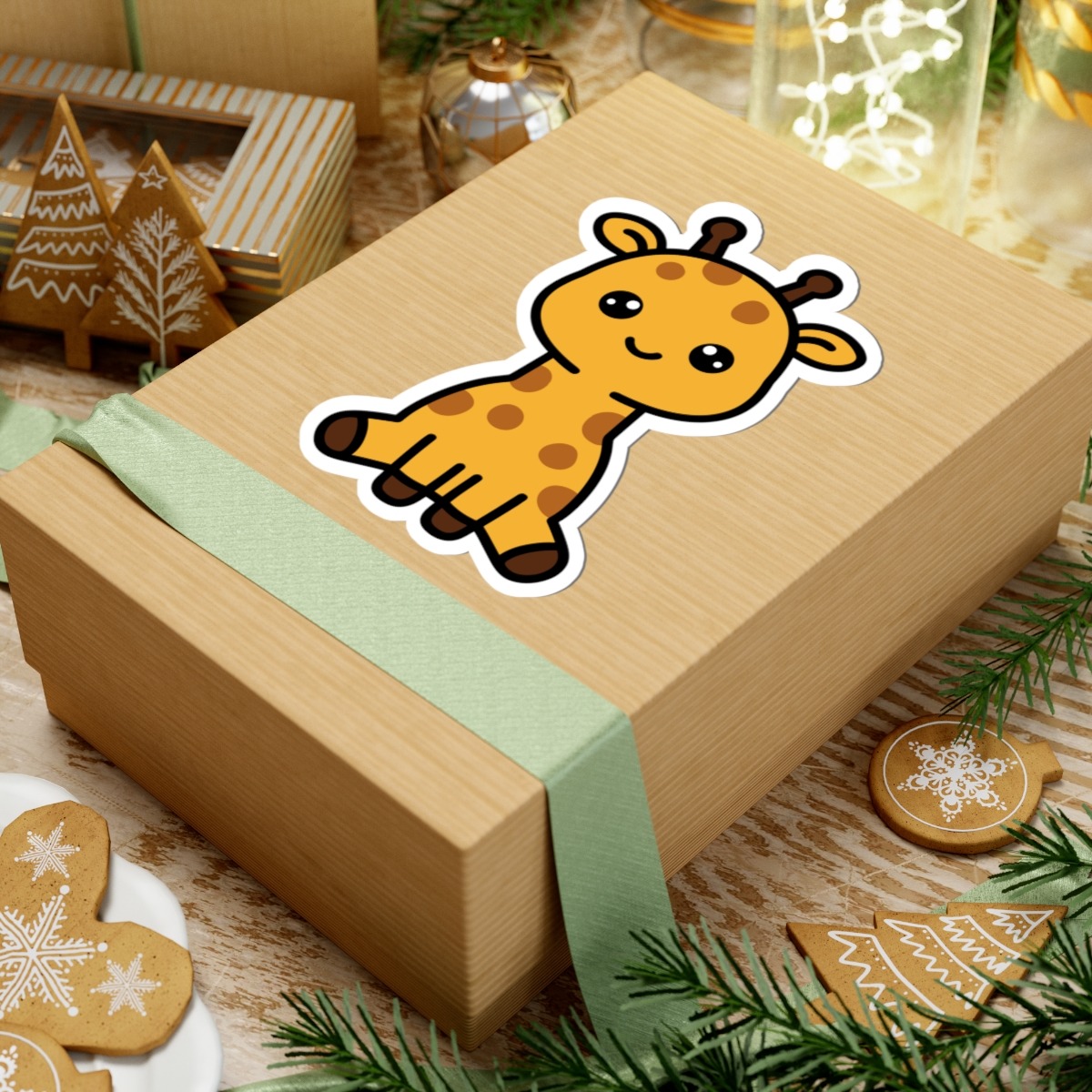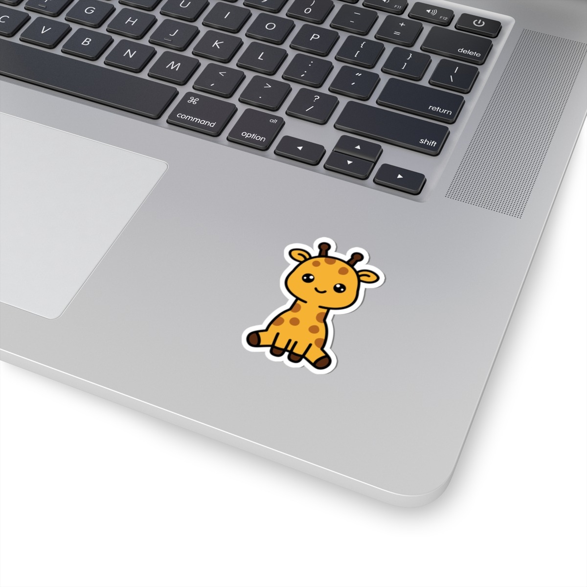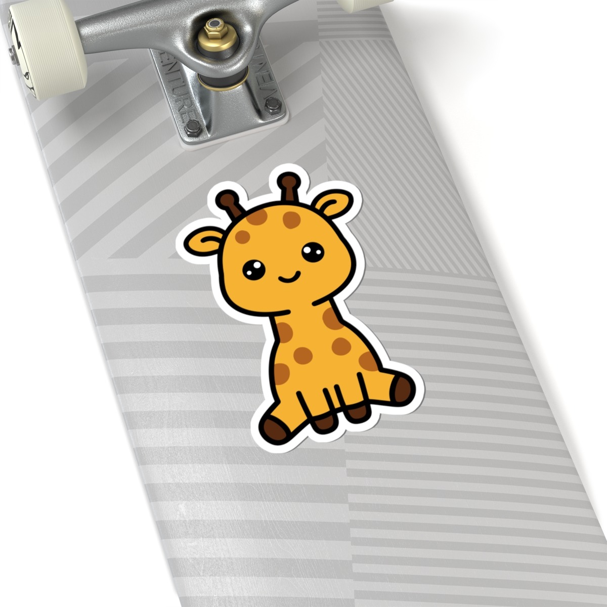 Spotted and sweet – Features a kawaii-style giraffe with big sparkling eyes, tiny horns, a goofy grin, and spots from head to hoof.