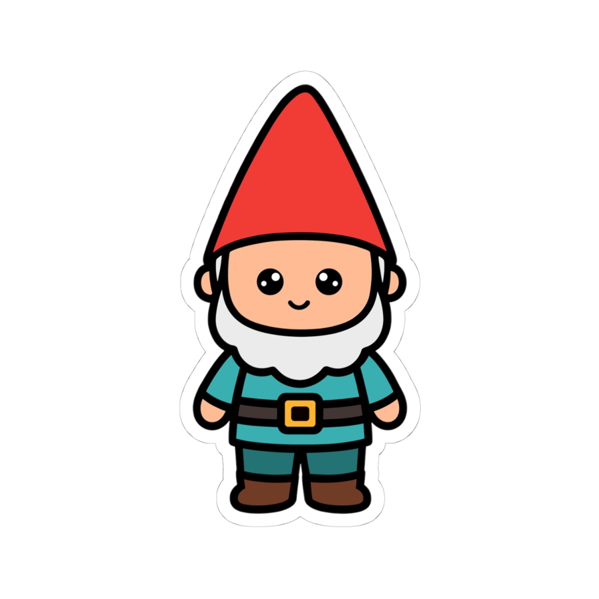 Design appeal: Features a kawaii-style gnome man with a tall red pointy hat, a fluffy white beard, big sparkling eyes, and a joyful grin, radiating pure woodland cuteness and mischievous charm.
