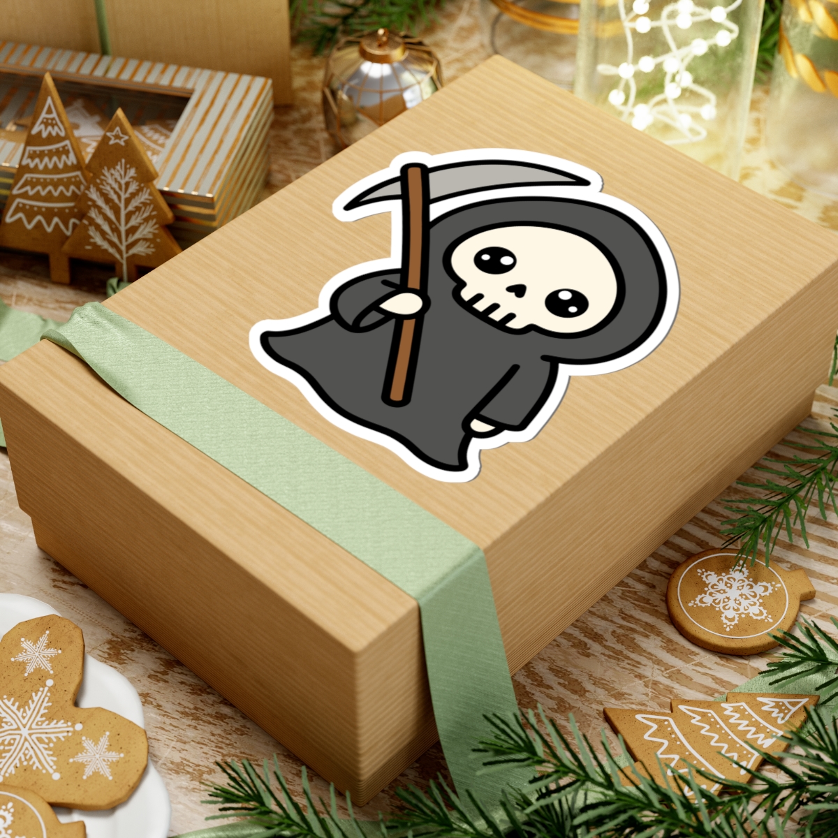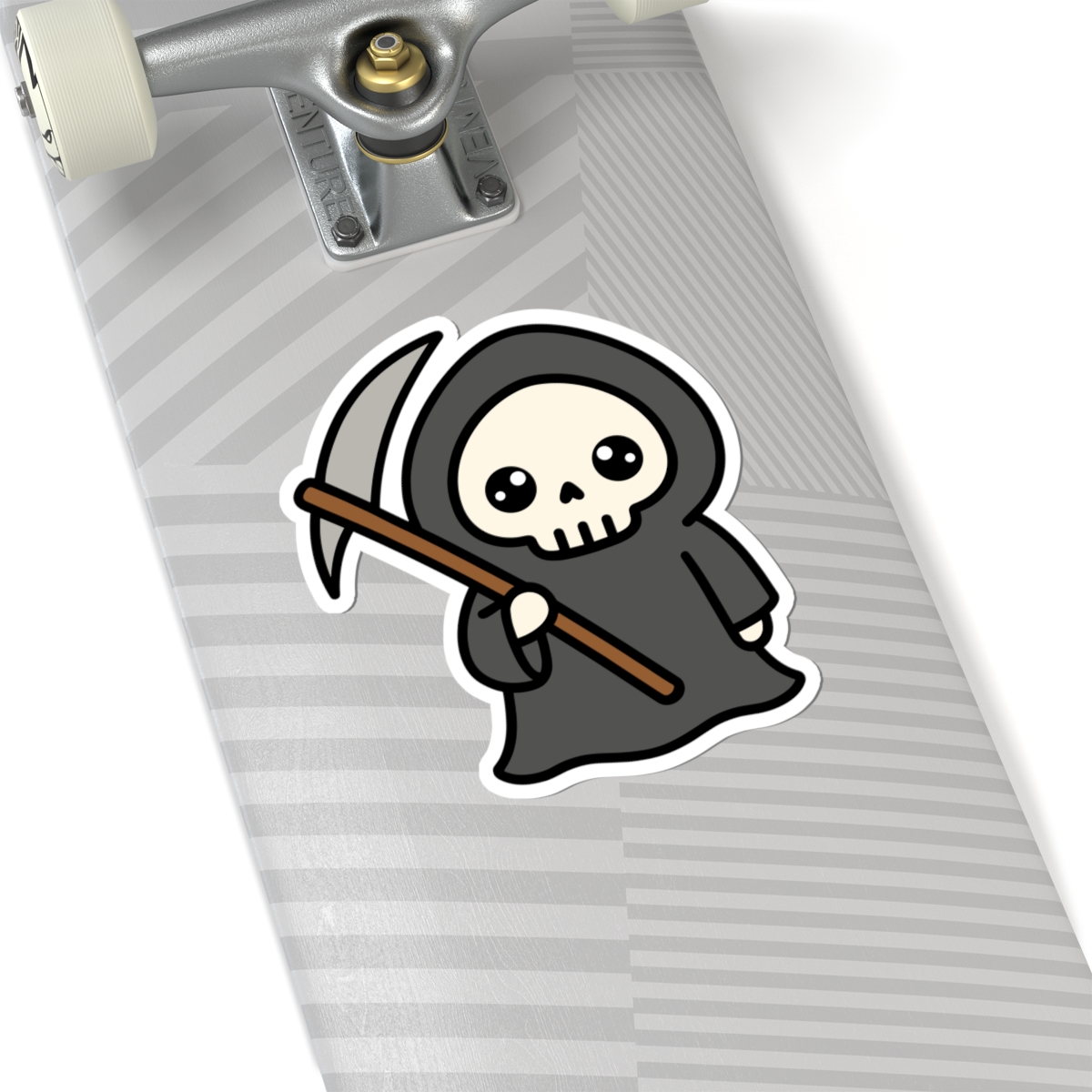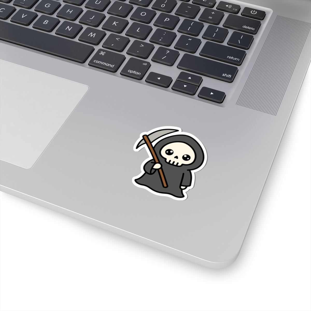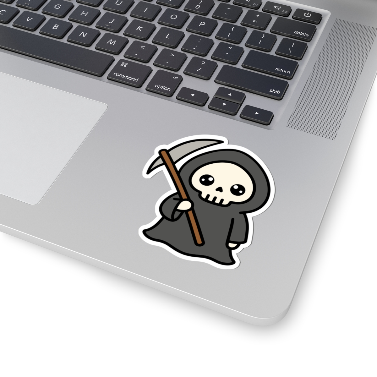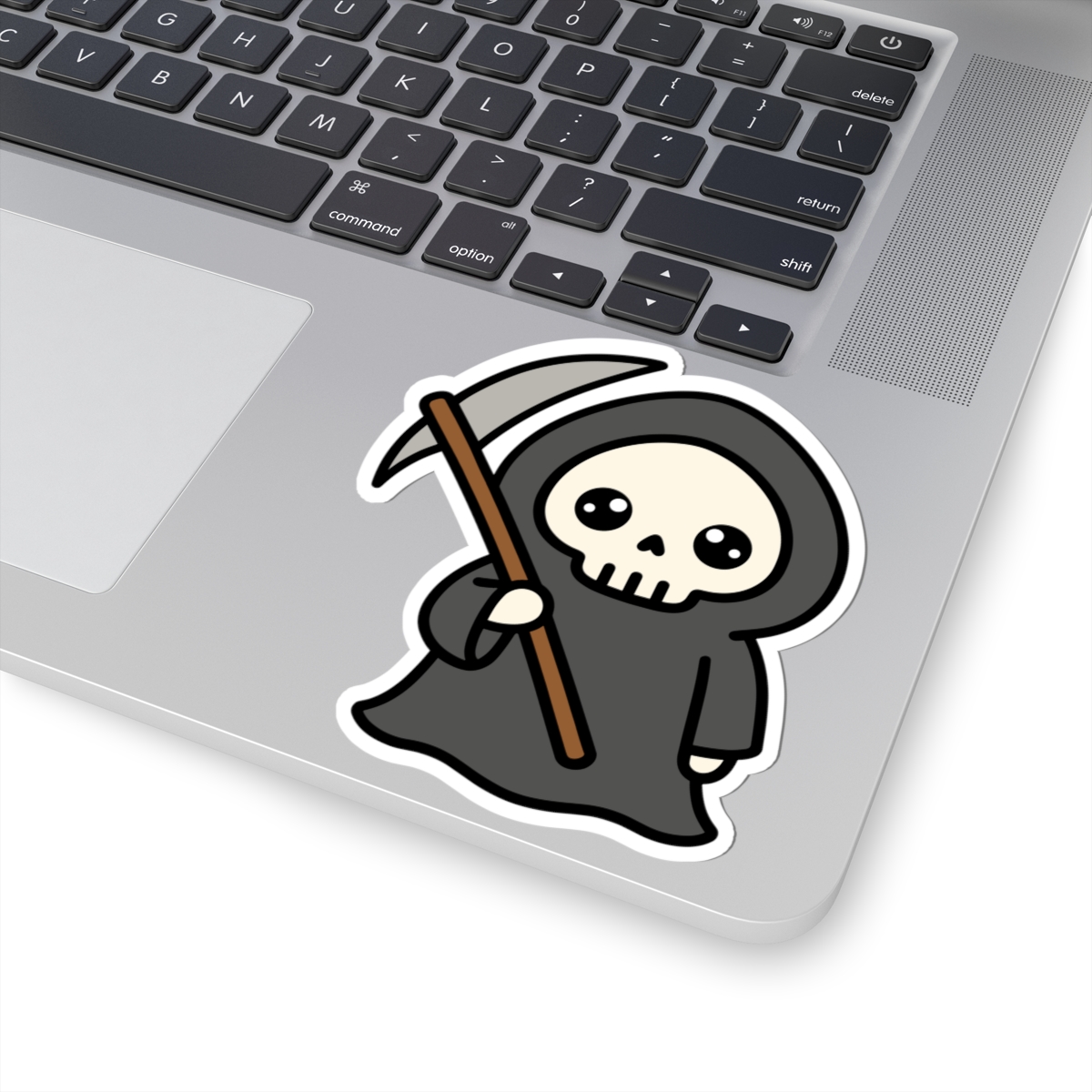 Dark and delightful – Features a kawaii-style grim reaper with a flowing black cloak, tiny scythe, and a mischievous smile that’s more “boo!” than doom.