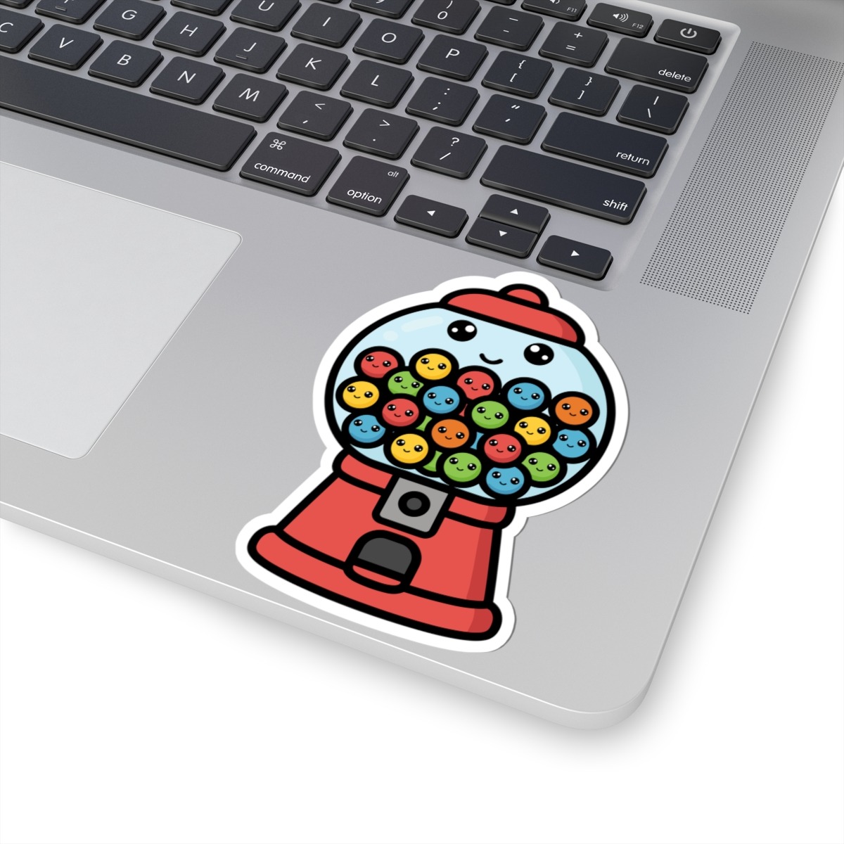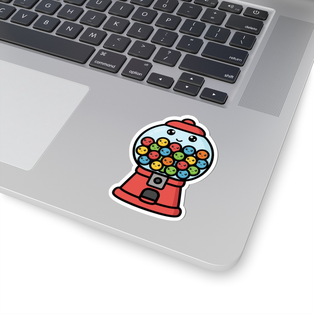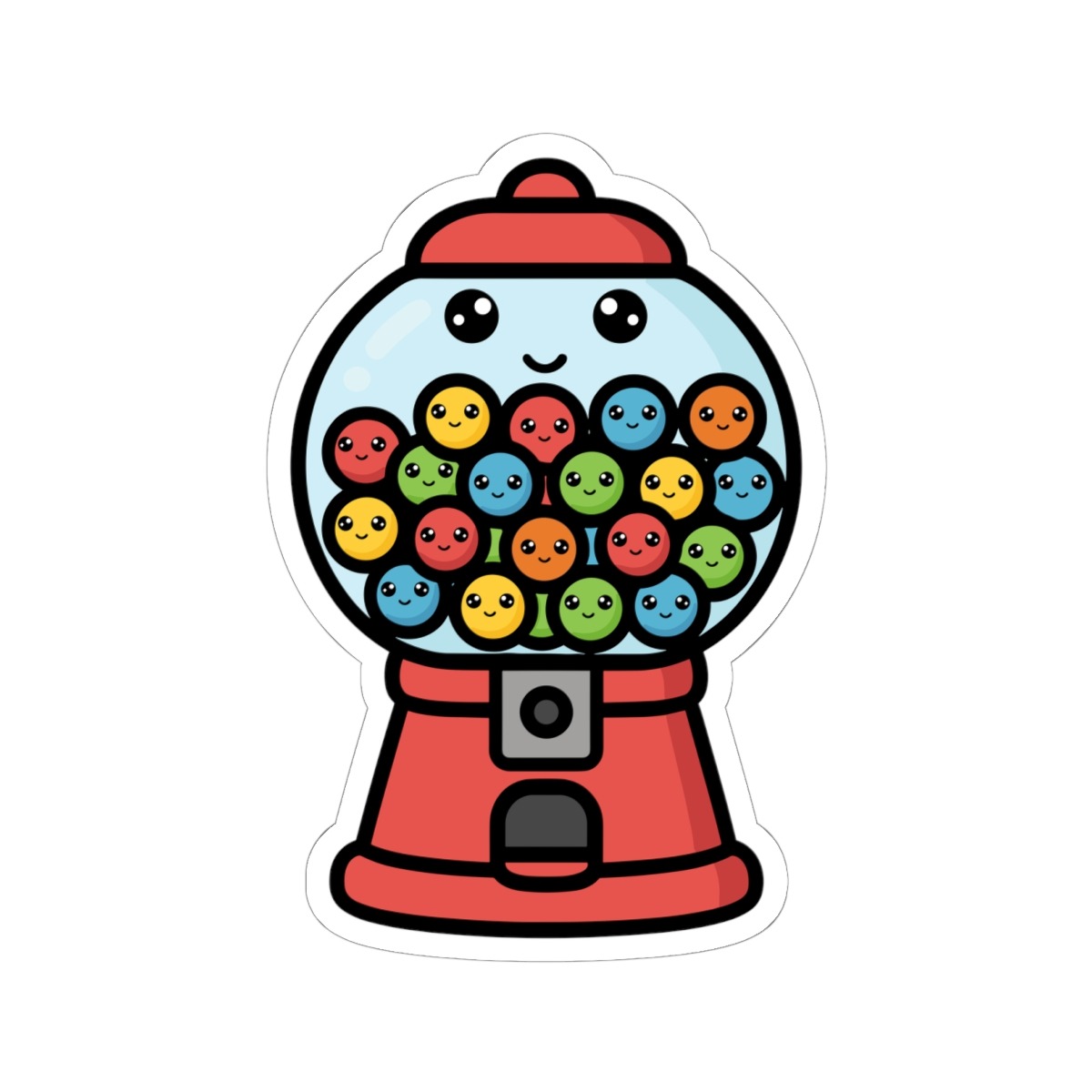 Design appeal: Features a kawaii-style gumball machine with a bright red base, a clear globe filled with rainbow-colored gumballs, a silver turning knob, big sparkling eyes, and a joyful grin, radiating pure nostalgic cuteness and candy-store magic.