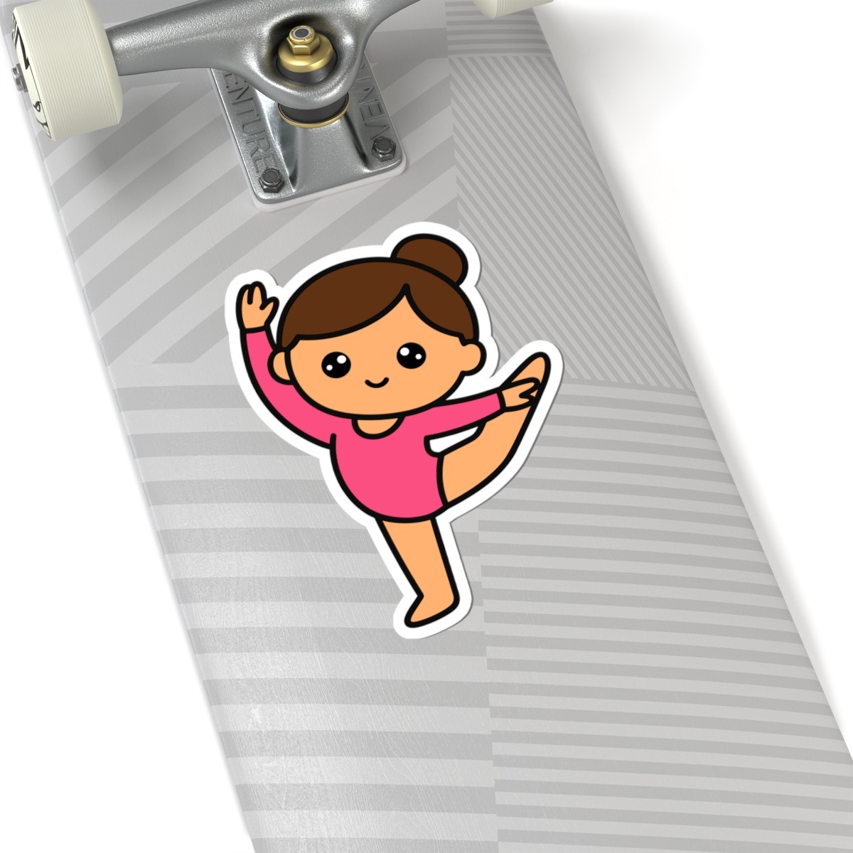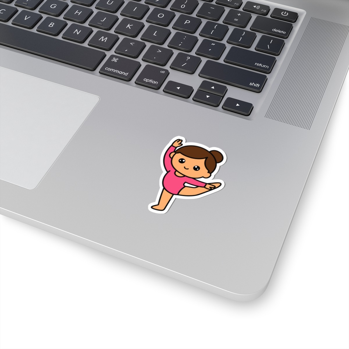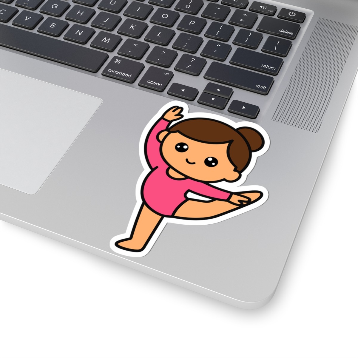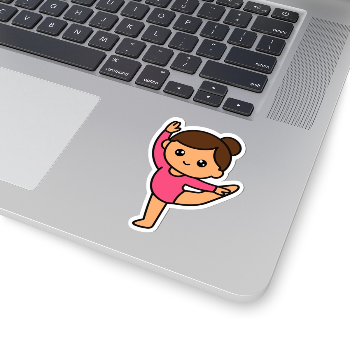 - Graceful and energetic – Features a kawaii-style gymnast in a bright leotard, mid-split leap, and a confident, joy-filled smile.