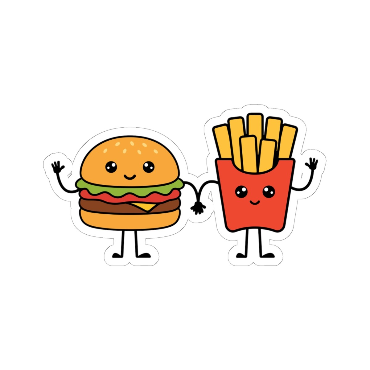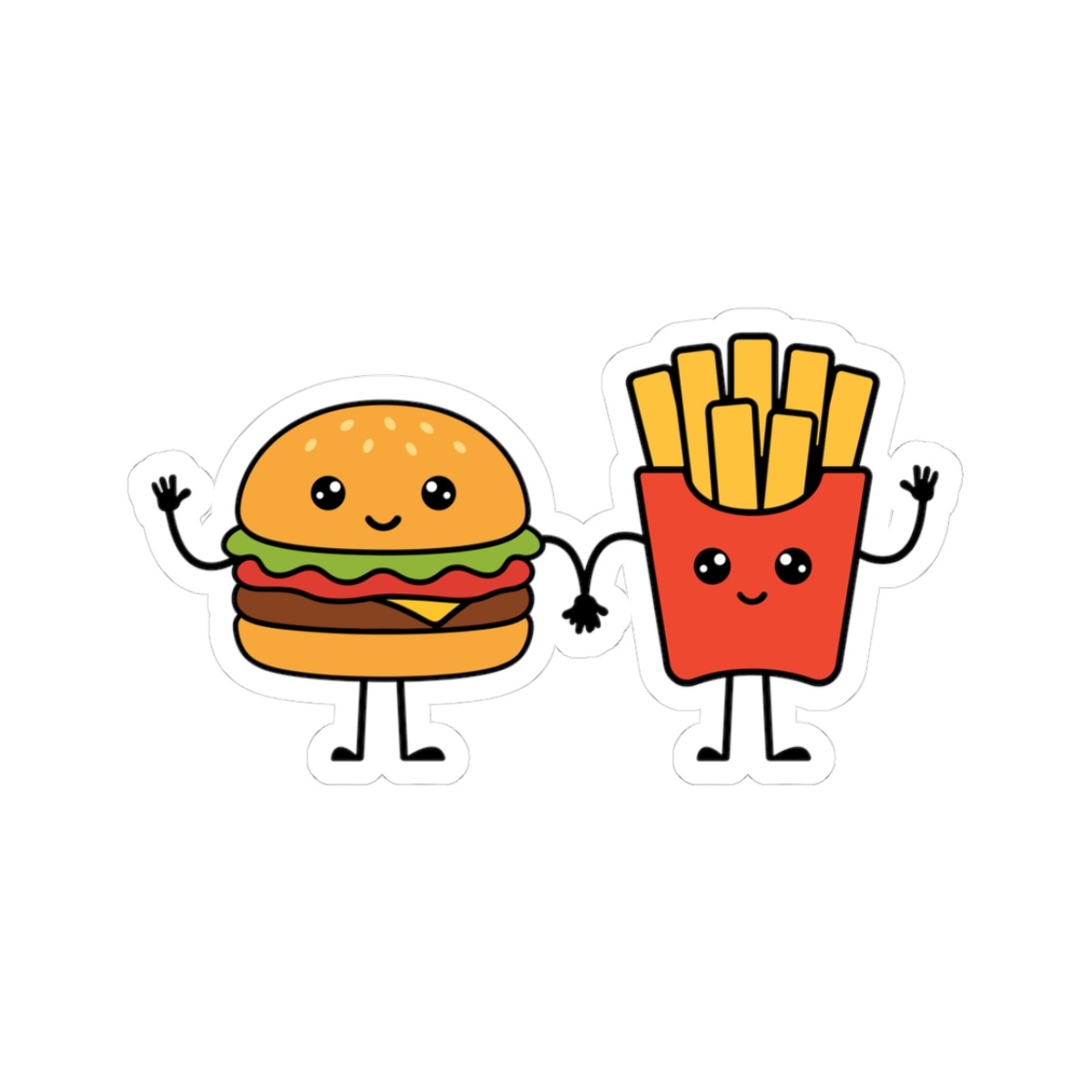 Design Appeal – Featuring a smiling hamburger holding hands with a cheerful box of fries, both with expressive eyes and happy faces, it’s a kawaii duo that radiates snack-time companionship.