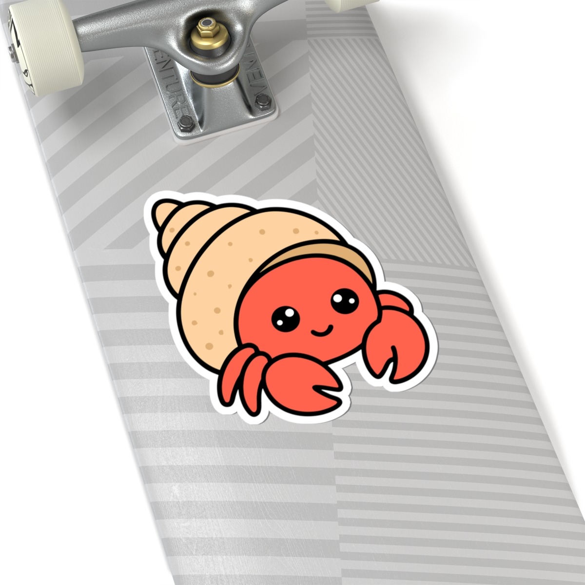 Design appeal: Features a kawaii-style hermit crab with a bright red body tucked into a swirly shell in soft sandy tones, big sparkling eyes, and a playful grin, radiating pure seaside cuteness and adventurous spirit.