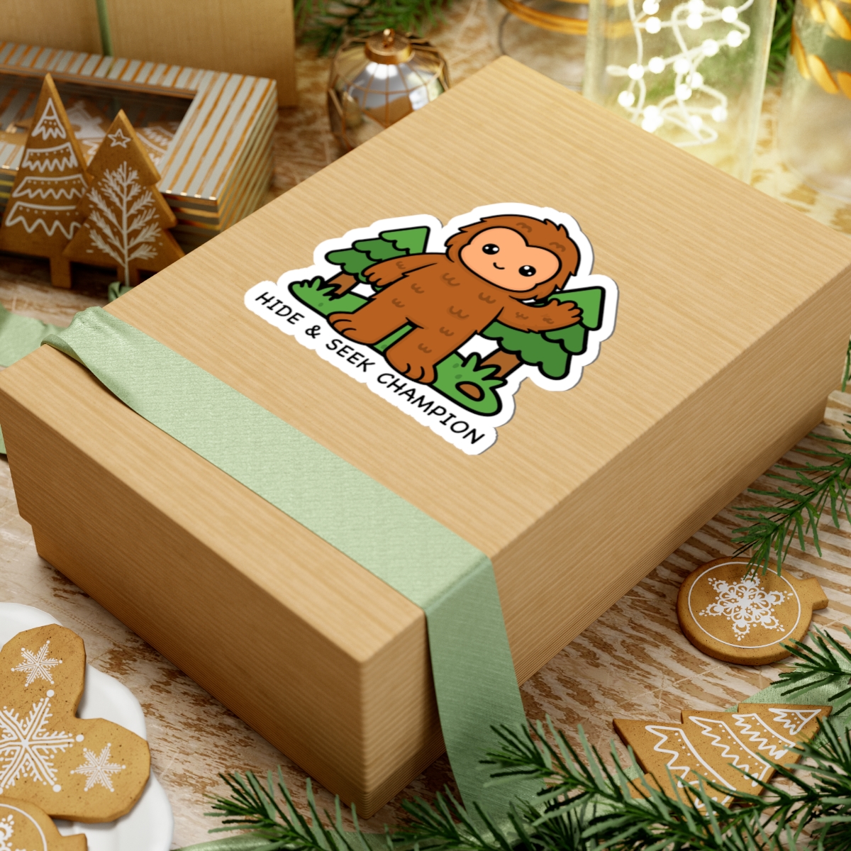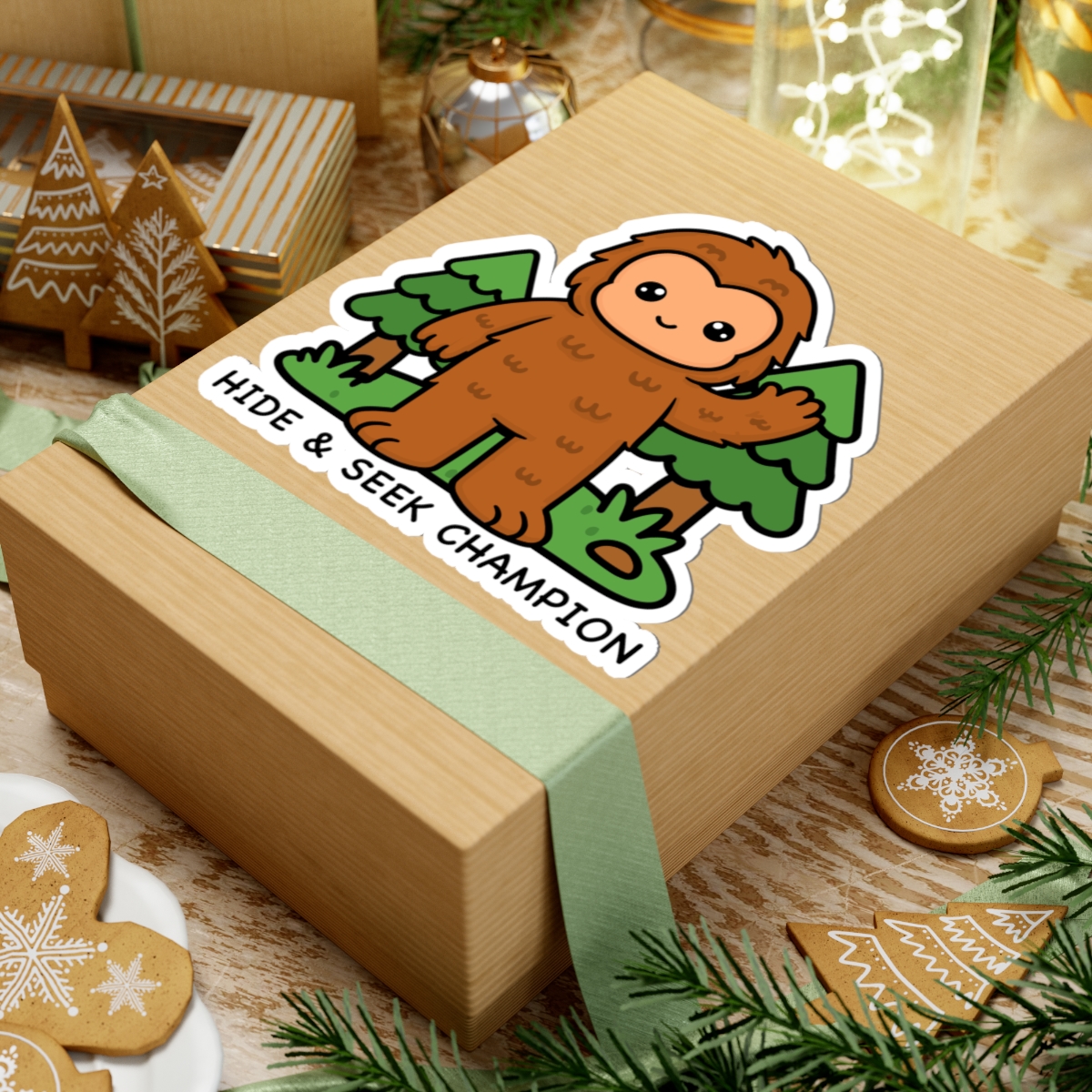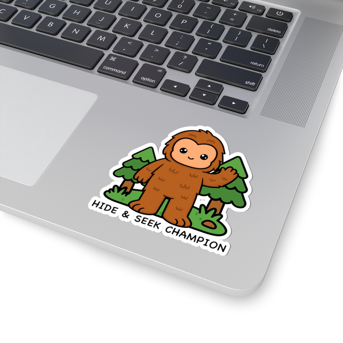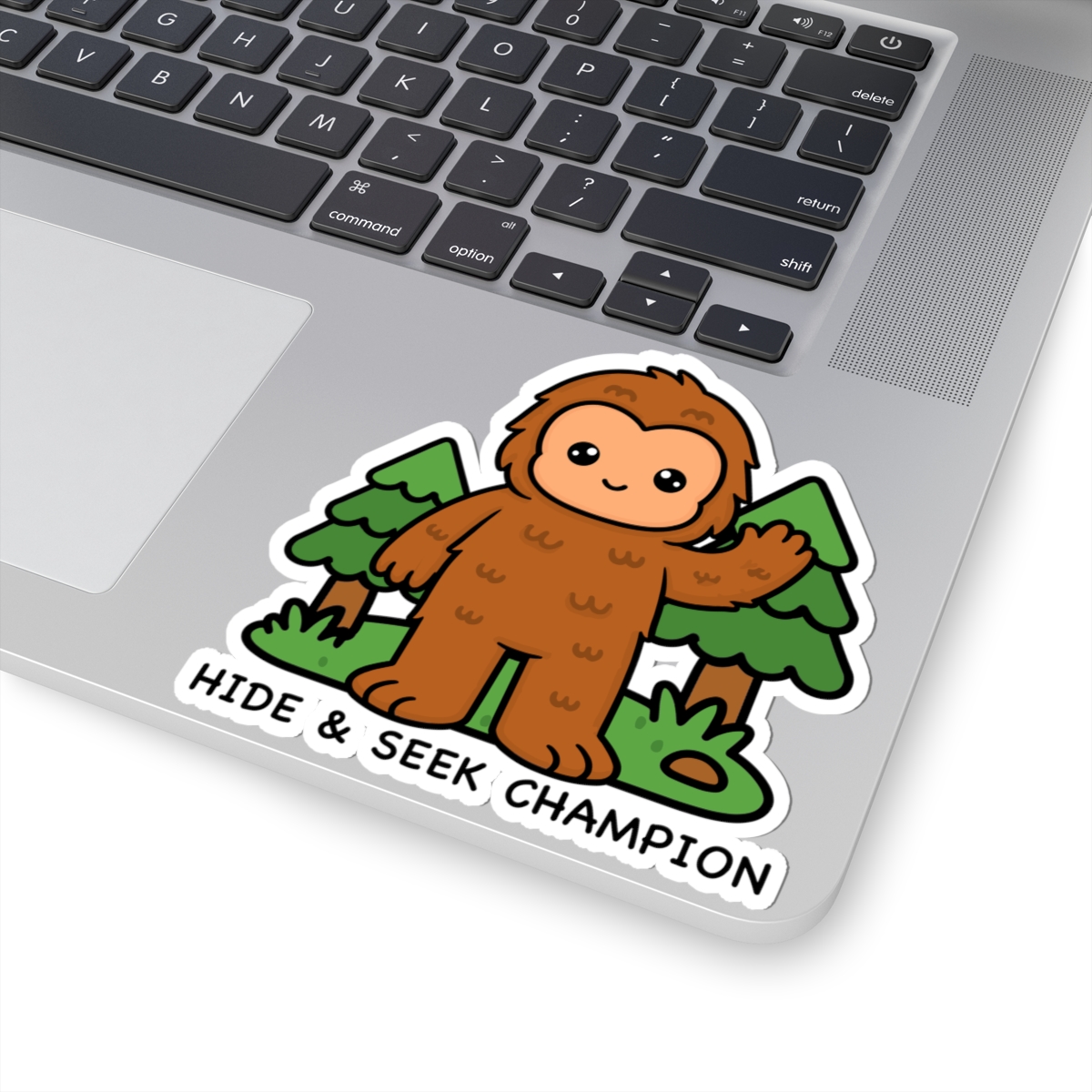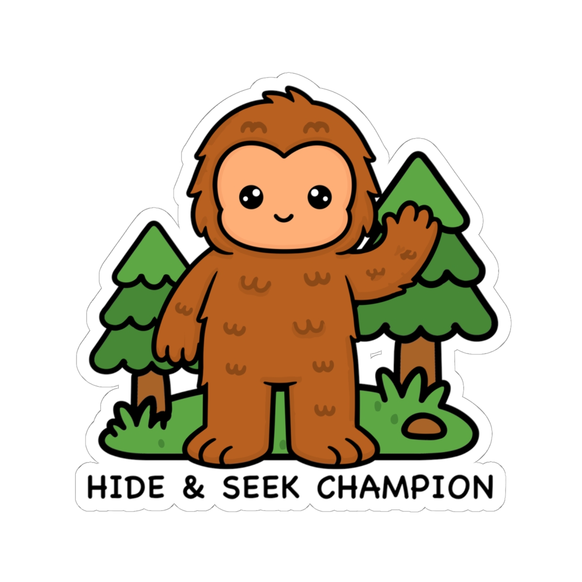 Mysterious and mighty – Features a kawaii-style Bigfoot in a forest with a “Hide & Seek Champion” and an expression that says, “you’ll never catch me.”