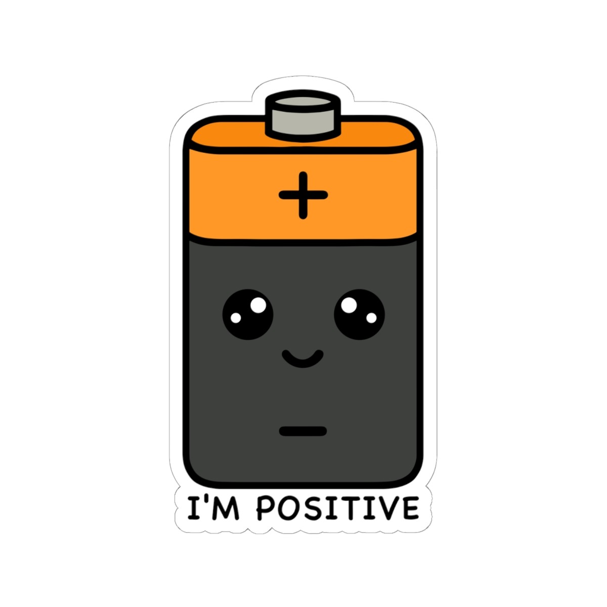 Design appeal: Features a kawaii-style battery with a metallic body, a bright orange top marked with a plus sign, big sparkling eyes, and a wide, cheerful grin, paired with the punny phrase “I’m Positive” in playful lettering — it’s electrifyingly cute and full of good energy!