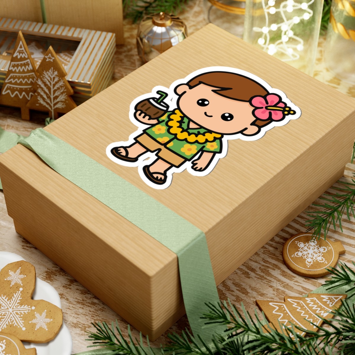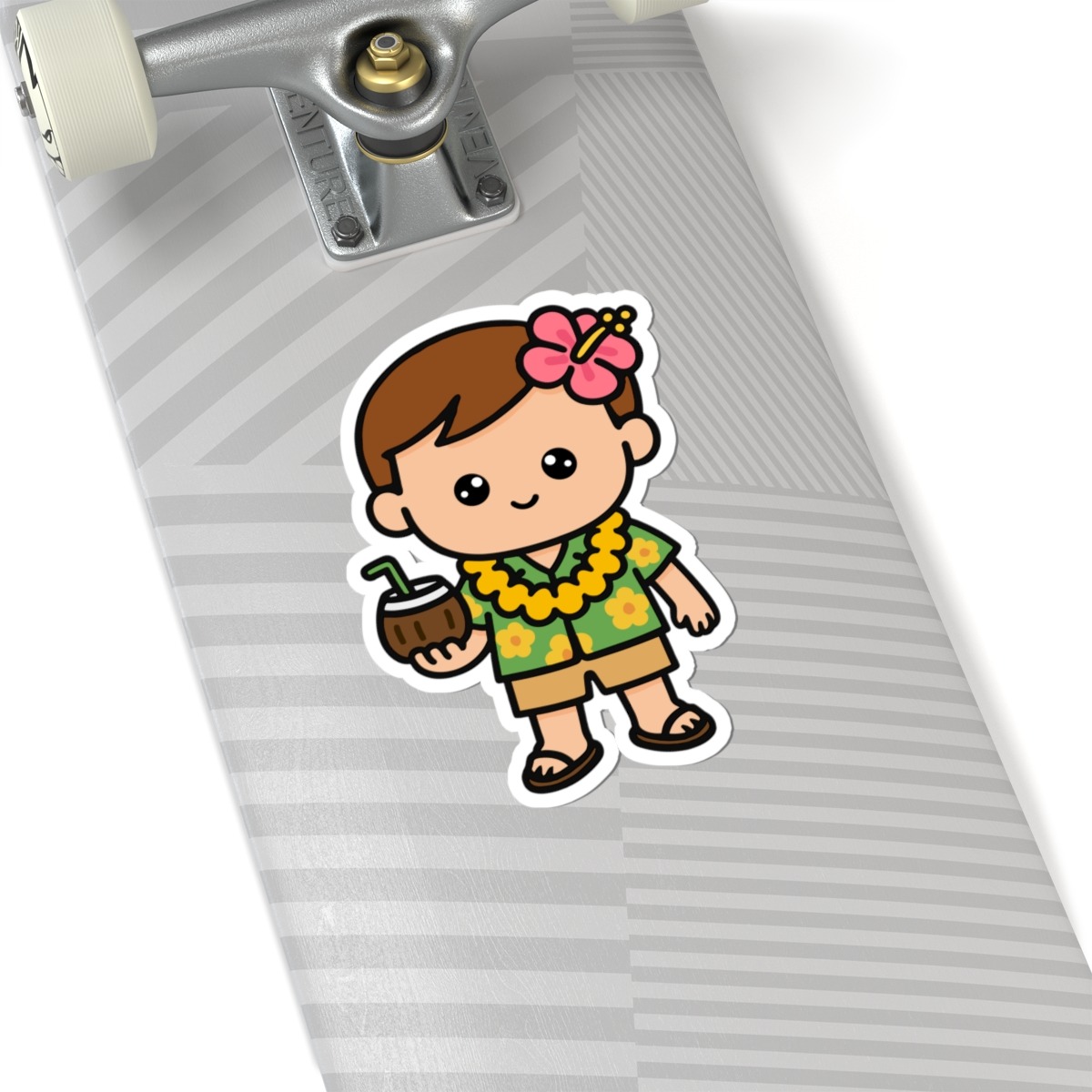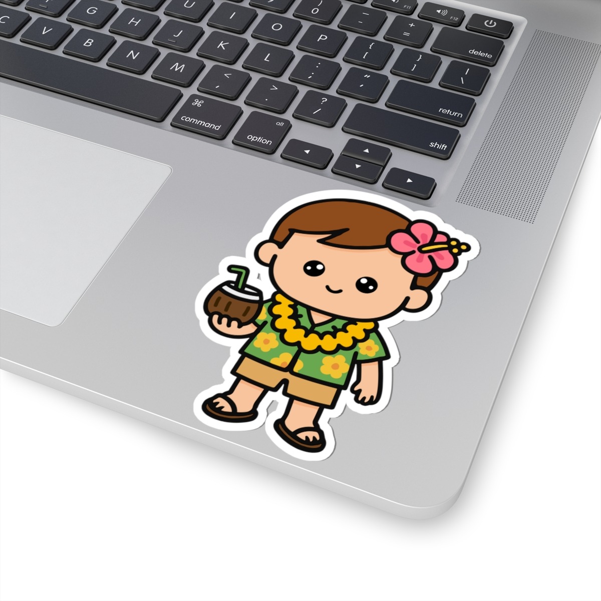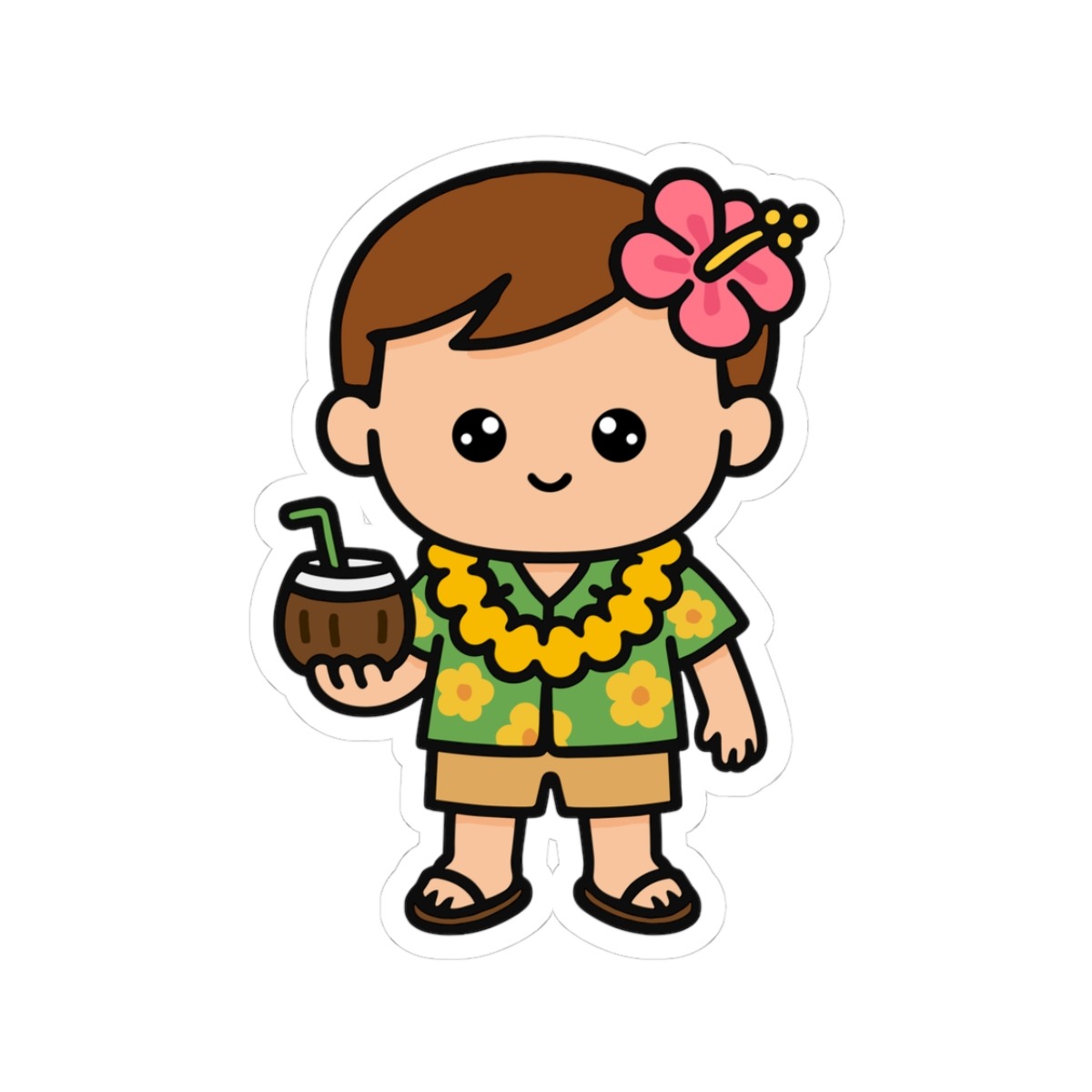 Design appeal: Features a kawaii-style boy wearing a bright Hawaiian flowered shirt, lei around his neck, floral hibiscus tucked behind his ear, sipping from a coconut, dressed in comfy shorts and sandals, with big sparkling eyes and a beaming grin — radiating pure island fun and vacation happiness.