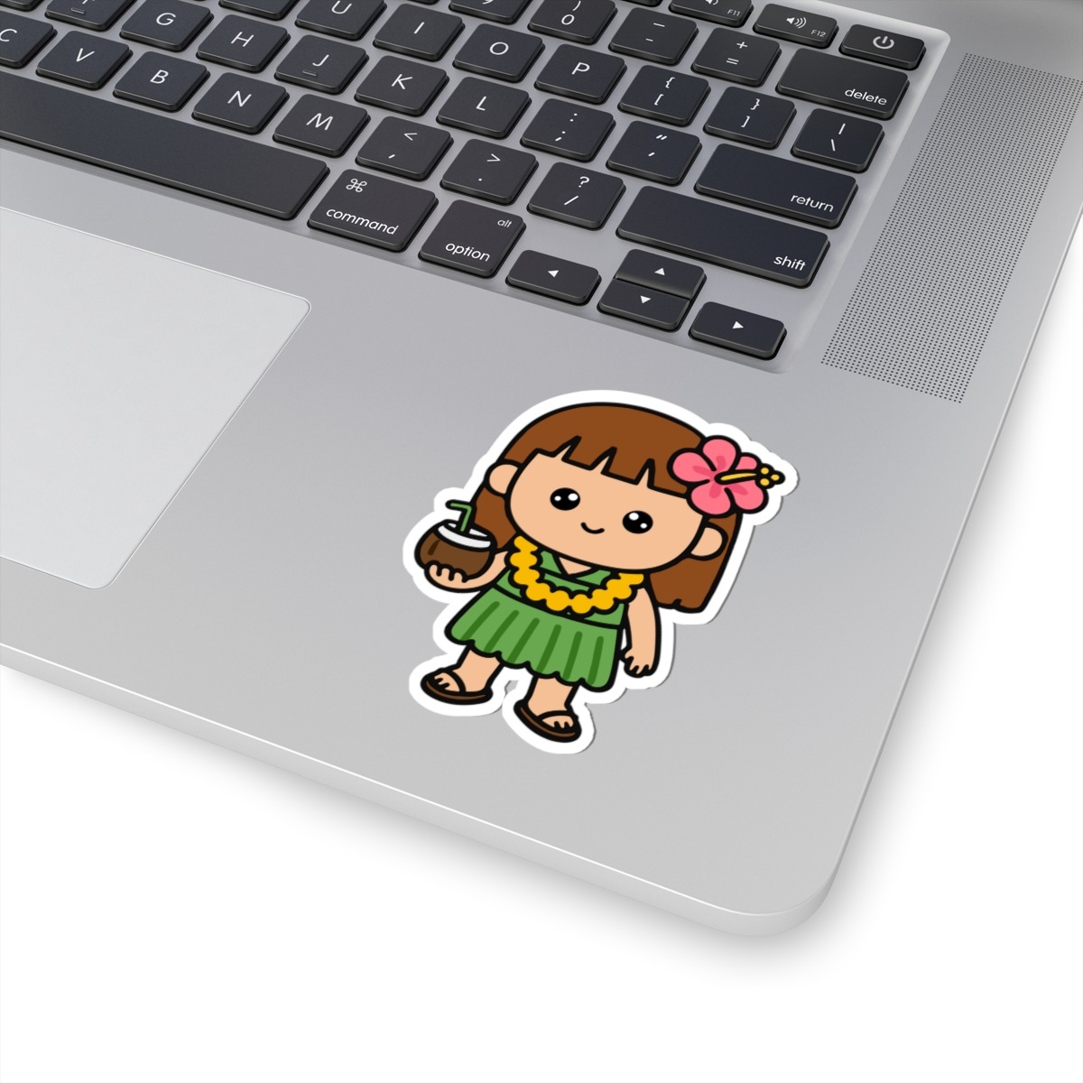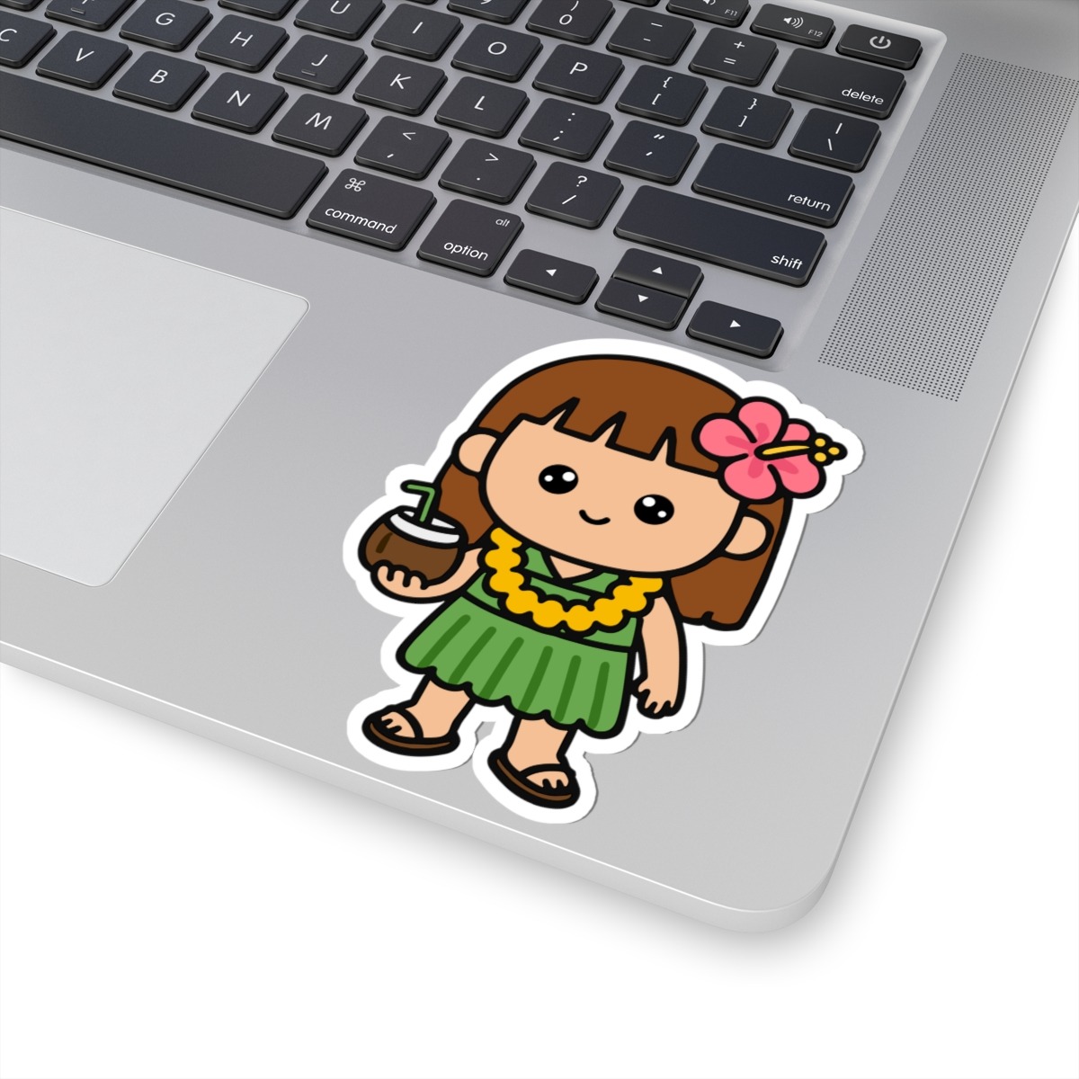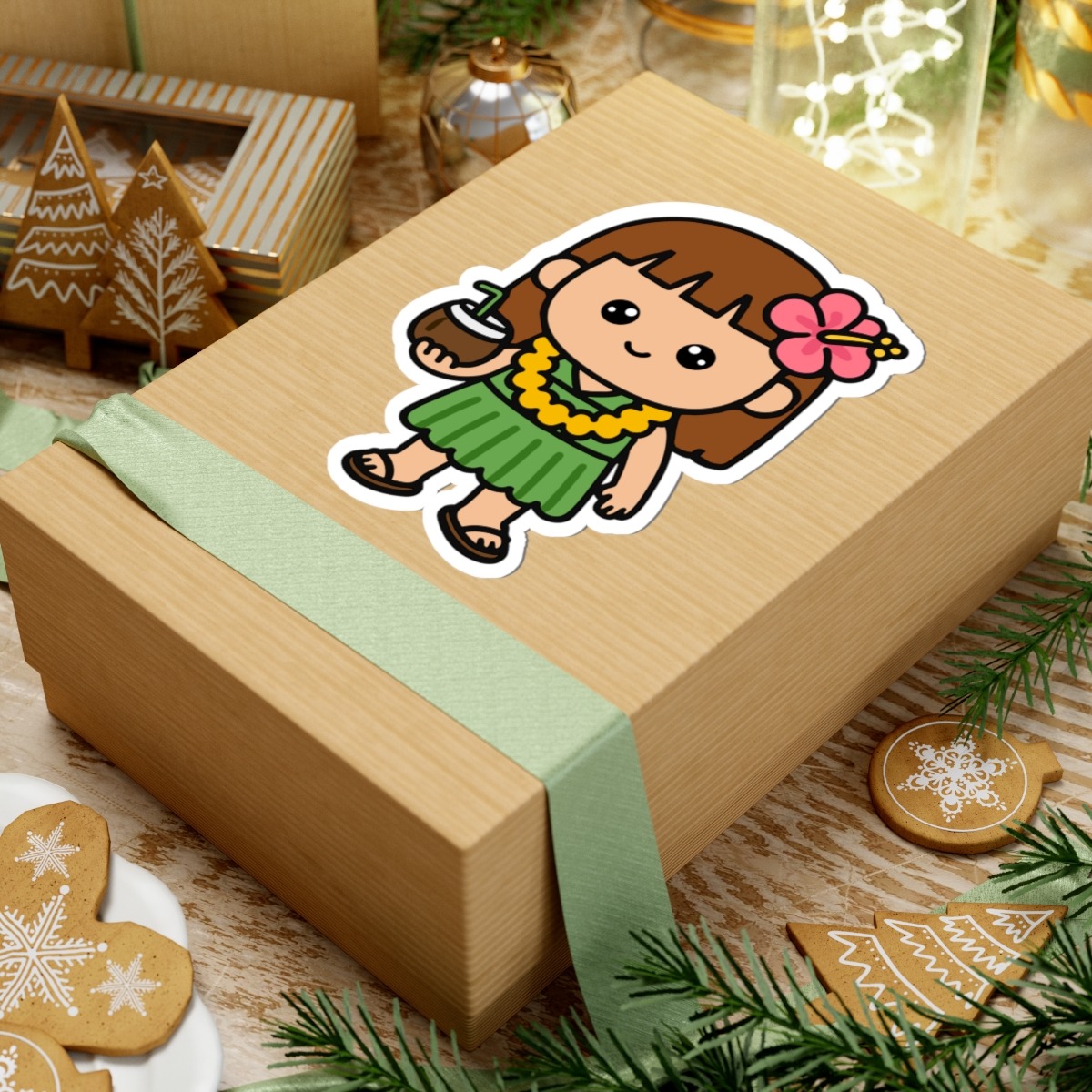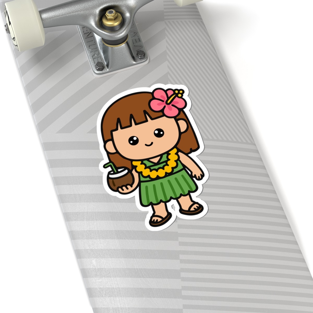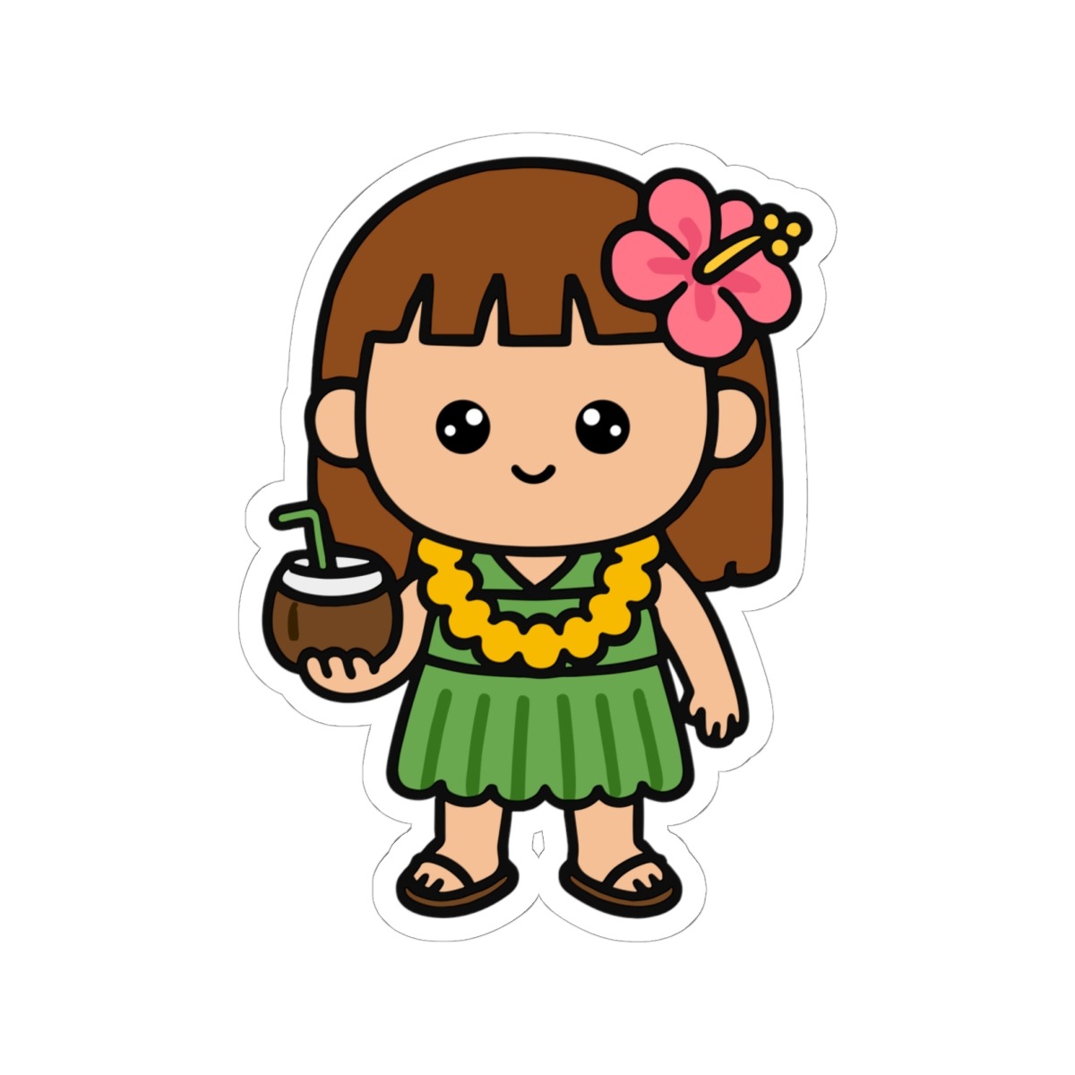 Design appeal: Features a kawaii-style girl wearing a flowing green dress, a lei draped around her neck, sipping from a coconut, with a bright hibiscus flower tucked in her hair, and cute sandals on her feet, radiating pure island joy and tropical charm.