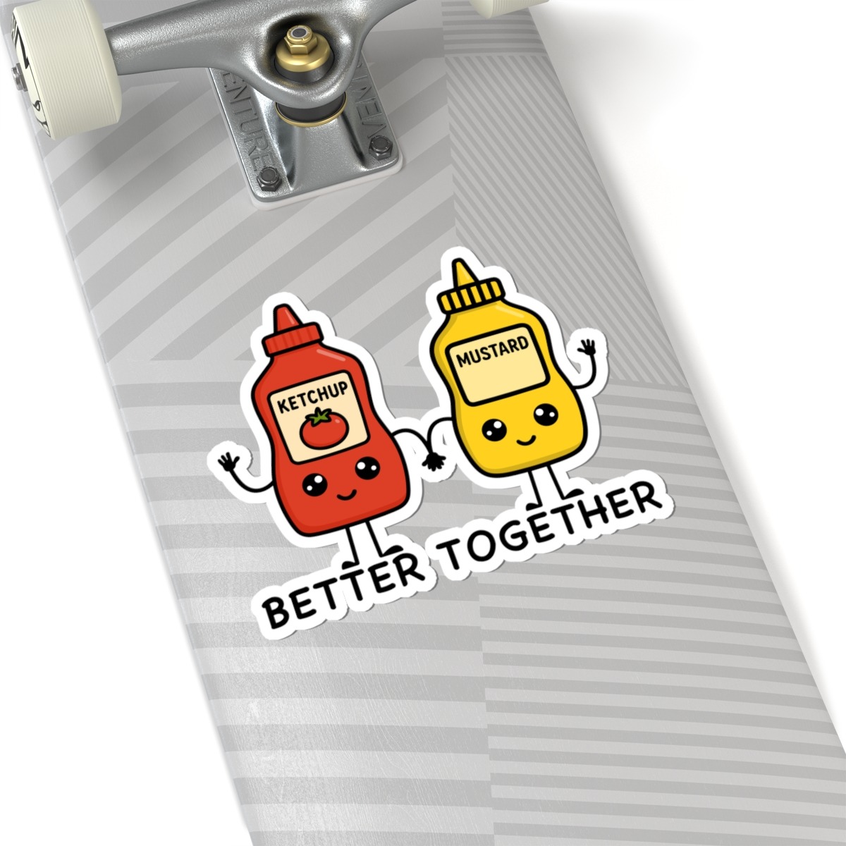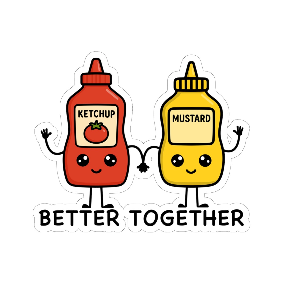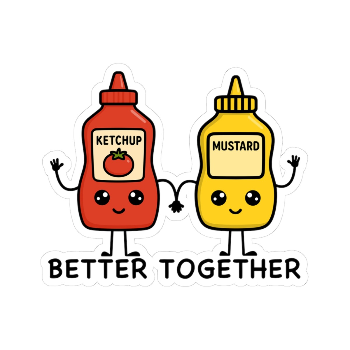 Design appeal: Features a kawaii-style ketchup bottle in bright red and a mustard bottle in sunny yellow, both with big sparkling eyes, happy grins, and cute labels, holding hands with the punny phrase “Better Together” in playful lettering — radiating pure condiment cuteness and best-friends vibes.