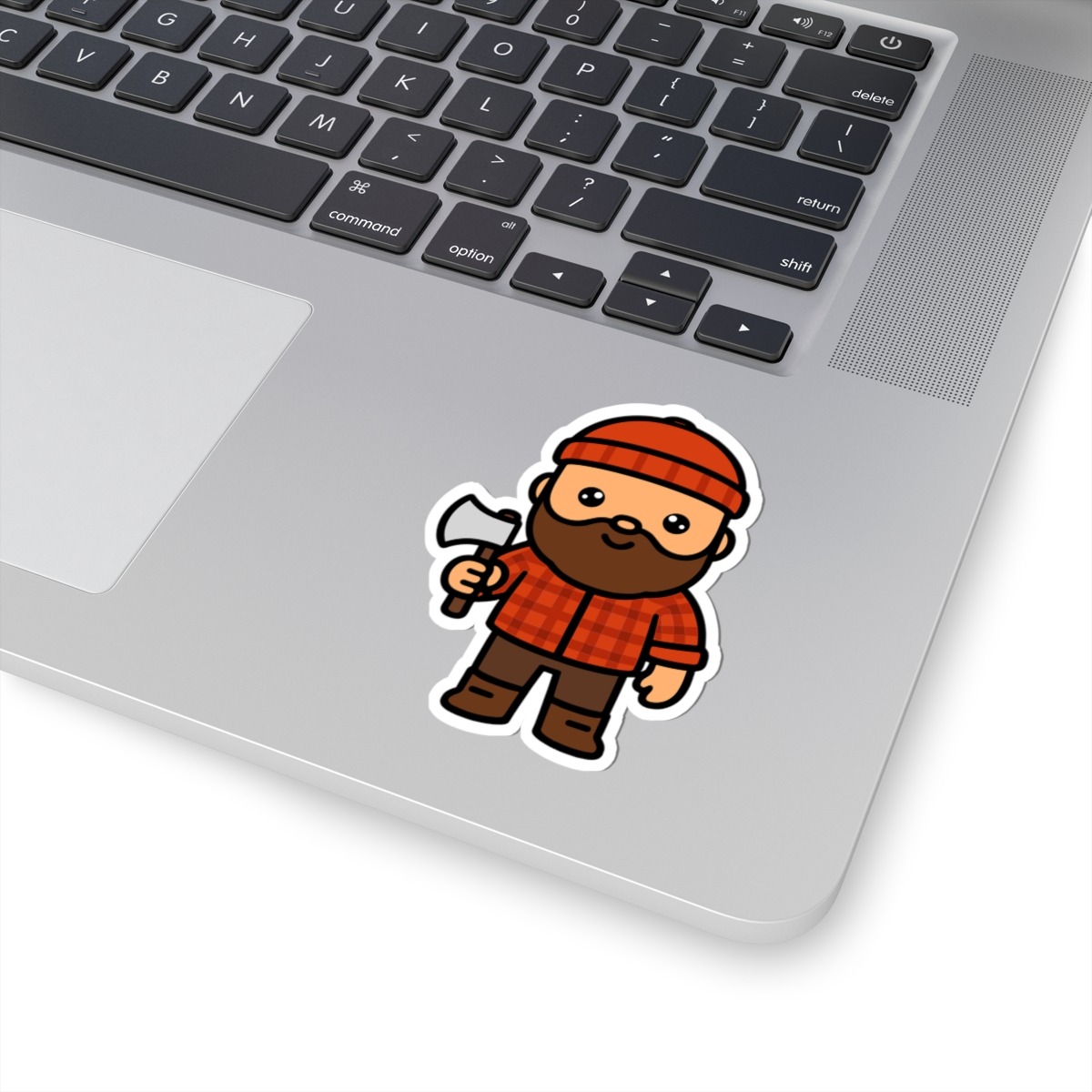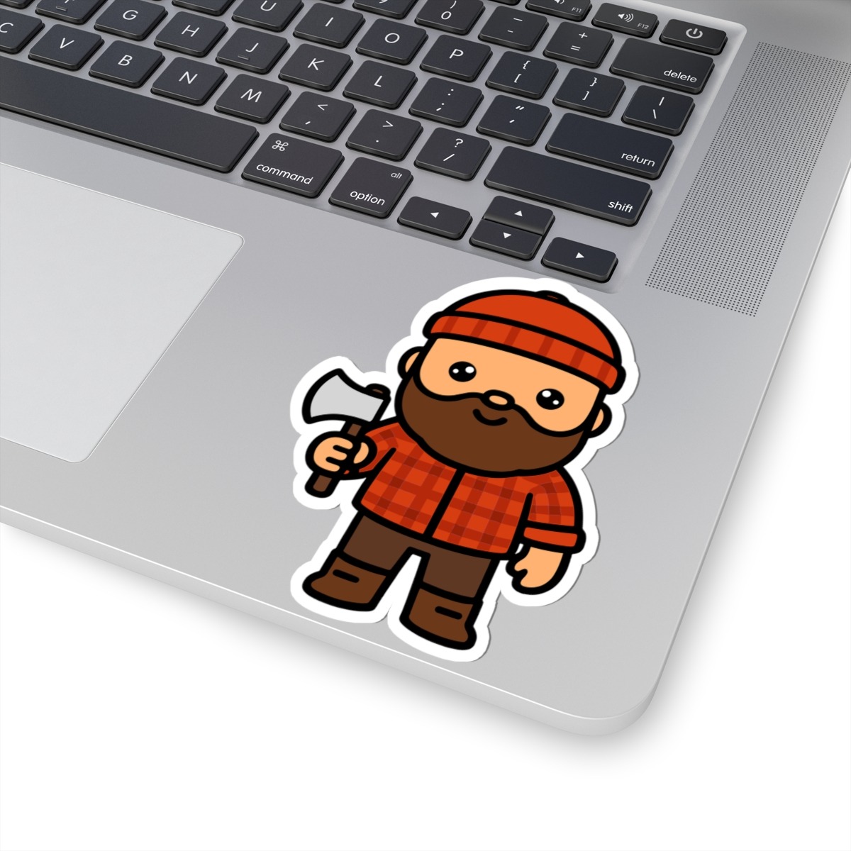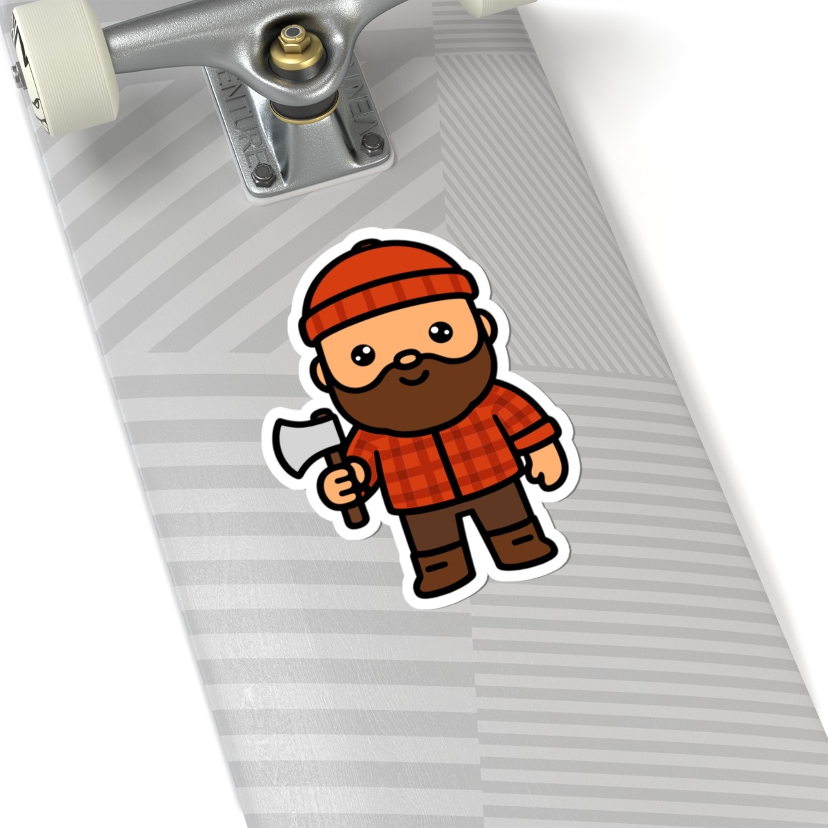 Rugged and adorable – Features a kawaii-style lumberjack in a classic red flannel, beanie, and boots, proudly holding a tiny axe with a big grin.