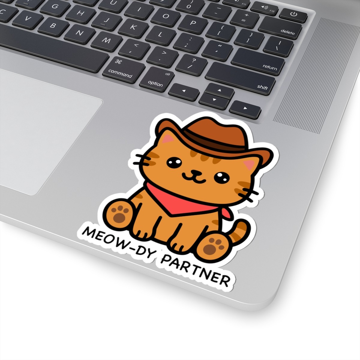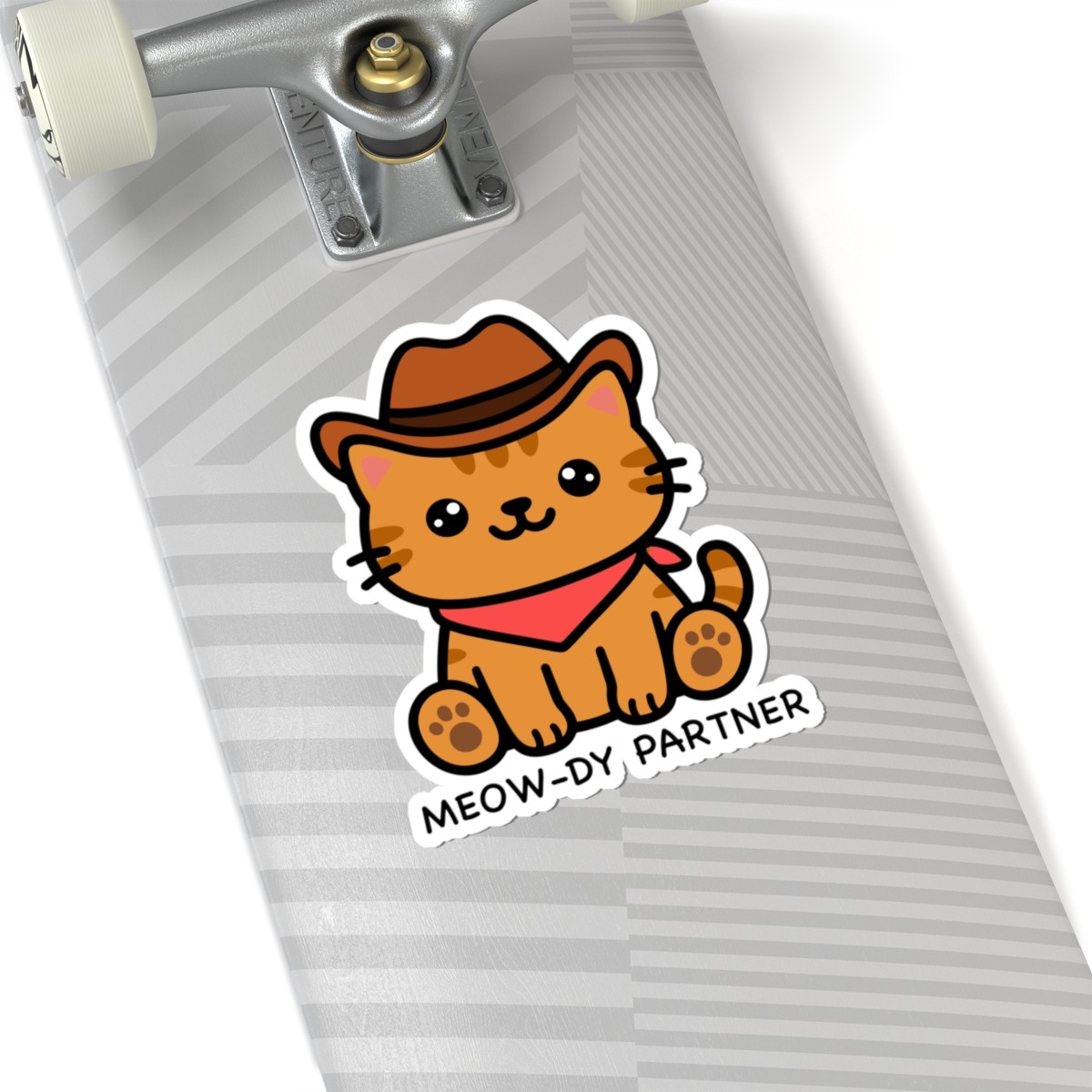 Design appeal: Features a kawaii-style cat wearing a tiny cowboy hat, a red bandana tied around its neck, and a mischievous grin, paired with the punny phrase “Meow-dy Partners” in playful lettering — it’s pure feline western cuteness and wild west fun!