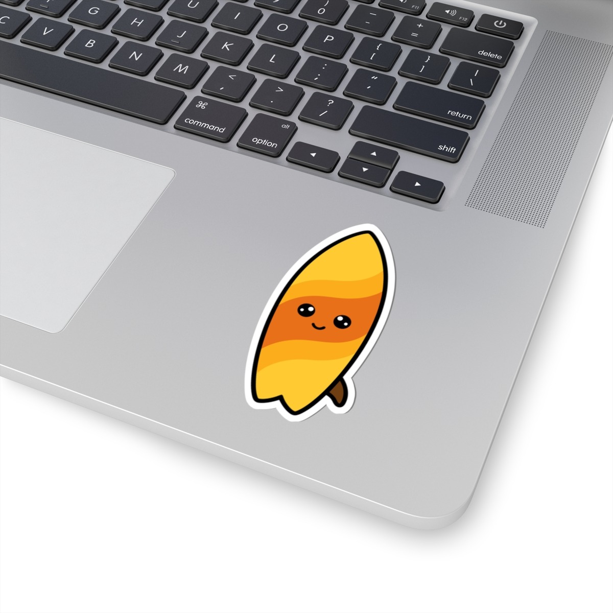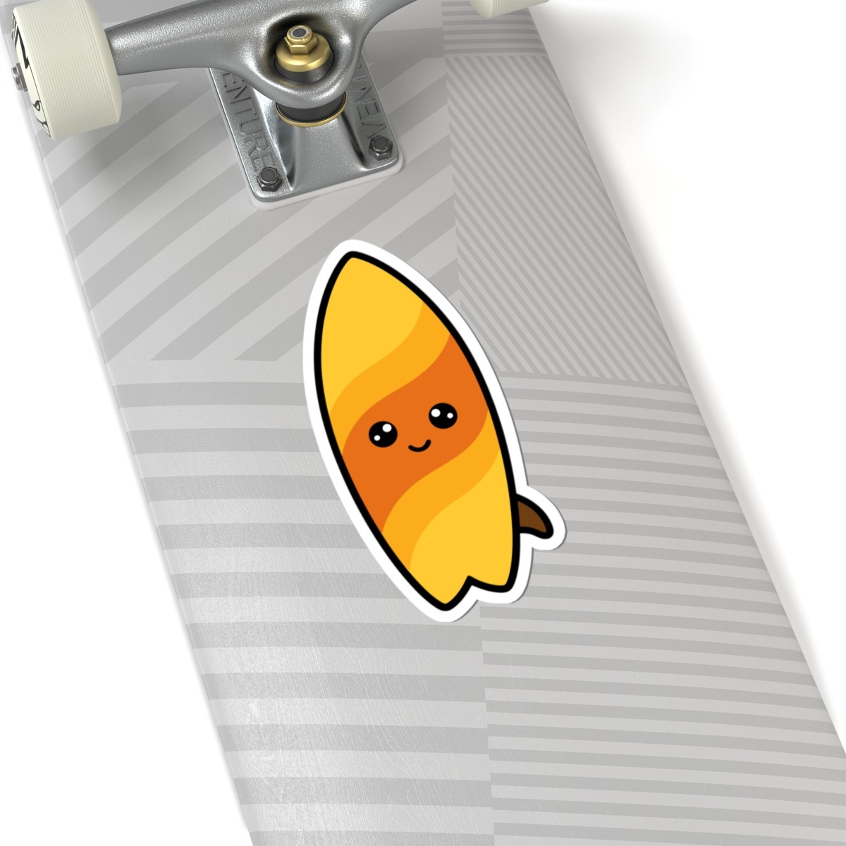 Design appeal: Features a kawaii-style surfboard with sleek orange and yellow waves, smooth curves, big sparkling eyes, and a joyful grin, radiating pure beach fun and cheerful energy.