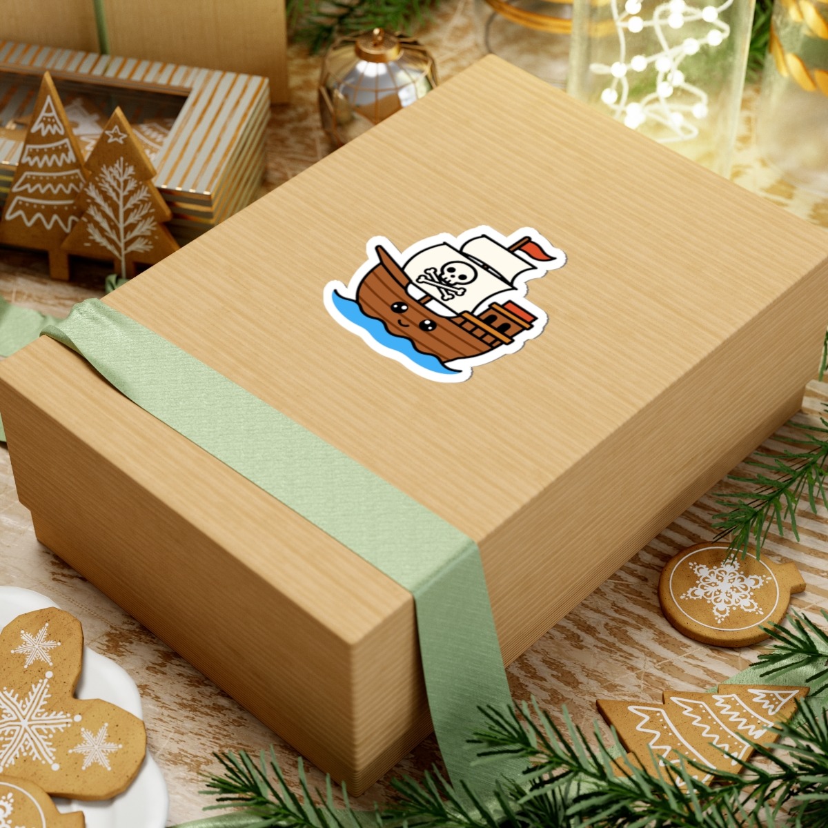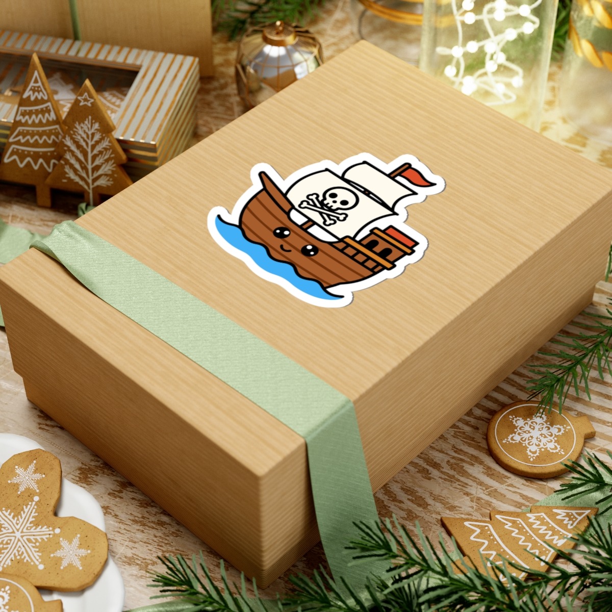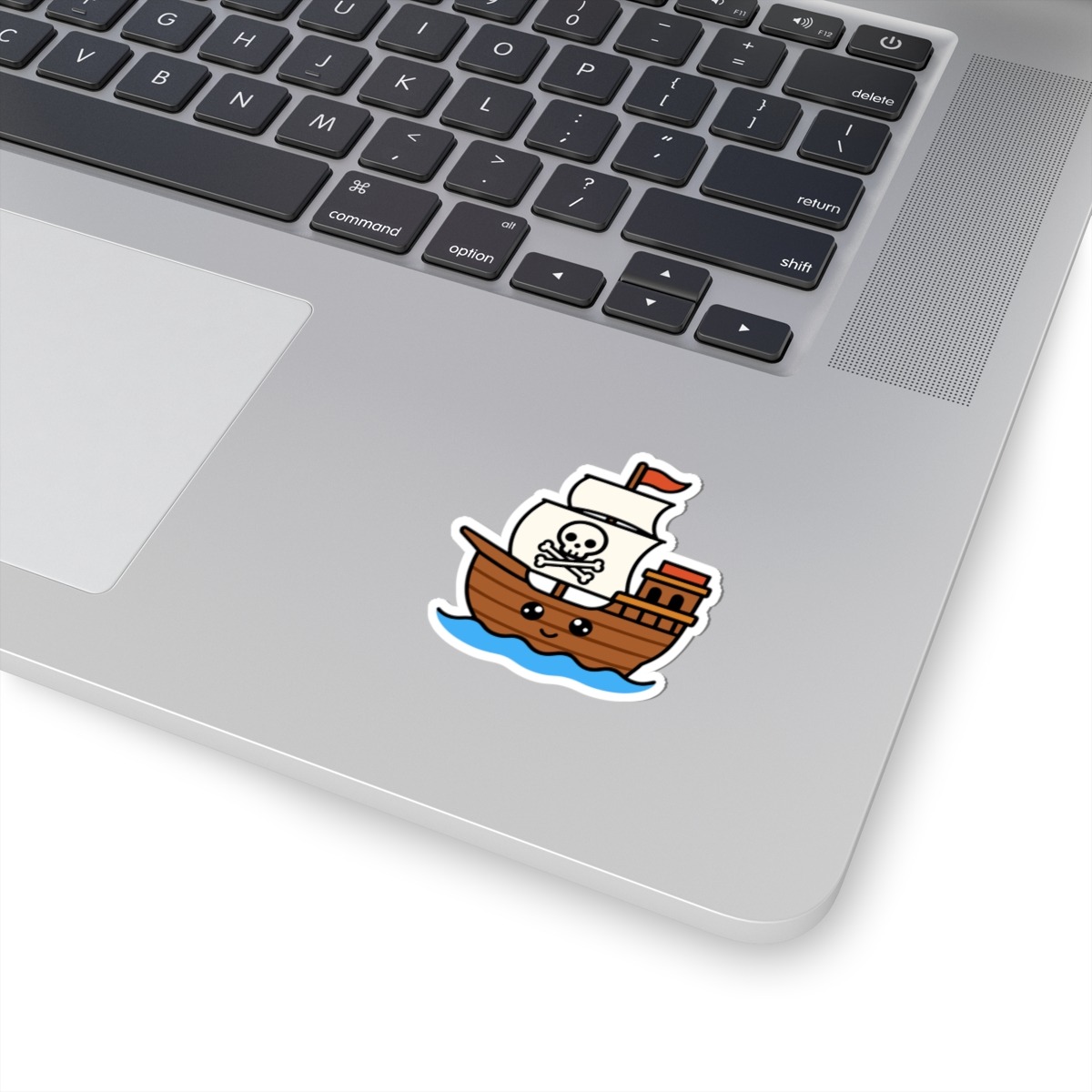 Swashbuckling and sweet – Features a kawaii-style pirate ship with a curved wooden hull, a happy little face, sails, and a skull-and-crossbones displayed proudly.