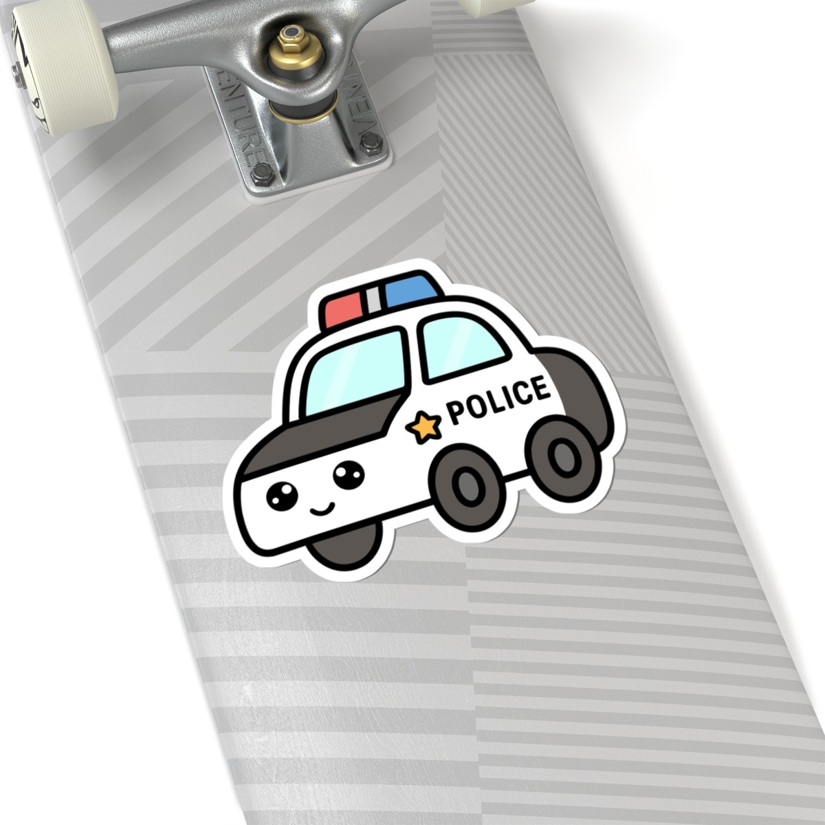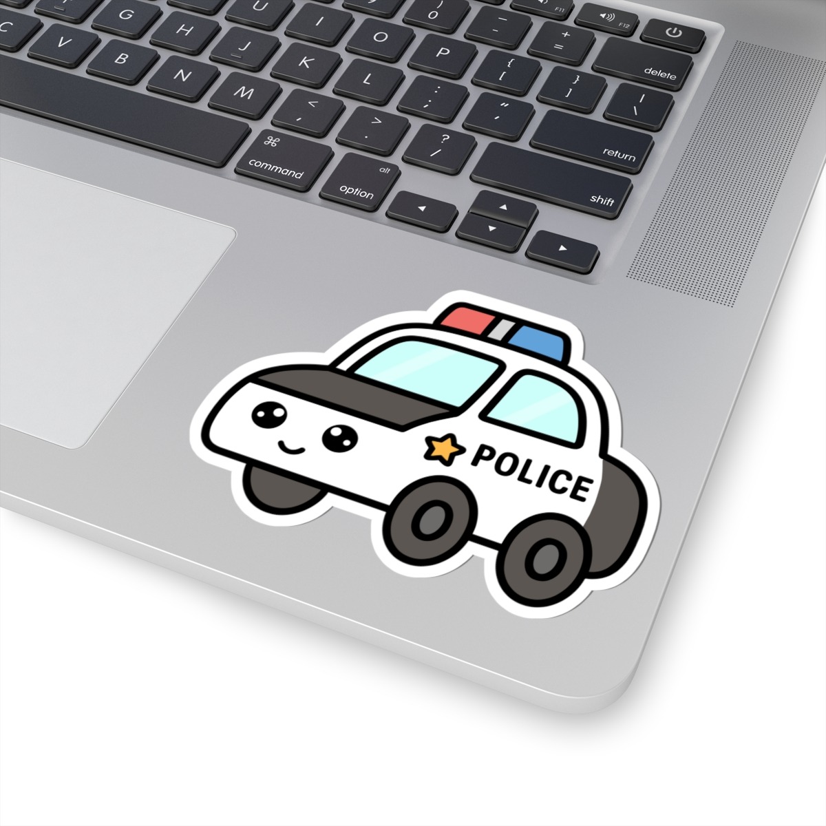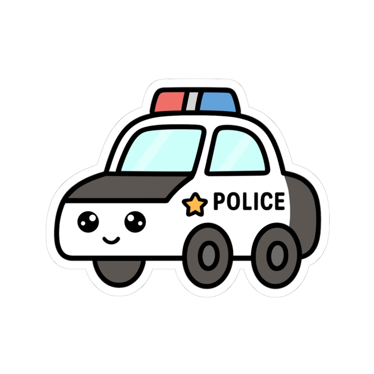Design appeal: Features a kawaii-style police car in classic black and white, with bright red and blue lights flashing on top, shiny wheels, big sparkling eyes, and a confident grin, radiating pure emergency vehicle cuteness and hero vibes.