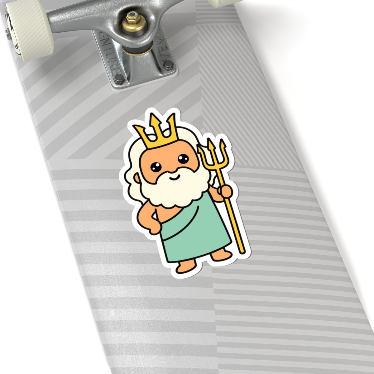 - Wave-making and wonderful – Features a kawaii-style Poseidon with a flowing teal beard, golden crown, and tiny trident — all wrapped in a smile that says “I've got this ocean handled.”