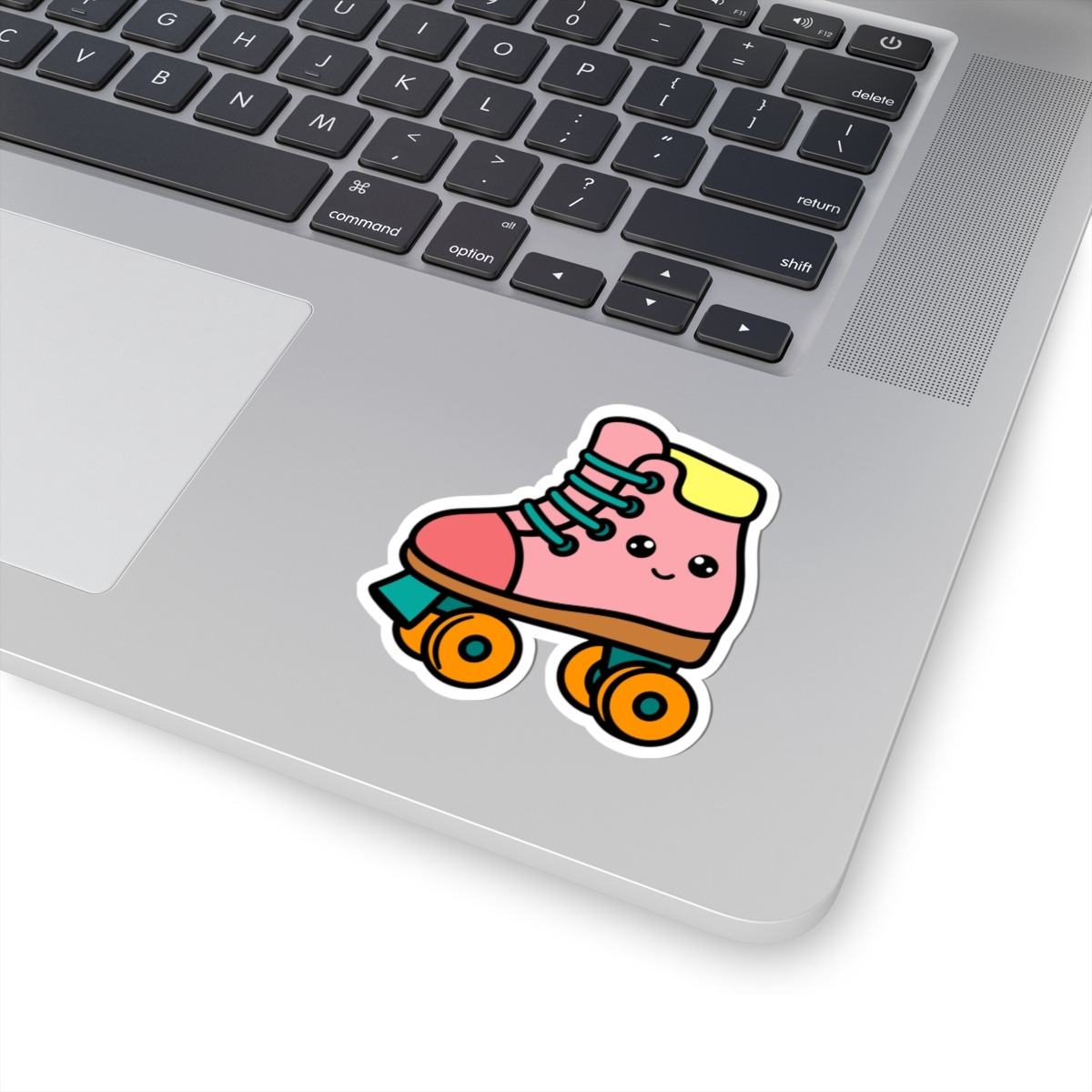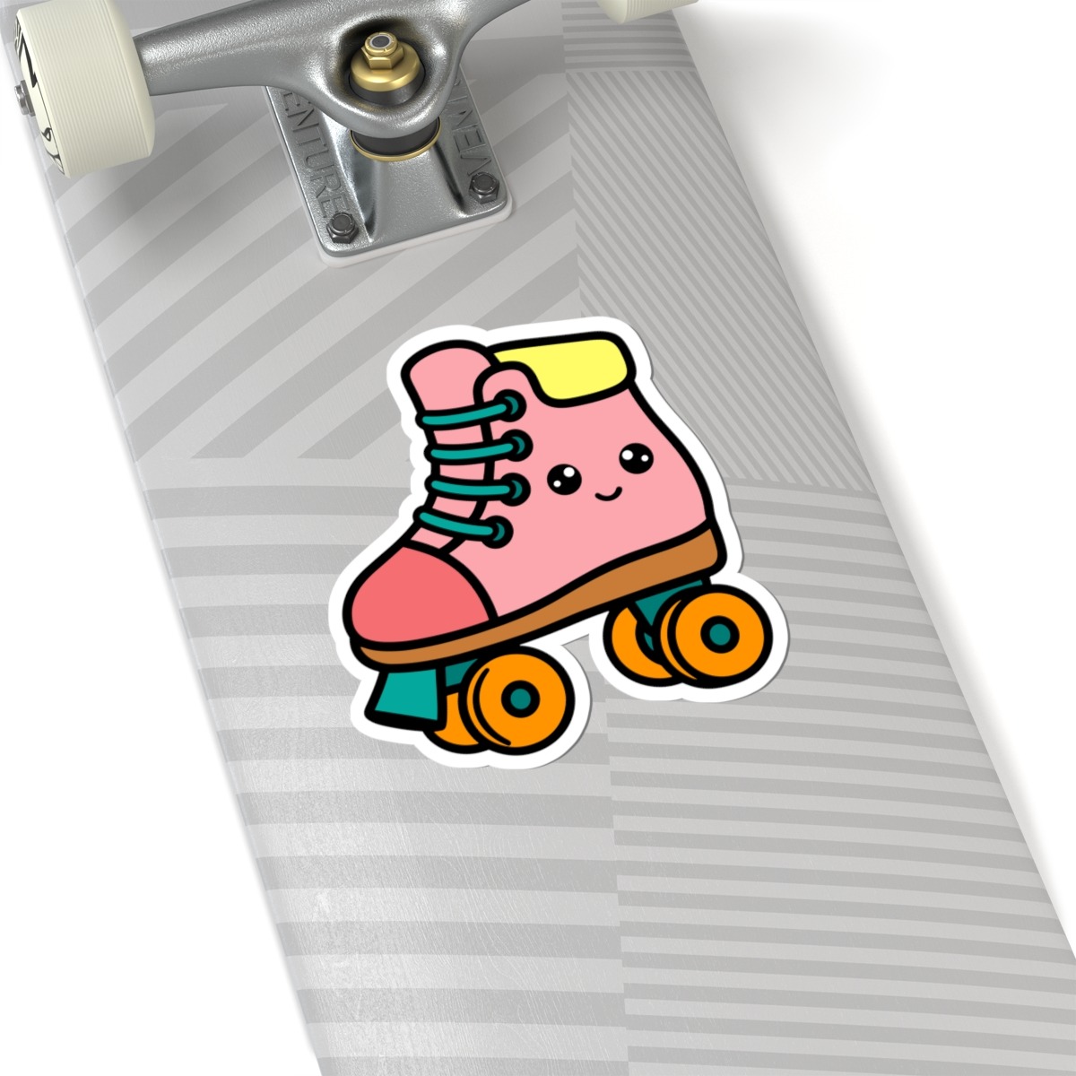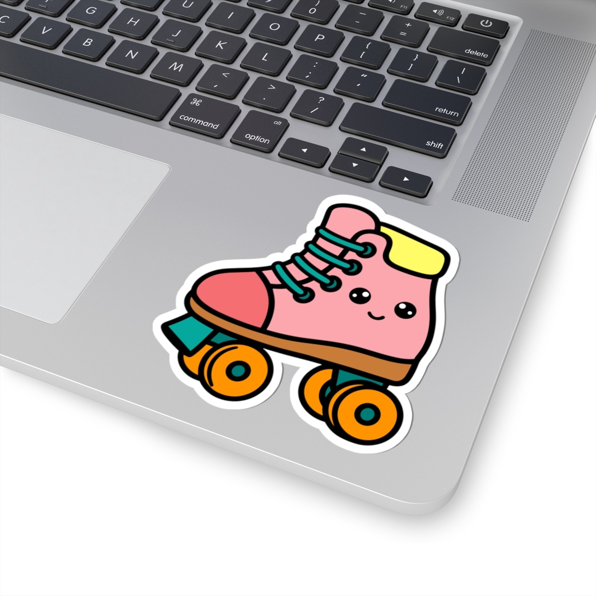 Design appeal: Features a kawaii-style retro rollerskate with a bright pink boot, chunky orange wheels, big sparkling eyes, and a joyful grin, radiating pure 80s fun and roller-disco energy.