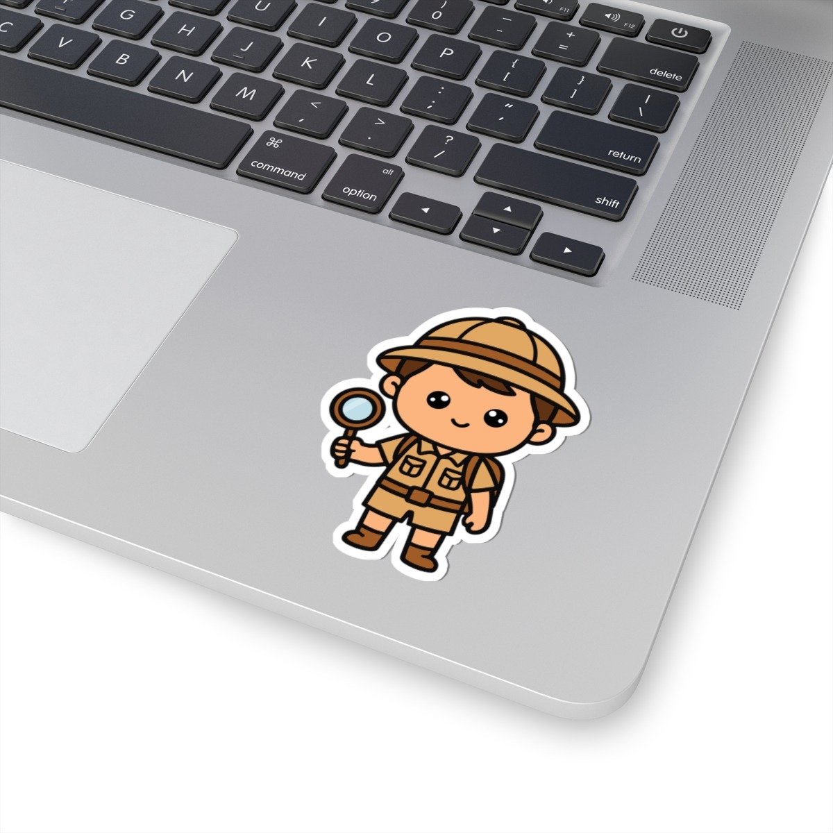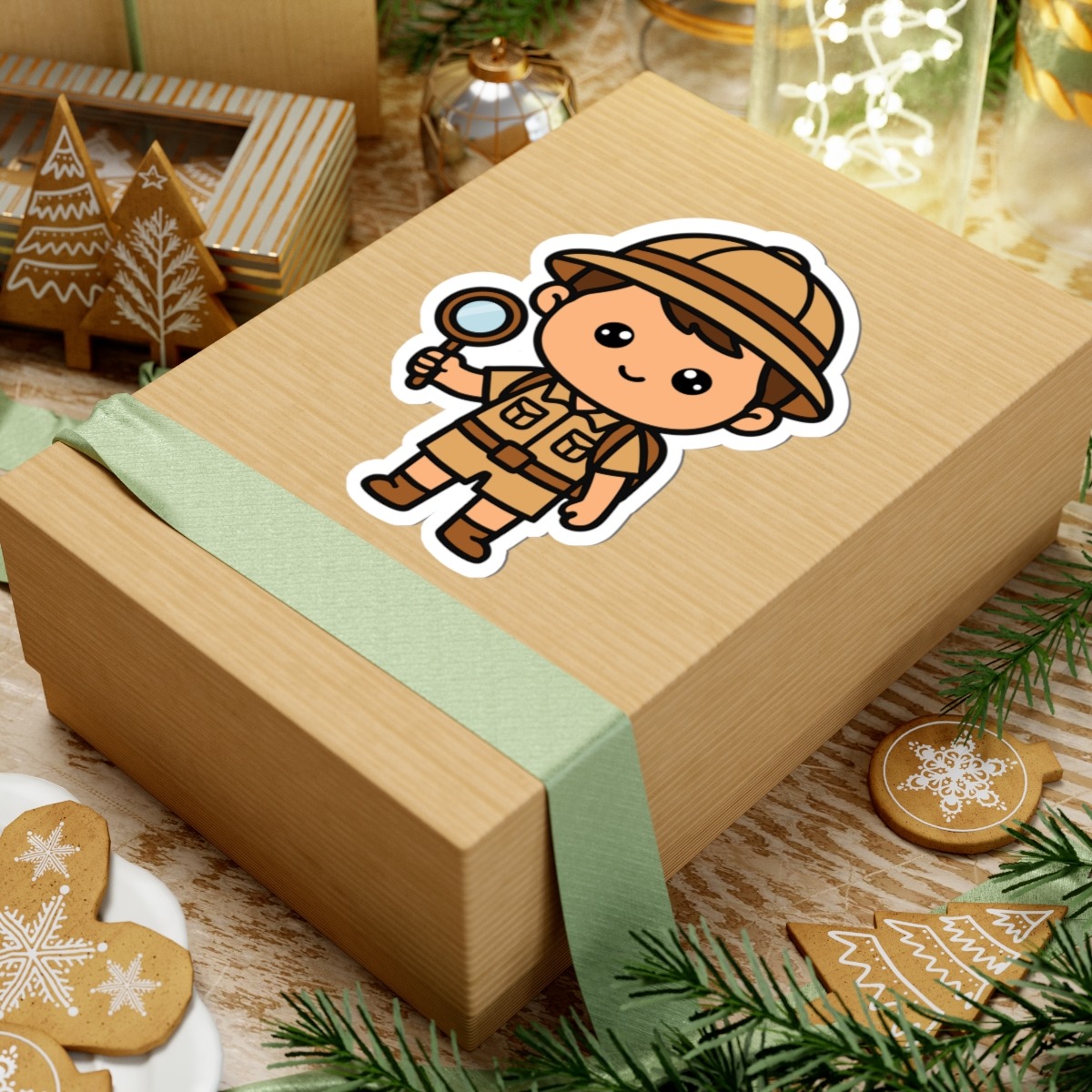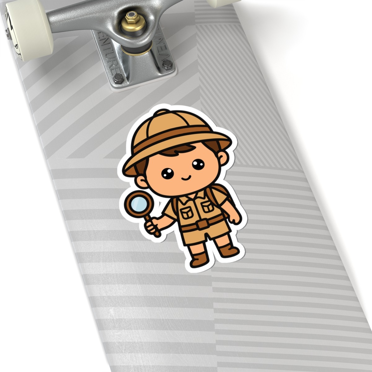 Curious and courageous – Features a kawaii-style explorer boy in a safari hat, khaki outfit, and magnifying glass in hand, ready to spot lions, elephants, or just a good time.