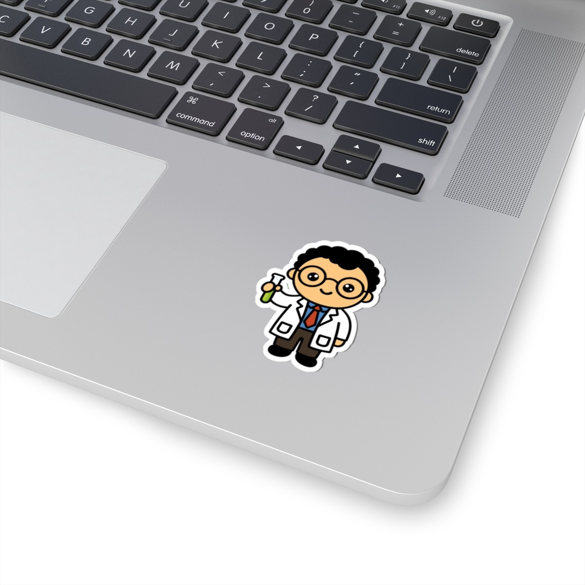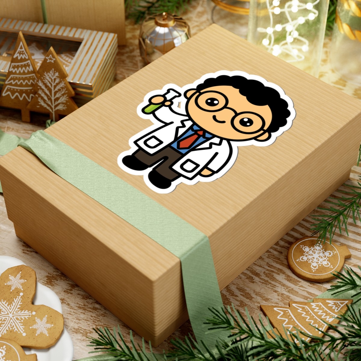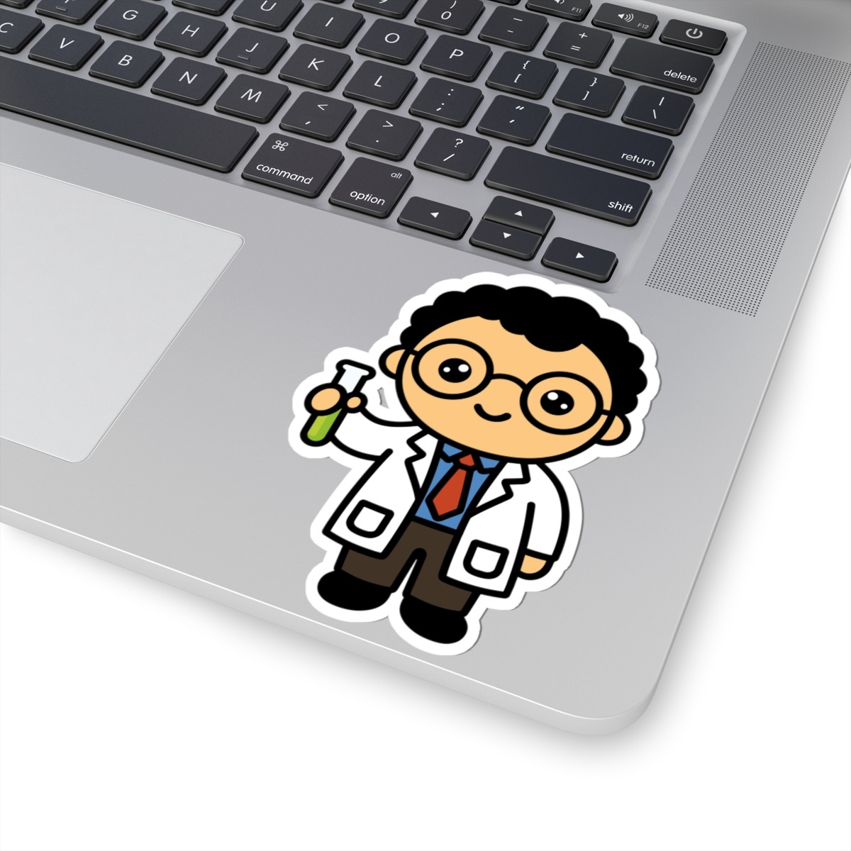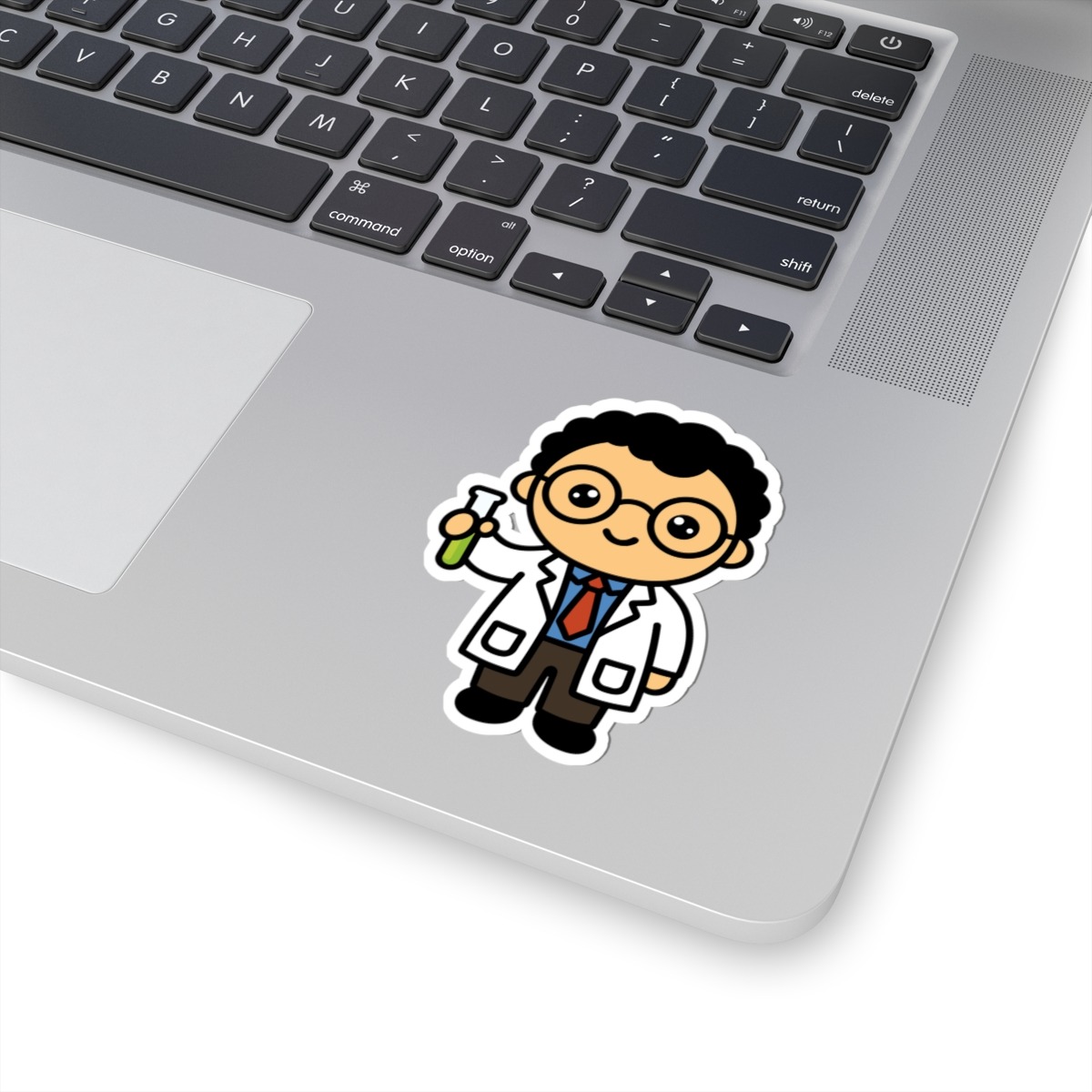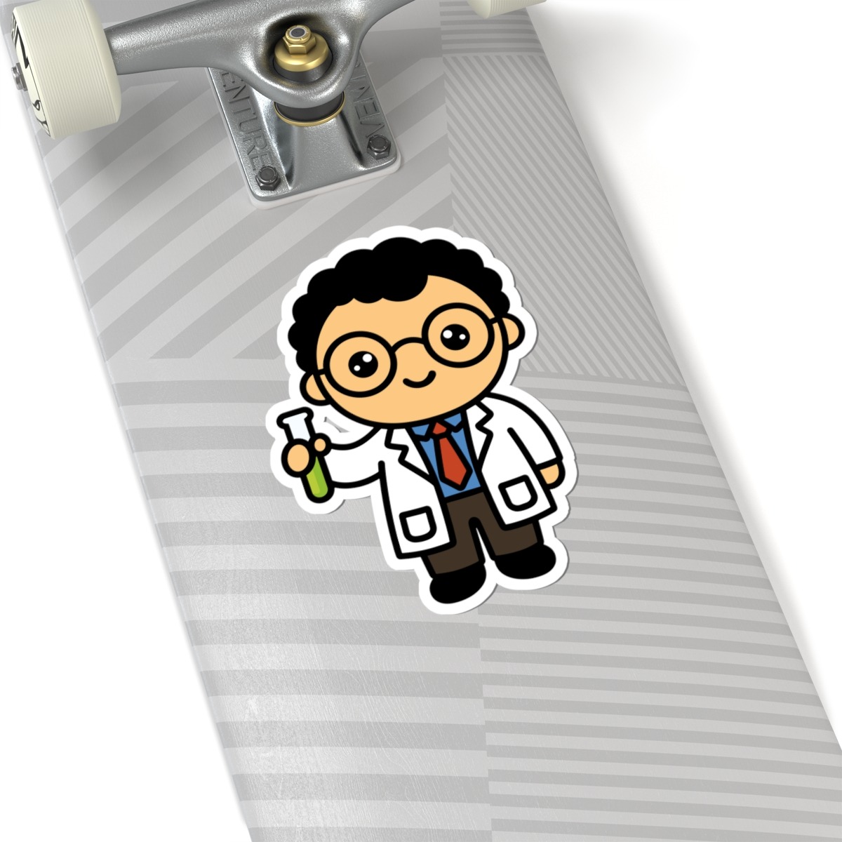 Bright and brainy – Features a kawaii-style scientist in a crisp white lab coat and glasses, holding a test tube with a proud and curious grin.