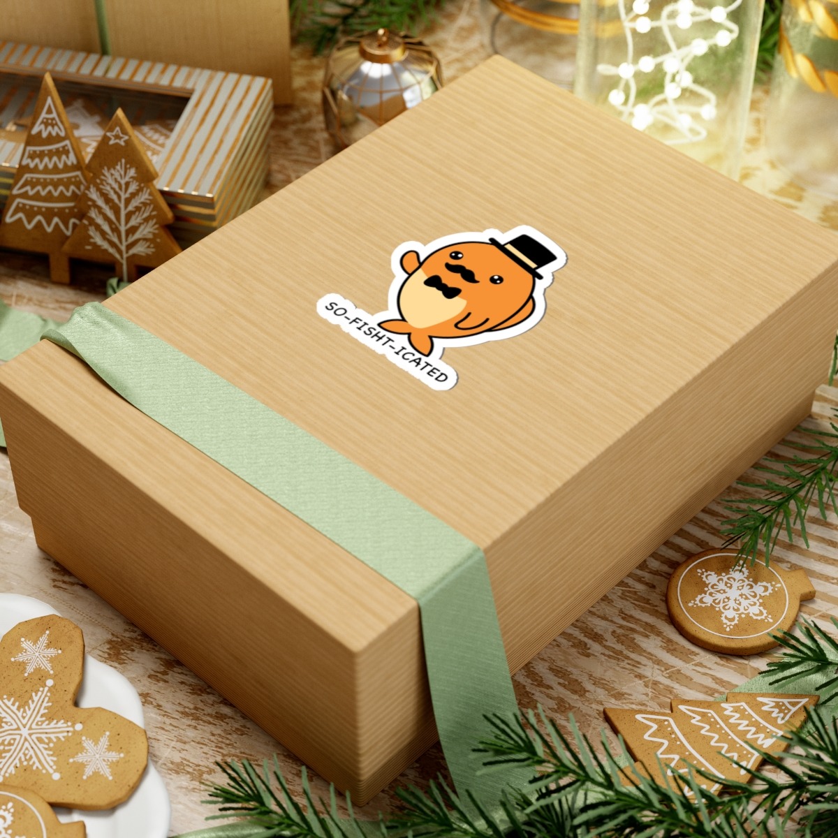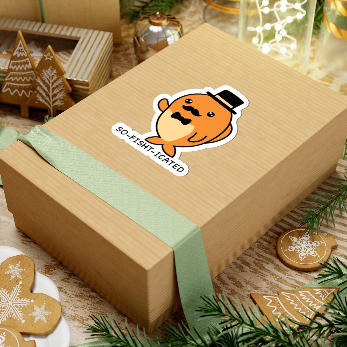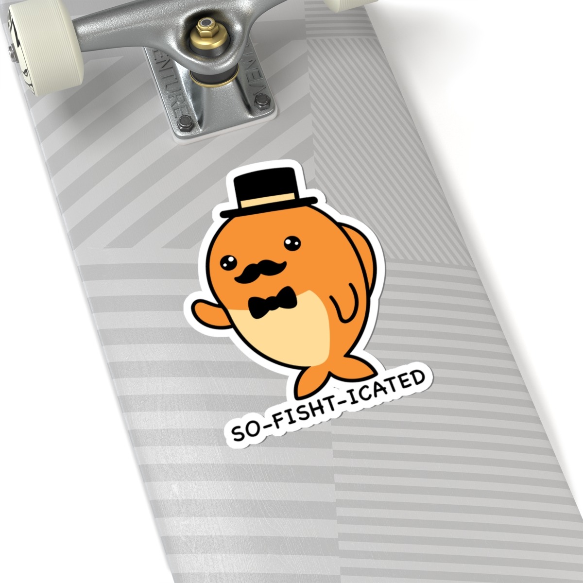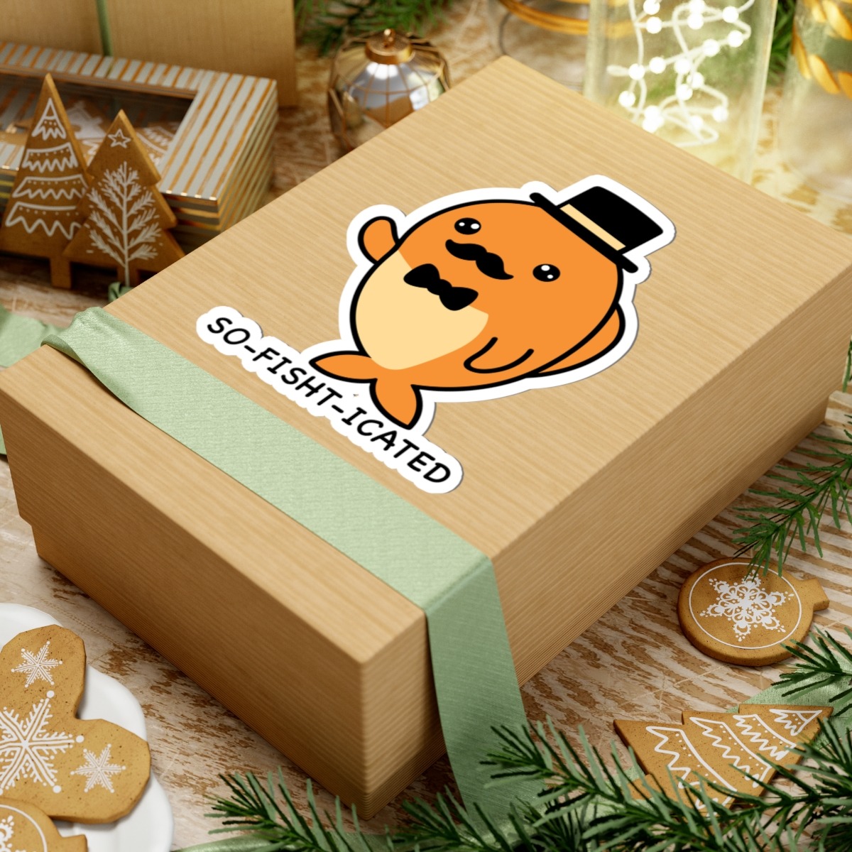 Design appeal: Features a kawaii-style fish sporting a sleek black top hat and a twirly mustache, with big sparkling eyes, paired with the punny phrase “So-Fish-Ticated” in playful lettering — it’s pure underwater sophistication and humor!